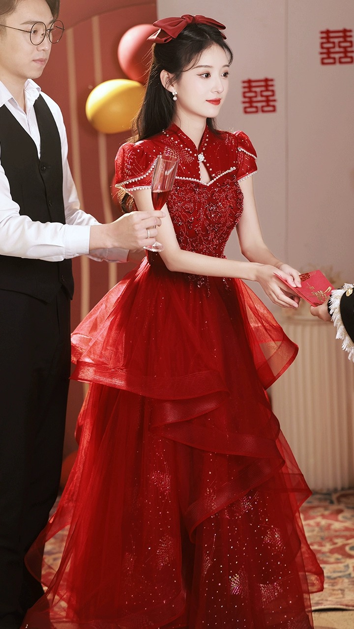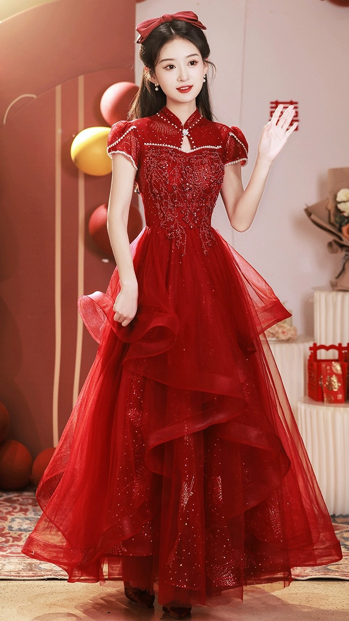 Gaun Qipao model baru 2025 gaun pengantin merah utama gaya mewah ringan gaun pertunangan Cina kelas atas untuk wanita