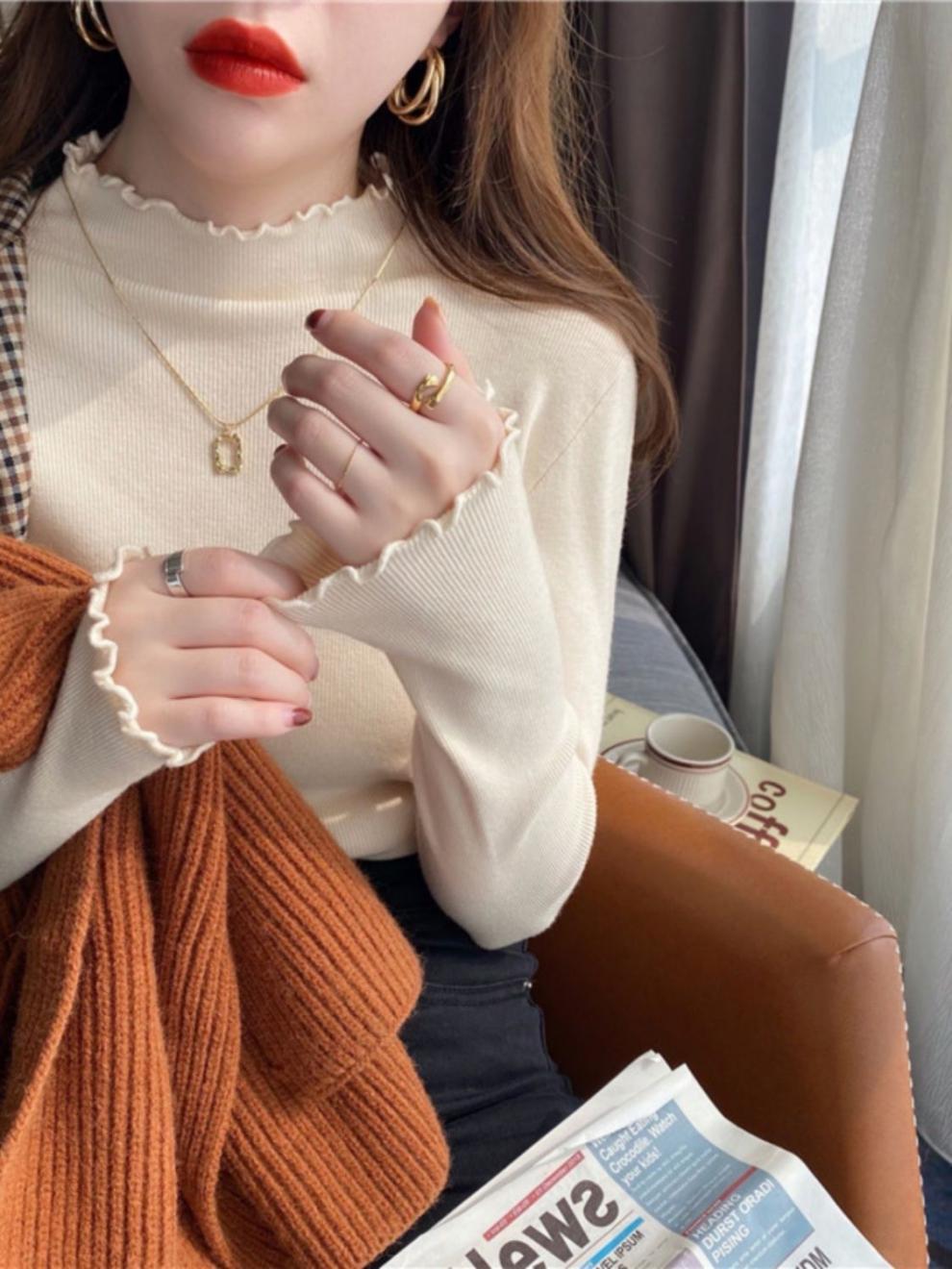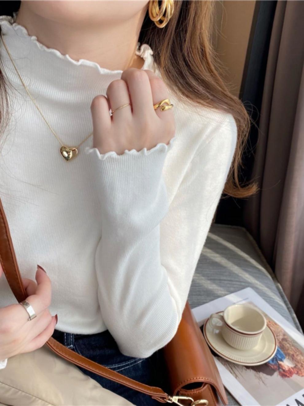 Atasan rajut slim-fit setengah turtleneck untuk wanita, musim gugur dan musim dingin 2025, kemeja dasar dengan tepi berlipit, pakaian dalam pelangsing, atasan lengan panjang dengan bahu reguler.