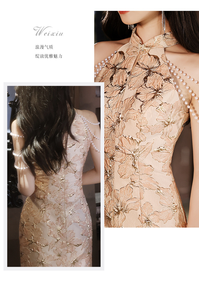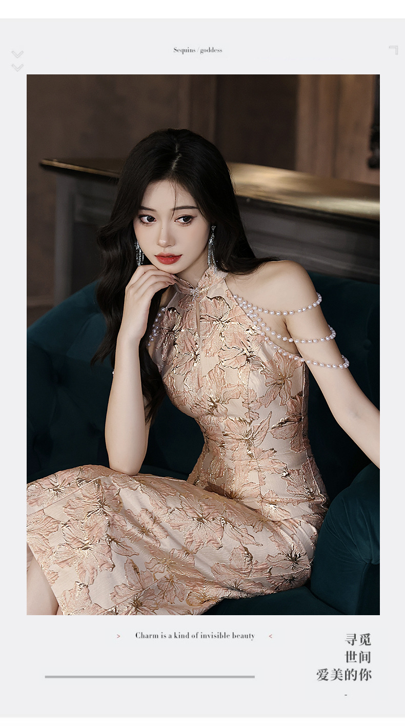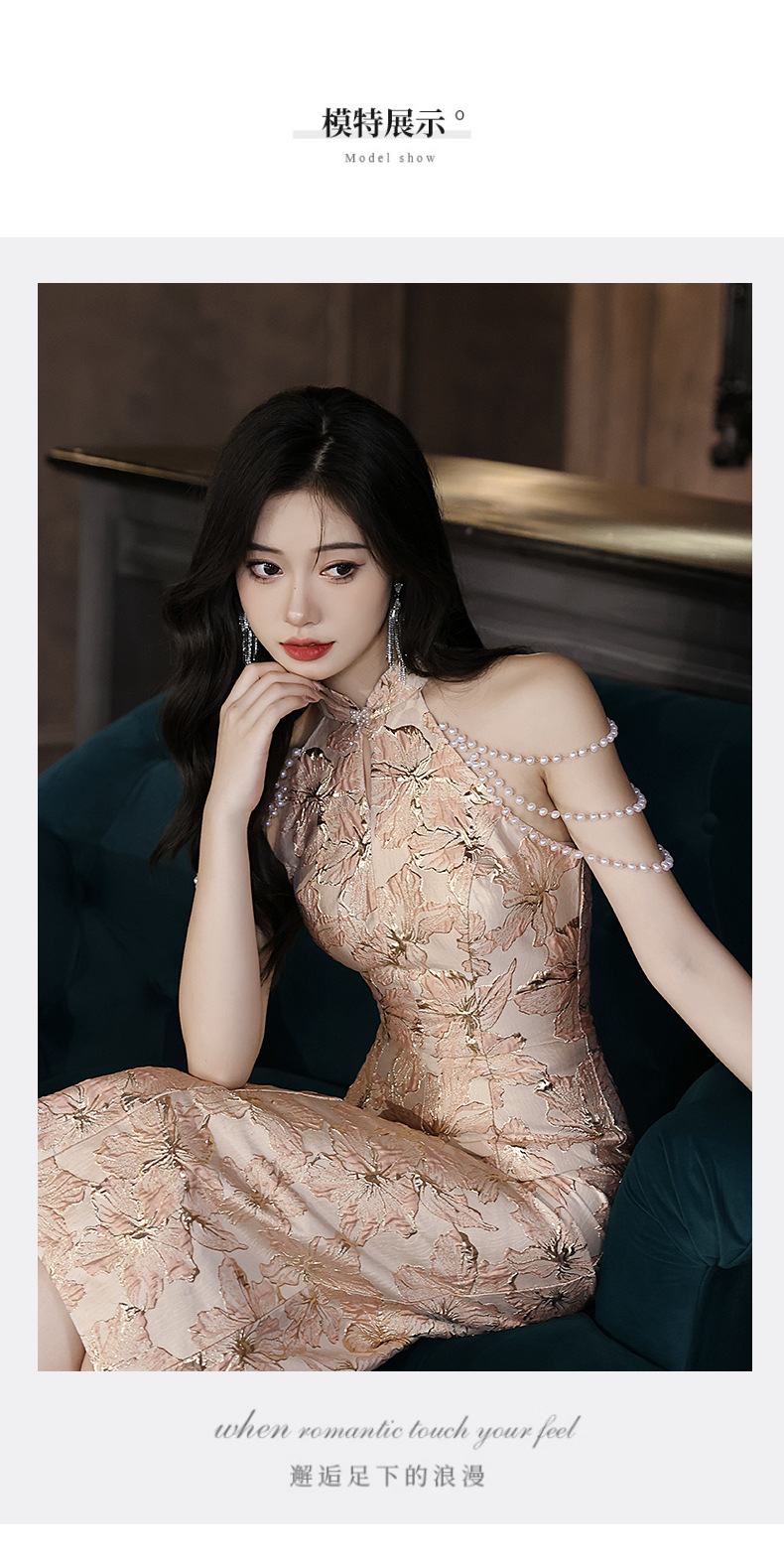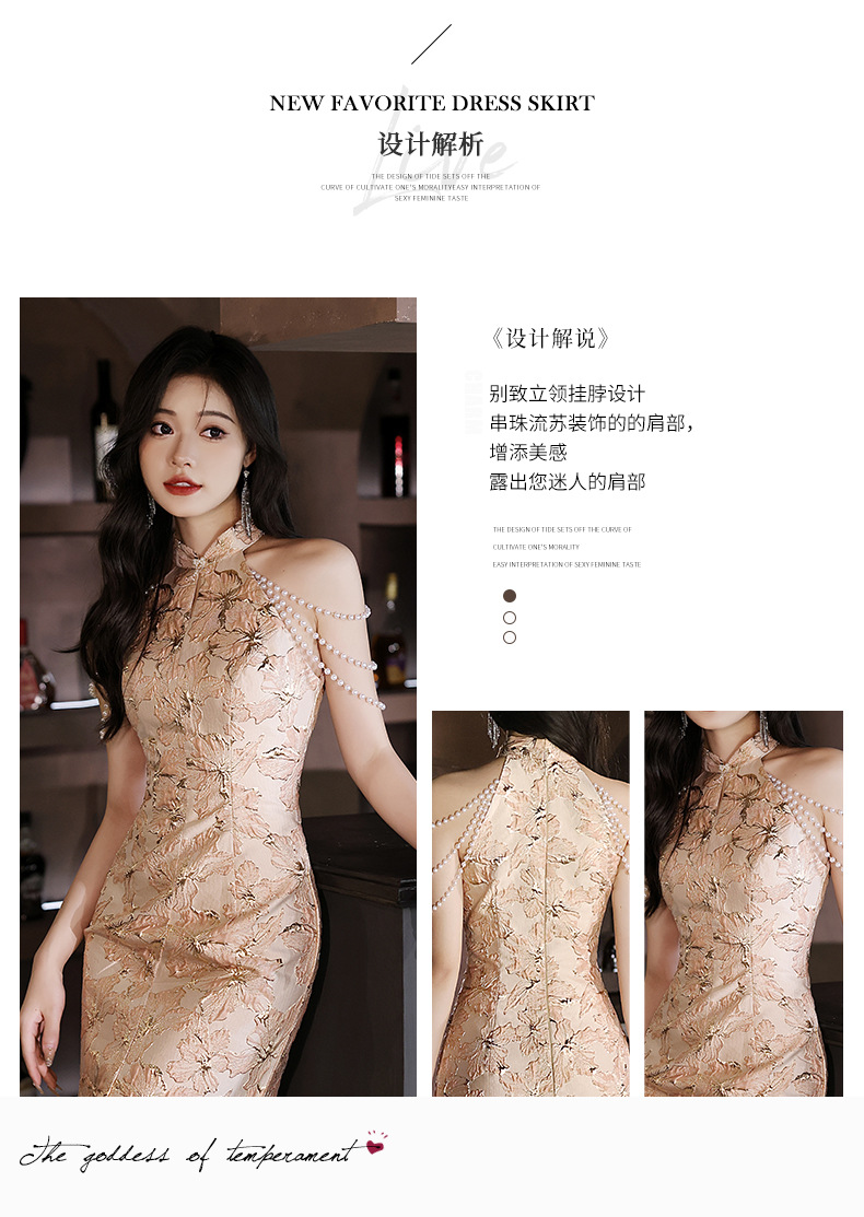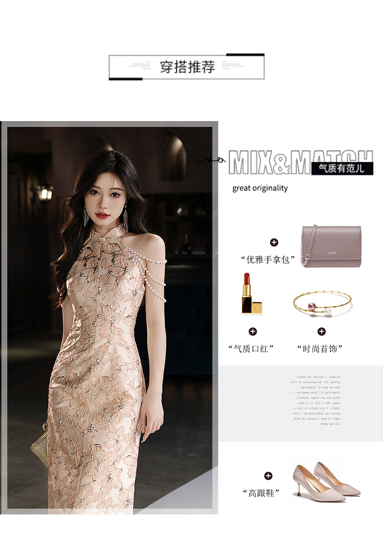Gaun pesta malam untuk wanita 2026 gaya baru elegan, model halter neck, sosialita, gaya Cina baru, gaun cheongsam untuk acara pertunangan