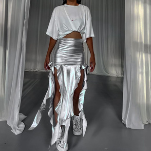 AB327 欧美爆款飘带流苏反光PU鱼尾裙微弹不规则裙半身裙时尚裙子