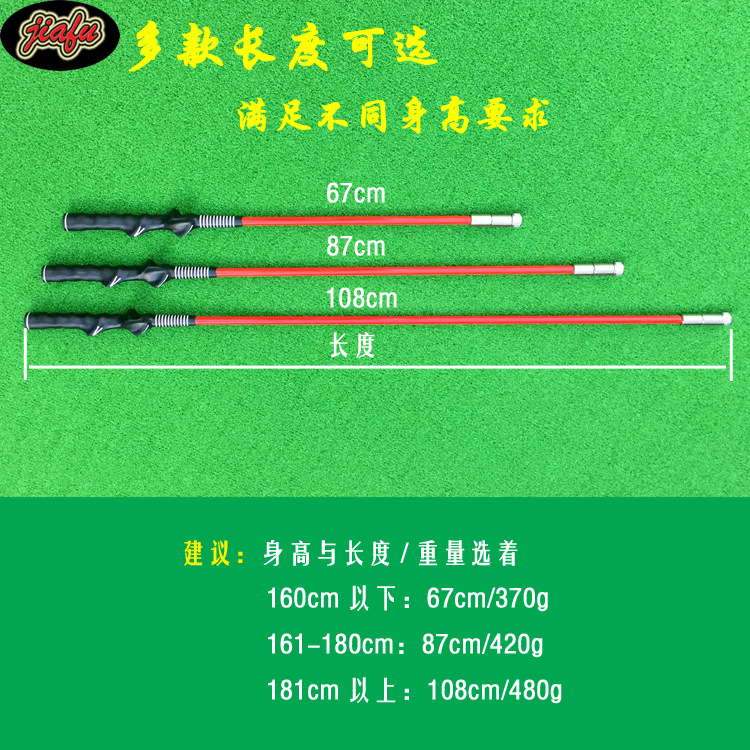简述:手型橡胶握把手感好易抓牢,强韧不易断纤维杆身时尚多色可选,优质不锈钢杆头耐用无比,重量自由调节。适合初学者挥杆动作练习、高尔夫爱好者锻炼学习、教练用品,还可做防身棍。
