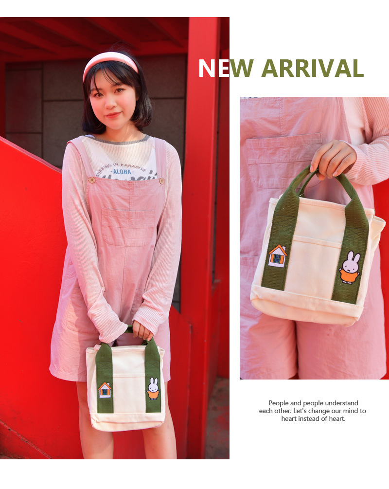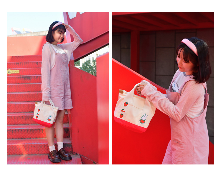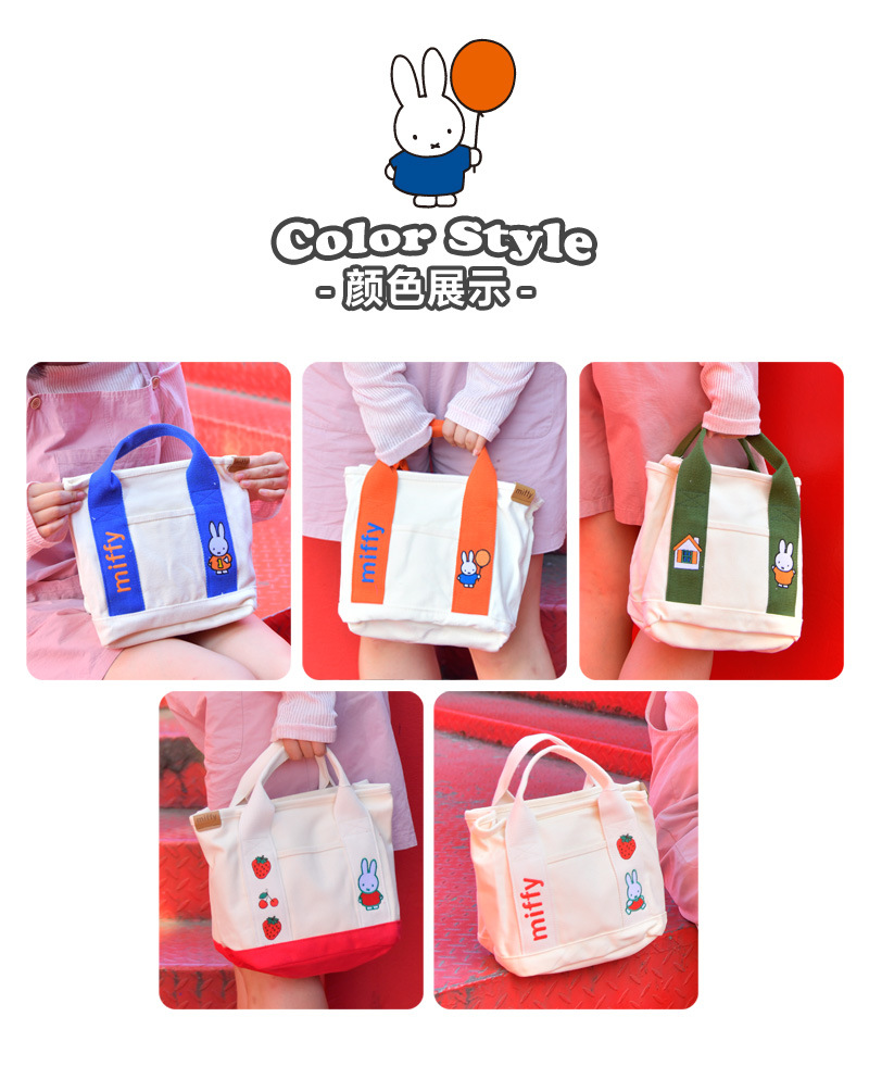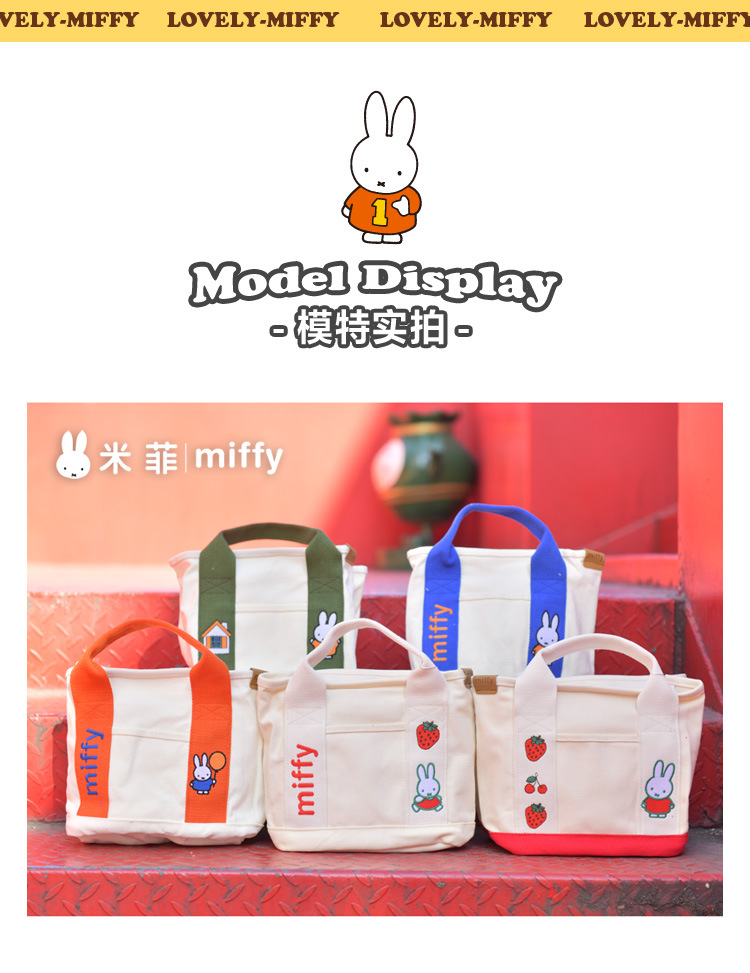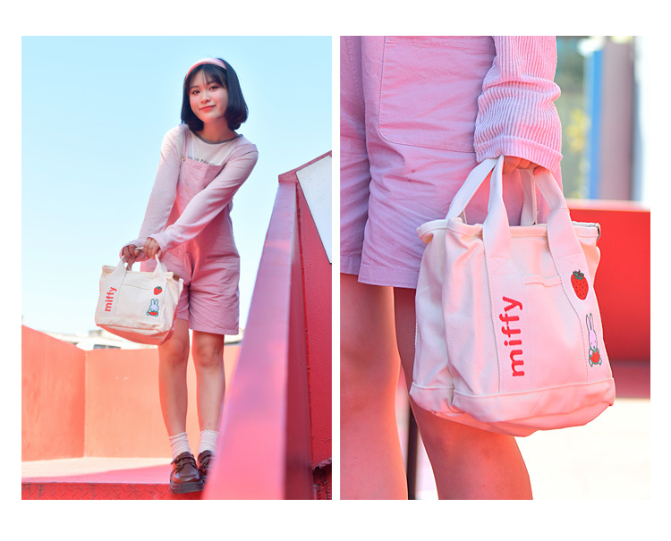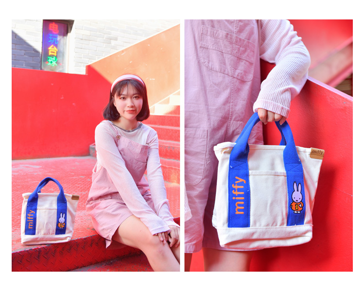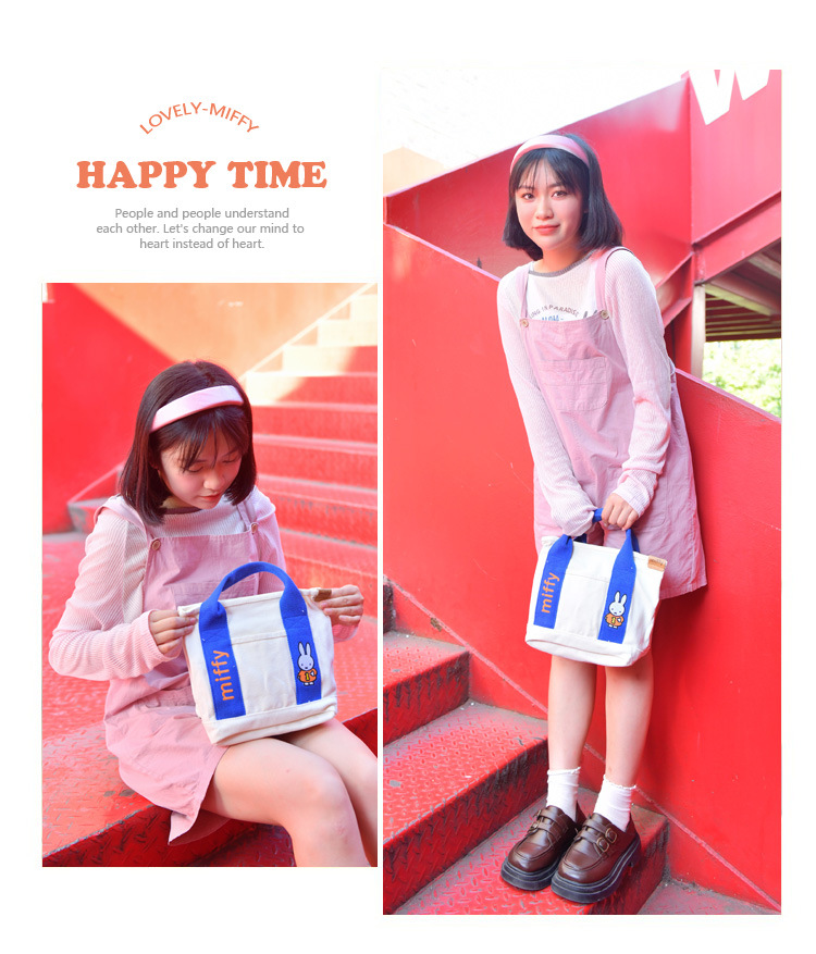 Barang Asli Miffy Miffy kelinci bordir ritsleting lucu Jepang dengan kompartemen tas tangan kanvas tas kotak makan siang bento