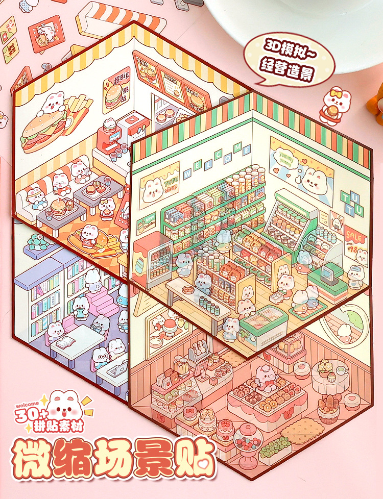 Koleksi Stiker Pemandangan Miniatur Tiga Dimensi Pondok Gaya Korea Stiker Adegan Penumpukan 3D Stiker Bahan Pengurai Swakarya Buatan Tangan