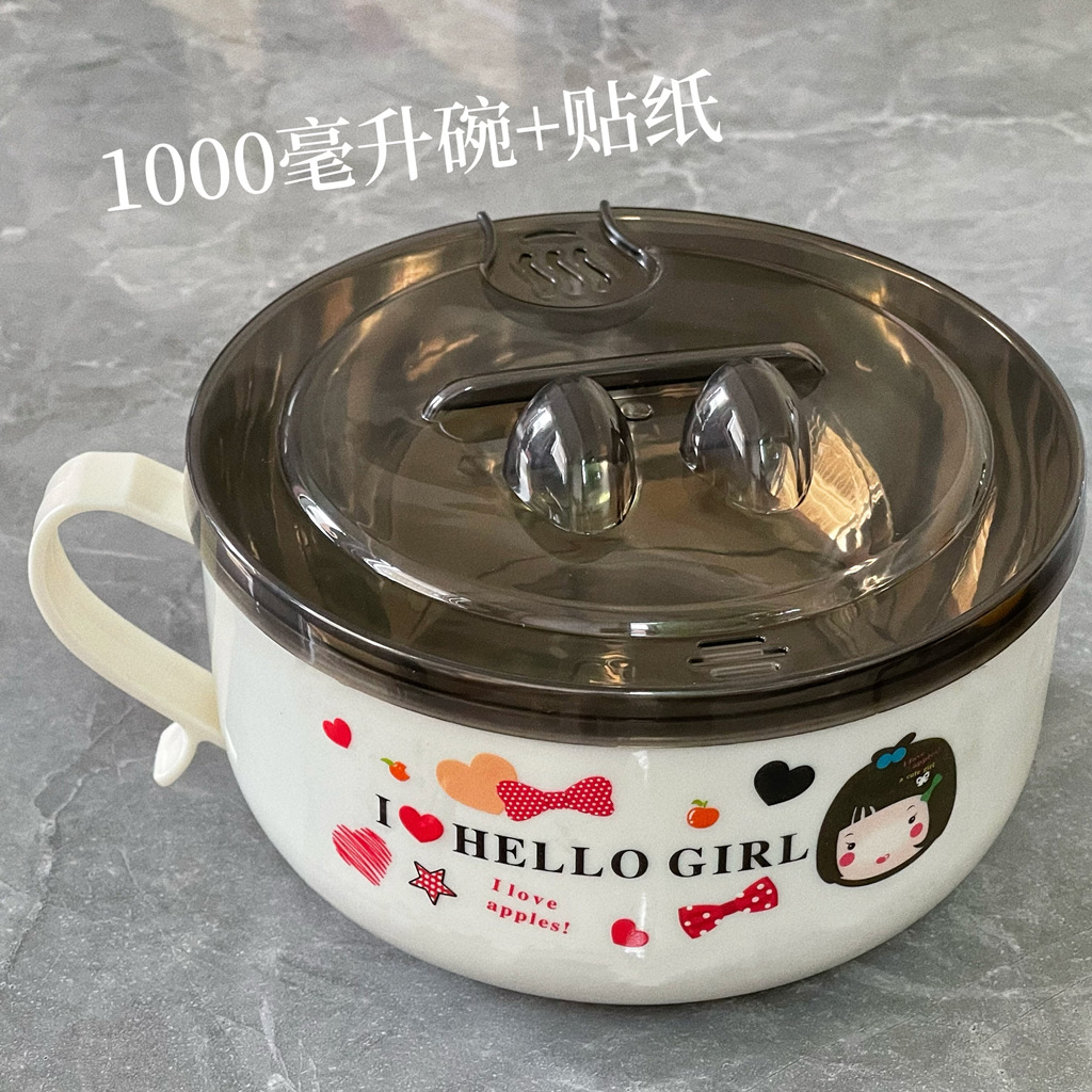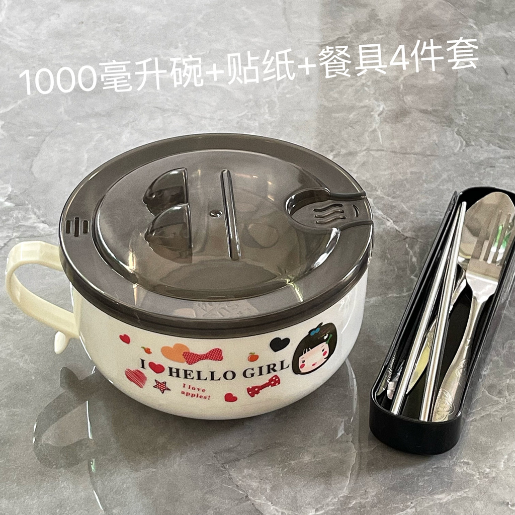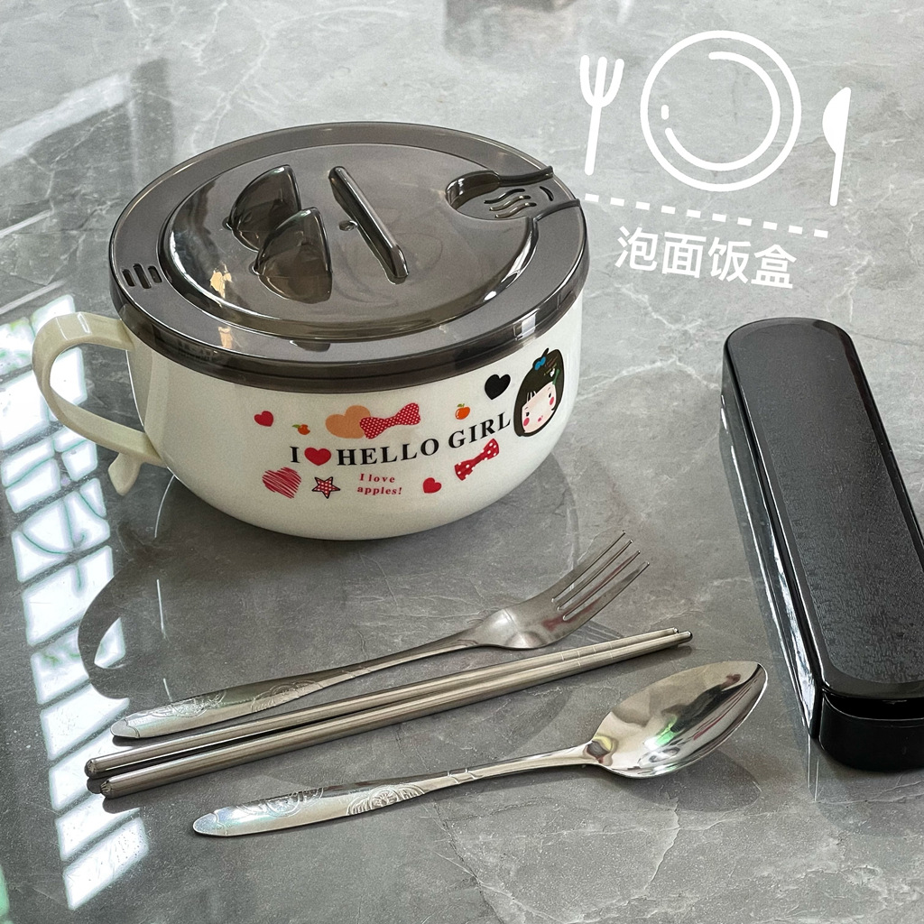 Mangkuk mie instan baja tahan karat dengan tutup, kotak makan siang mangkuk sup besar siswa wanita asrama mangkuk sumpit setelan kotak makan siang Jepang dewasa