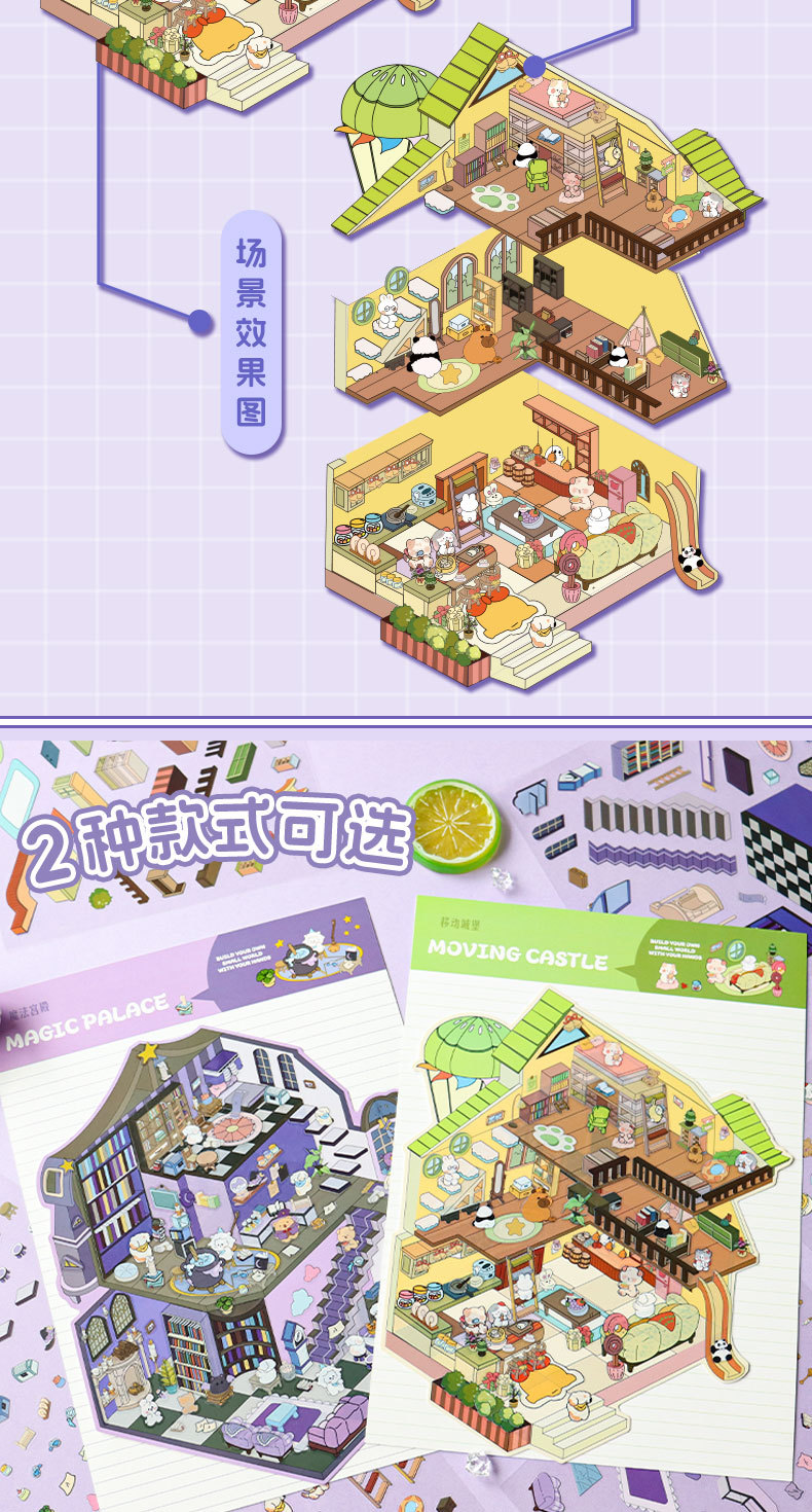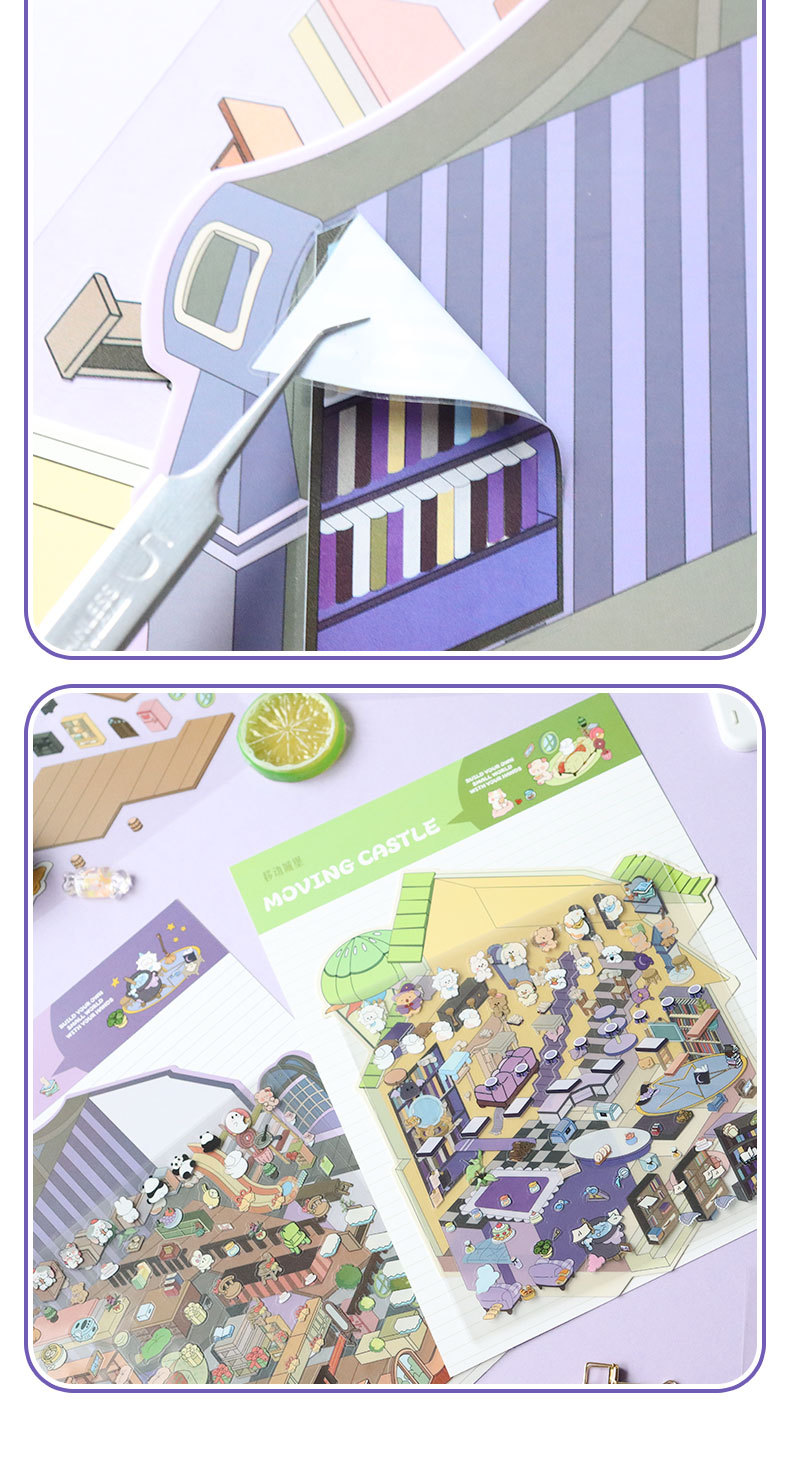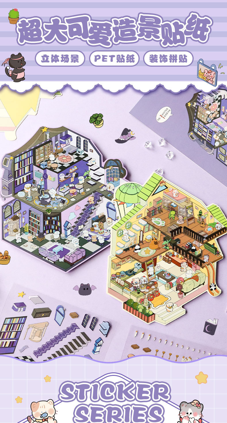 Stiker Pondok Lansekap Ukuran Besar Stiker 3D Visual Kartun Lucu Tumpukan Adegan Miniatur Tanpa Cukur Anak-anak