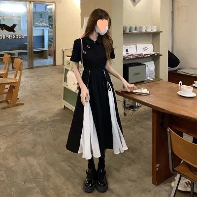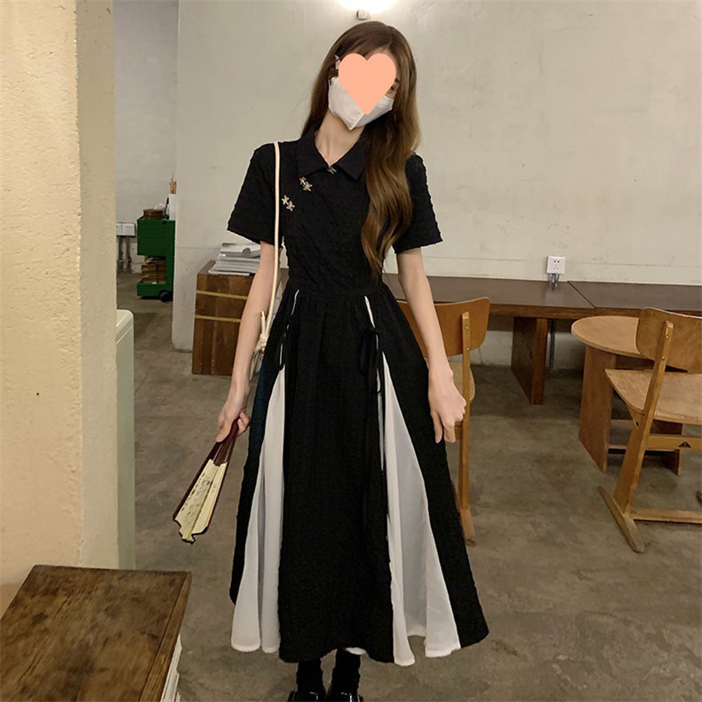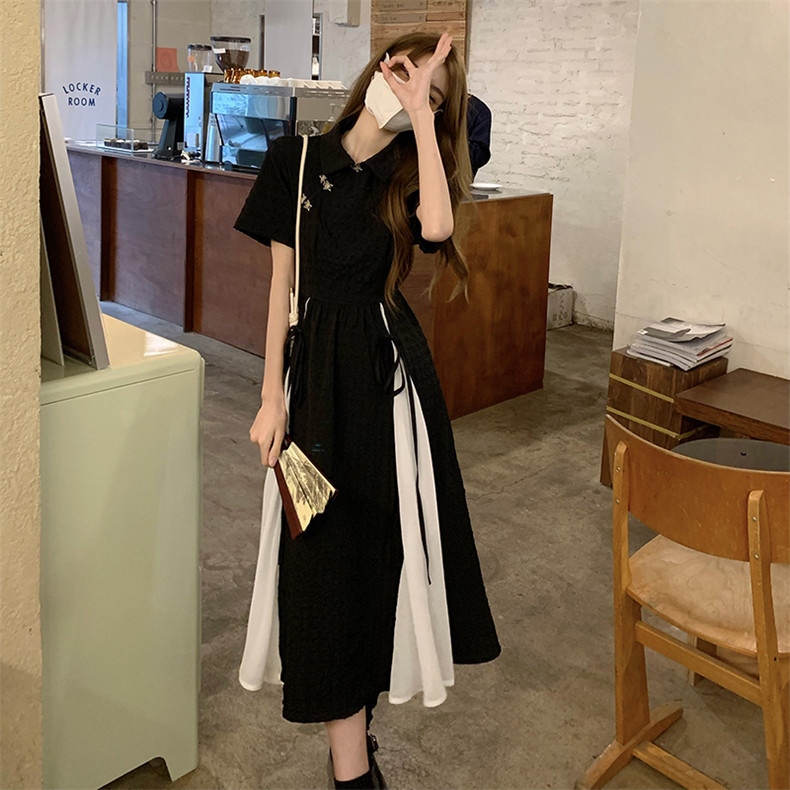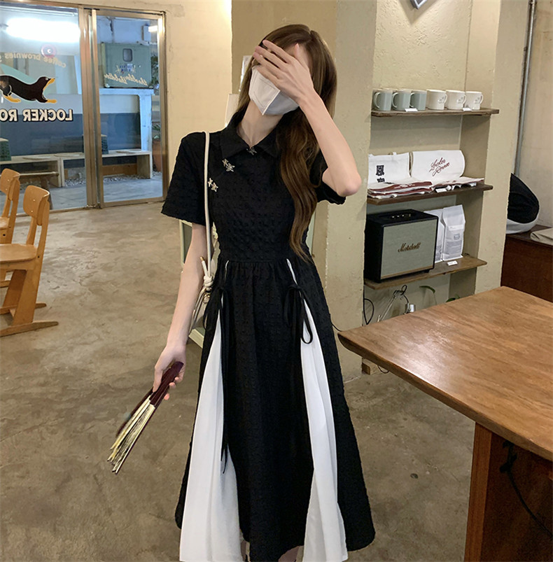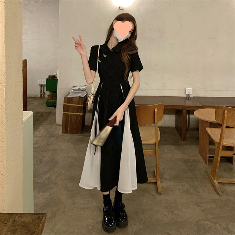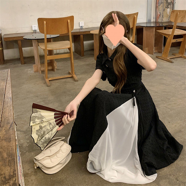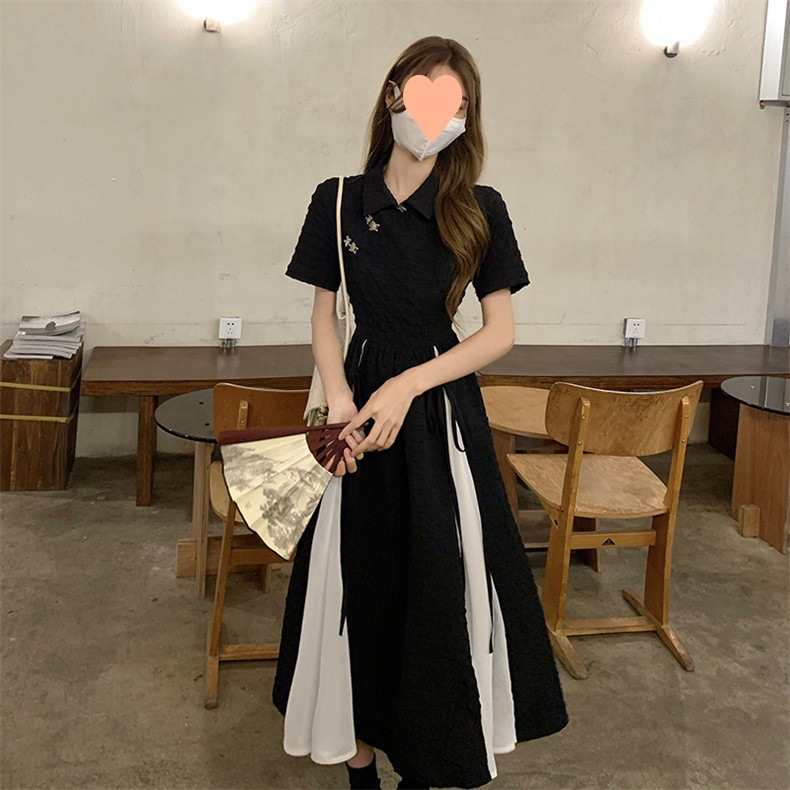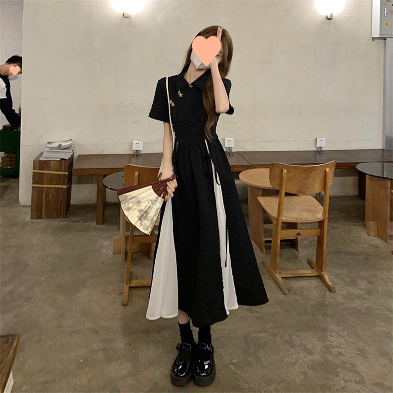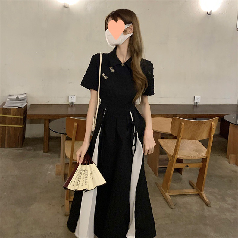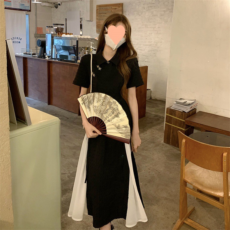Gaun hitam gaya Prancis untuk istirahat teh cheongsam yang diperbaiki rok panjang mungil 2025 pakaian wanita baru musim semi dan musim panas.