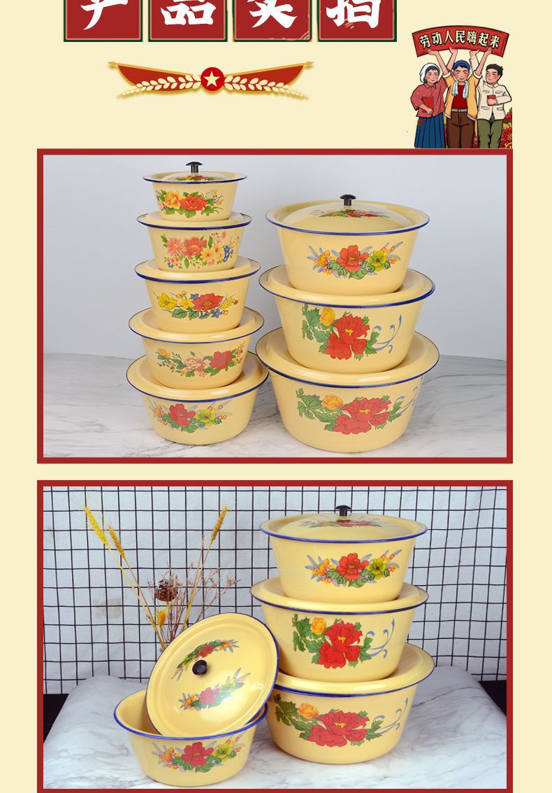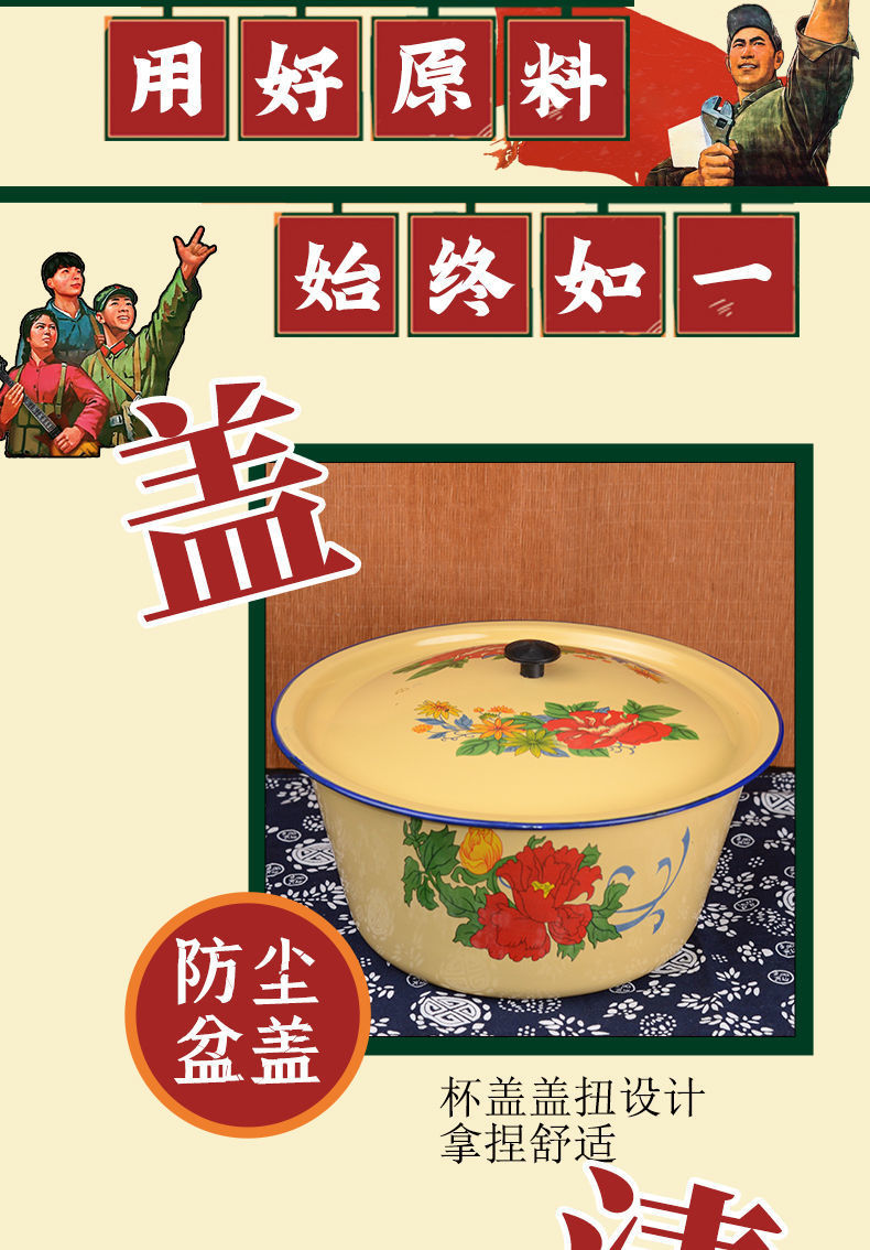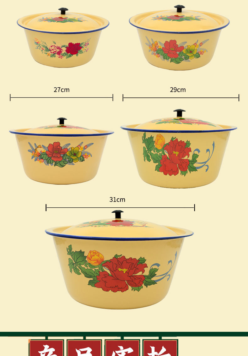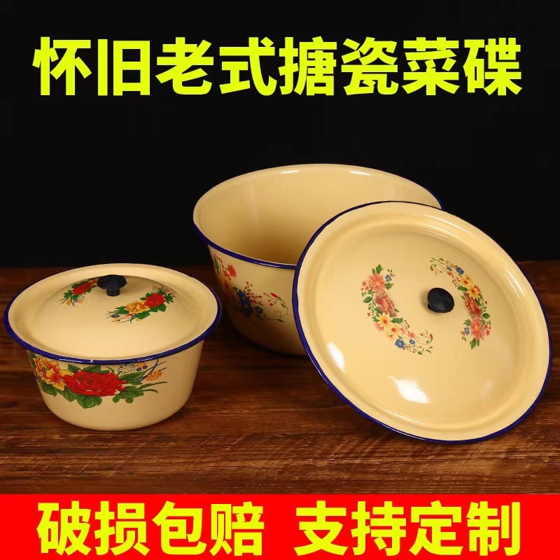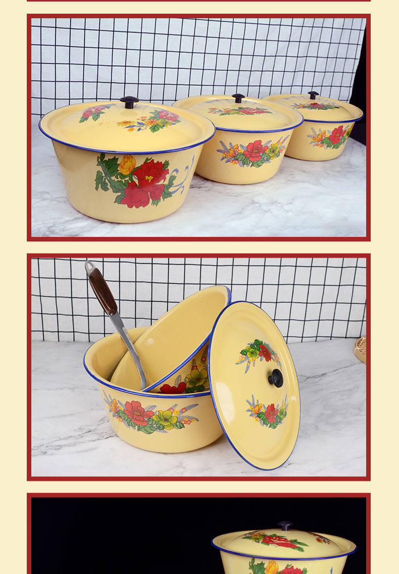 Mangkuk enamel bergaya antik dengan tutup, mangkuk menjaga kesegaran kue, panci sup tempat pangsit dan tali mie, baskom obat rebus