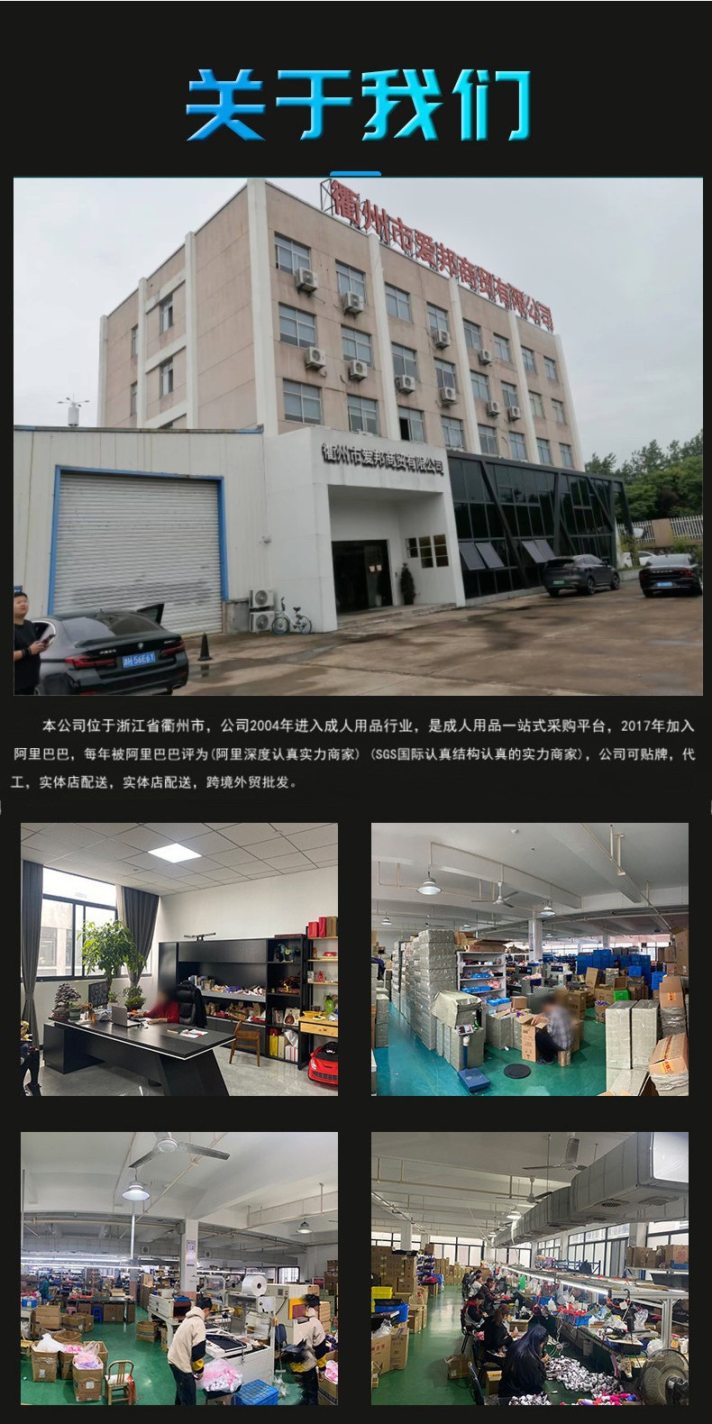 本公司位于浙江省衢州市,公司2004年进入成人用品行业,是成人用品一站式采购平台,2017年加入阿里巴巴,每年被阿里巴巴评为(阿里深度认证实力商家) (SGS国际认证机构认证的实力商家),公司旗下品牌有俏娇妃,FENG HUOYOU风火油,GOK等品牌,公司可贴牌,代工,实体店配送,跨境外贸批发,一件代发 ,专为批发商,零售商供应各类成人用品,我们供应的类目有:成人用品.性用品.充气娃娃.男用喷剂,半实体娃娃.全硅胶度仿真娃娃.夫妻情趣用品.润滑油.避孕套.跳蛋.男用自慰器.女用自慰器.器具转珠棒.仿真阳具等等!