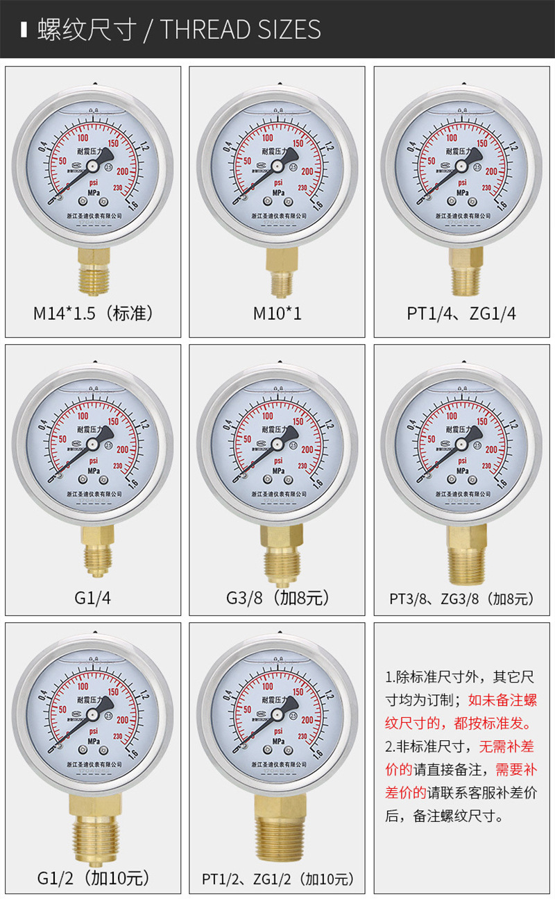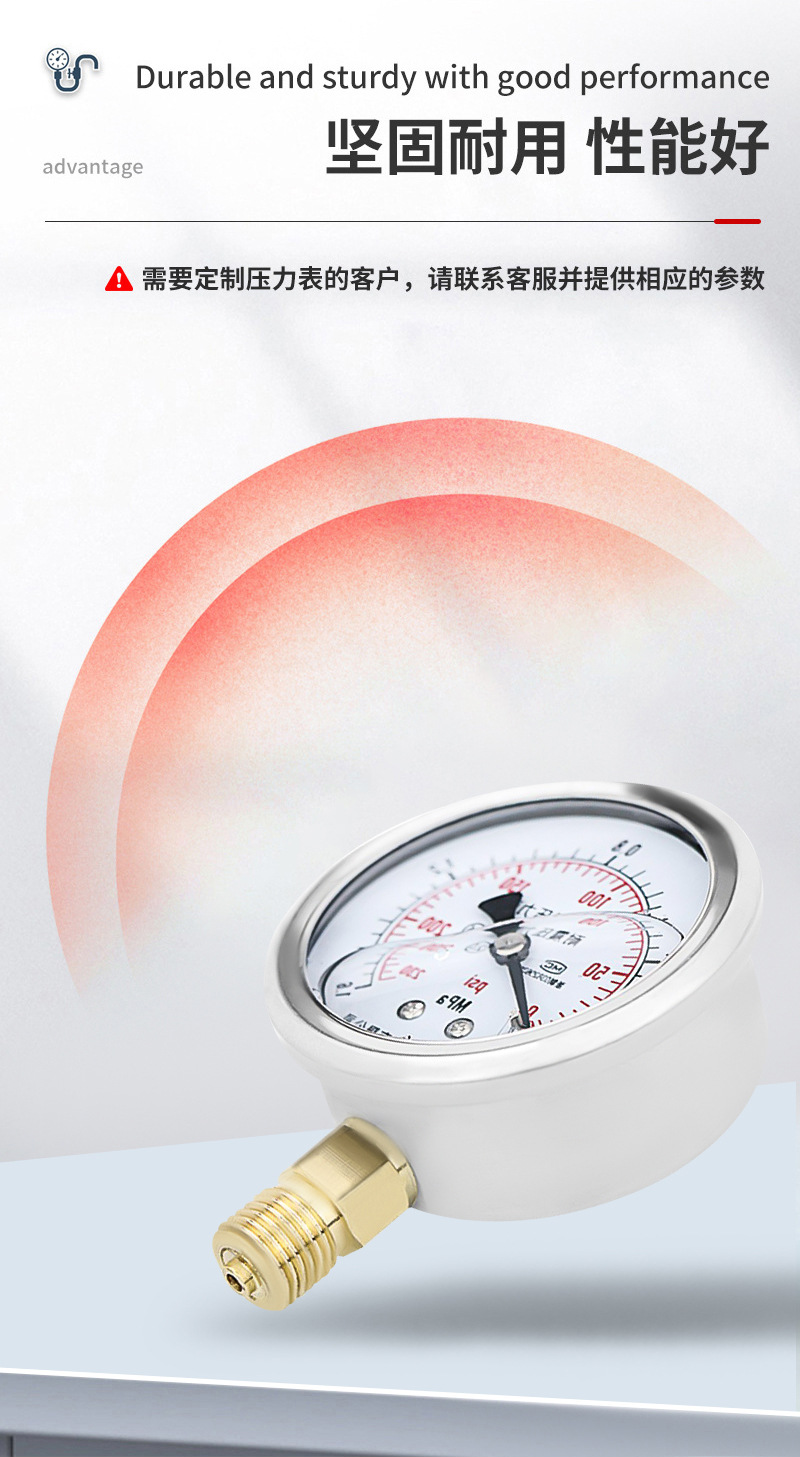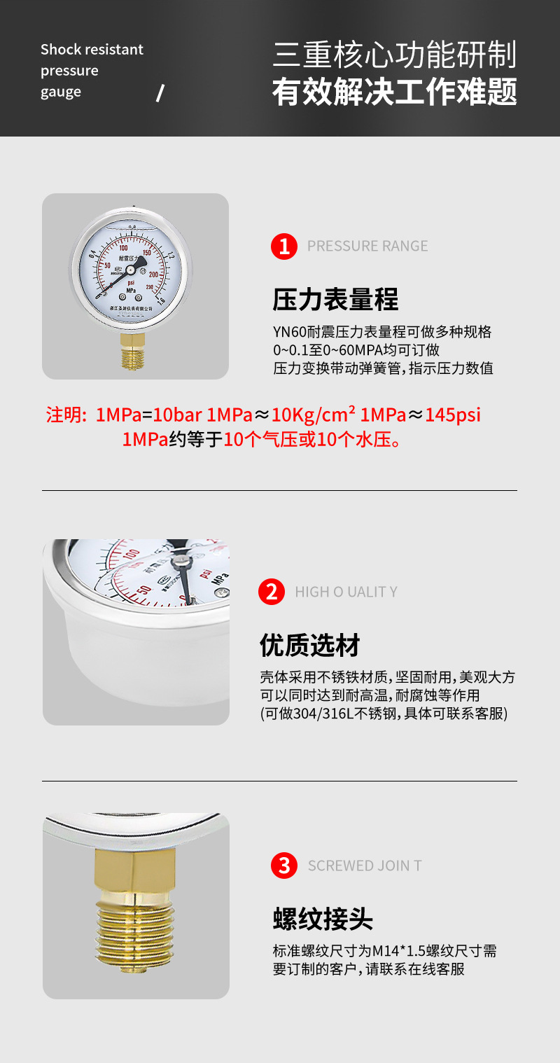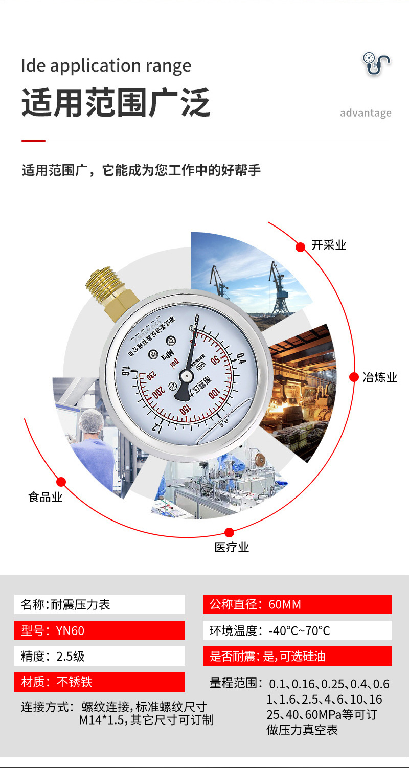 Pasokan pengukur tekanan YN60 presisi tinggi baja tahan karat untuk tekanan air, tekanan oli m14*1.5, pengukur tekanan udara tahan guncangan