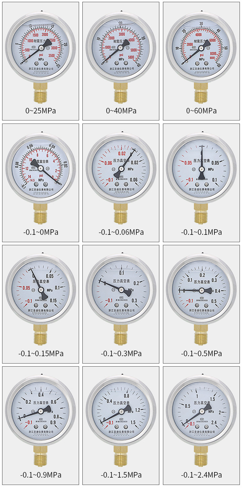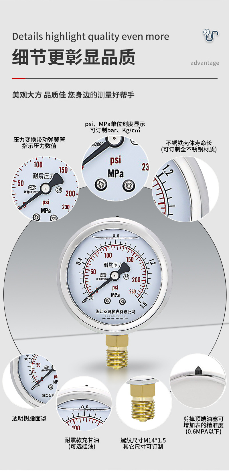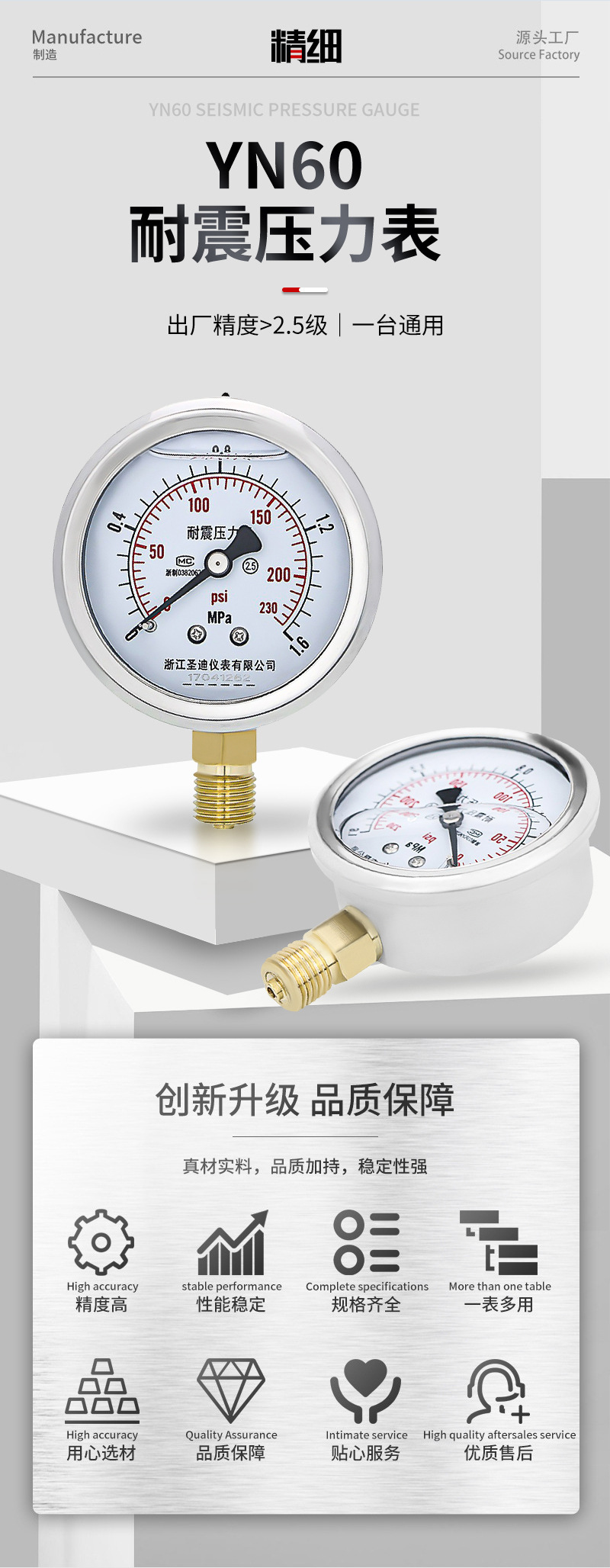 Pasokan pengukur tekanan YN60 presisi tinggi baja tahan karat untuk tekanan air, tekanan oli m14*1.5, pengukur tekanan udara tahan guncangan