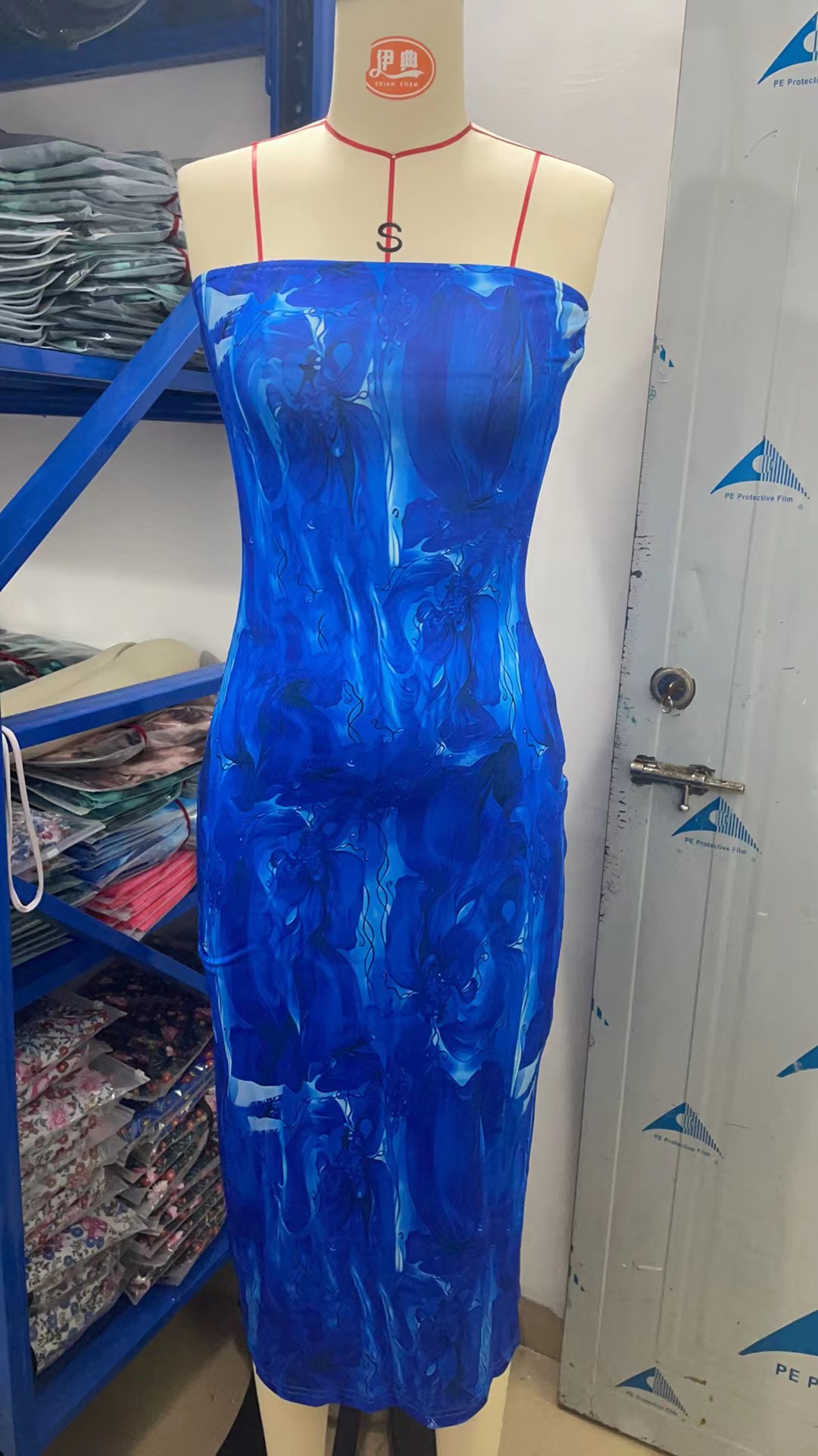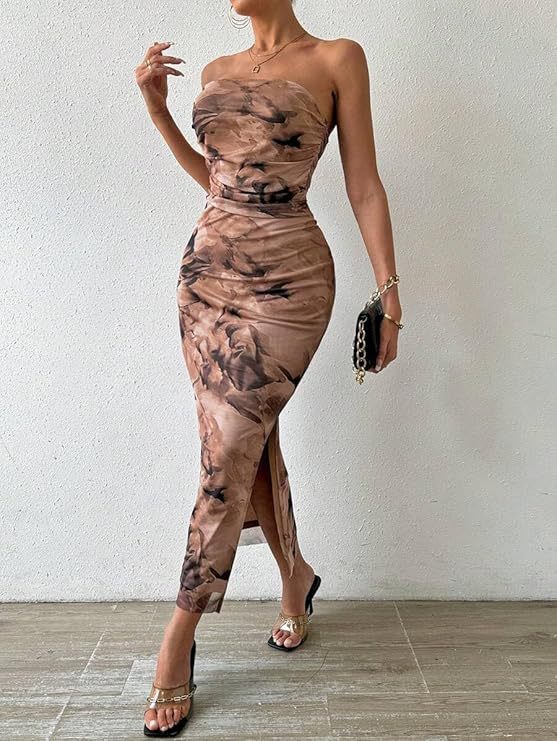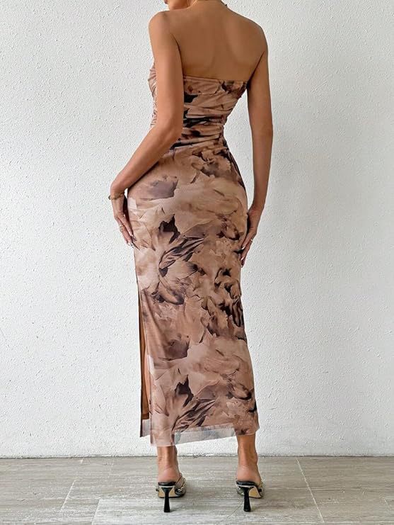 Gaun wanita tanpa lengan bermotif dengan belahan di bagian bawah, model tube top, impor Eropa dan Amerika tahun 2025, untuk Amazon dan Shein.