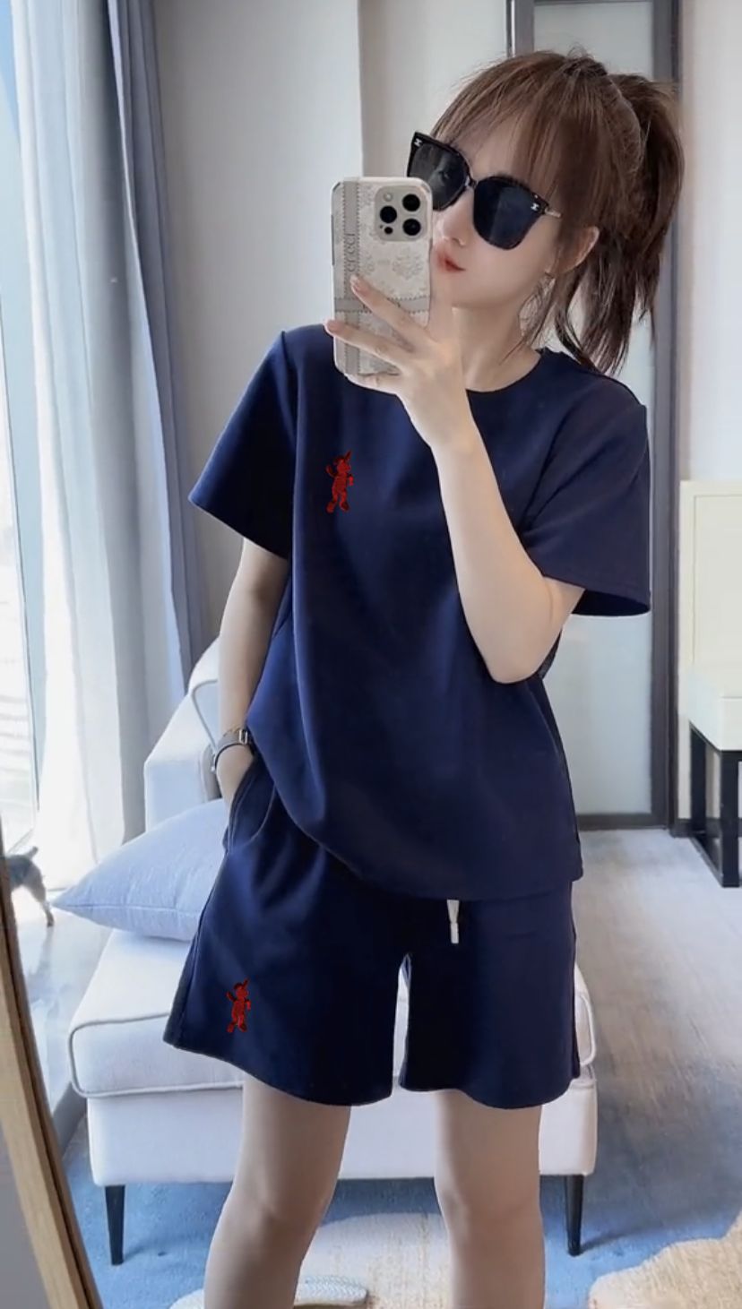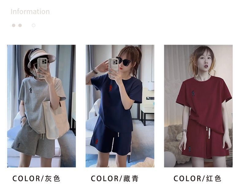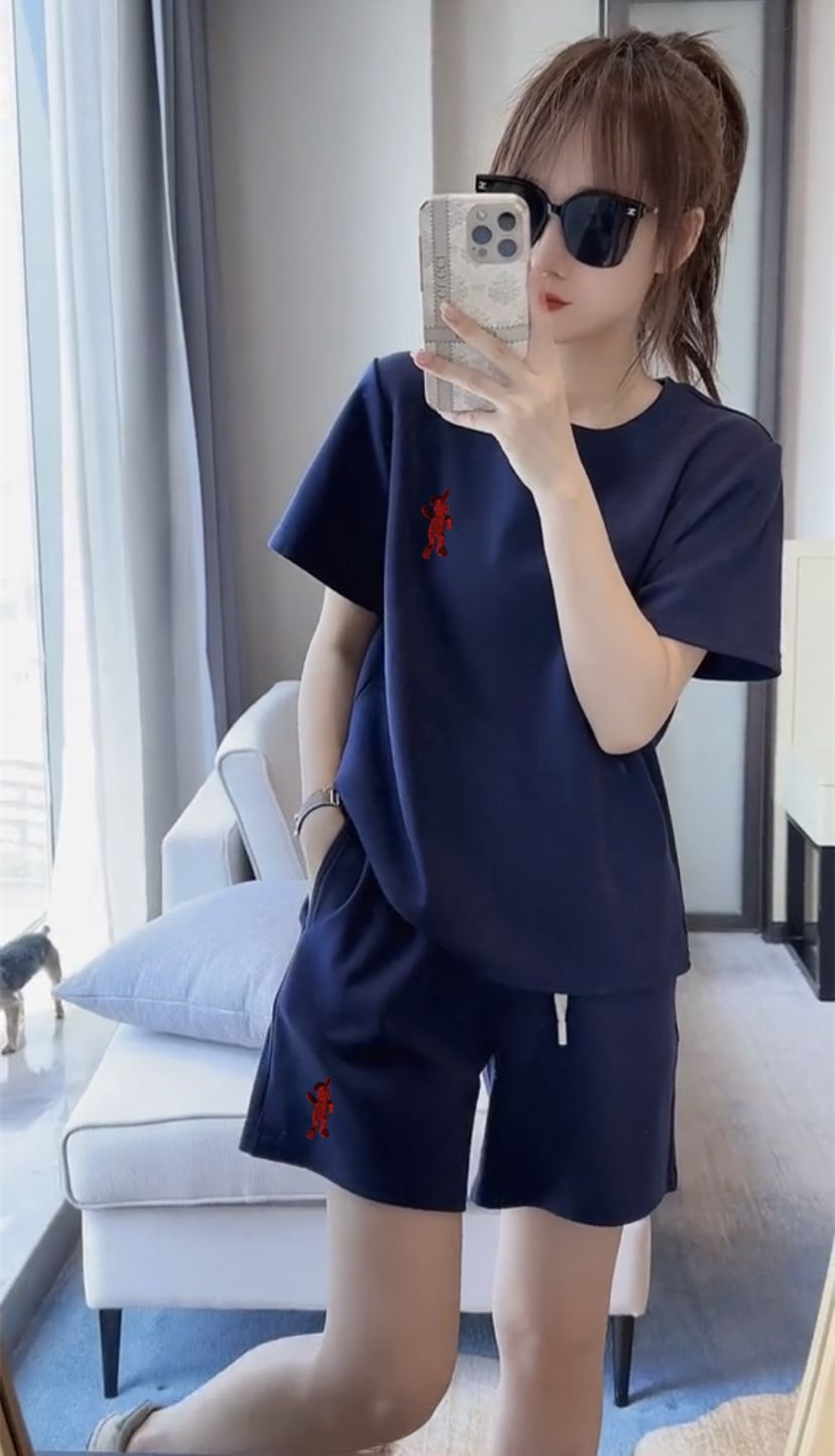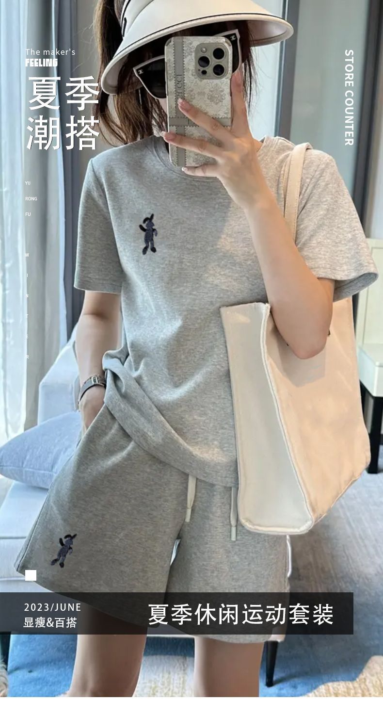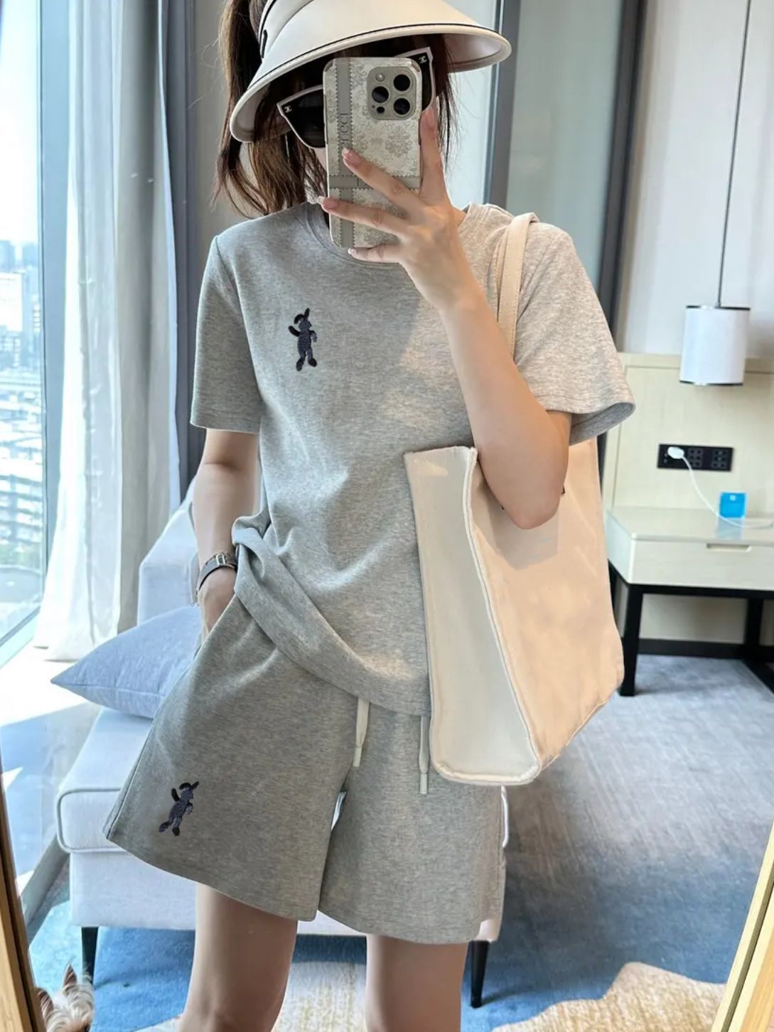 Celana Pendek Olahraga Lengan Pendek Setelan Dua Potong Pakaian Lari Santai Gaya Hong Kong Longgar Musim Panas 2025 Pakaian Wanita Bordir Tali Serut