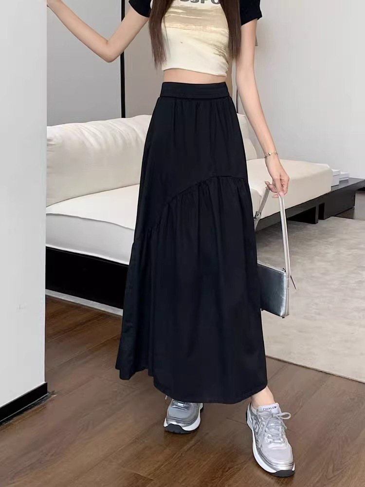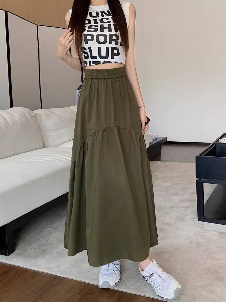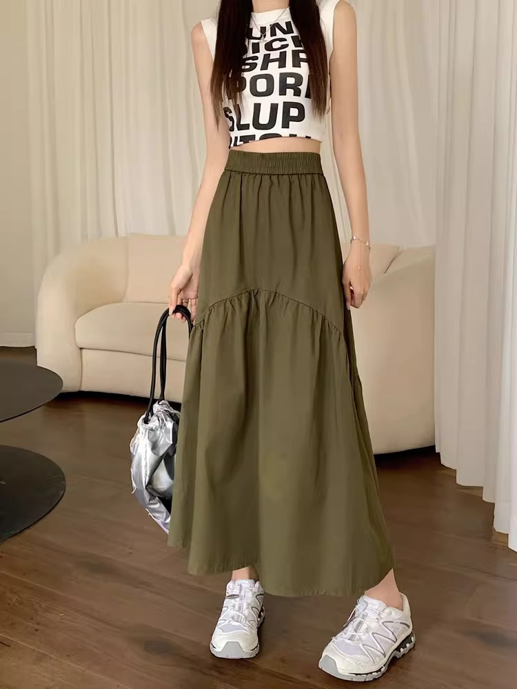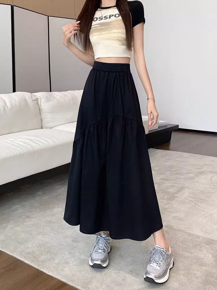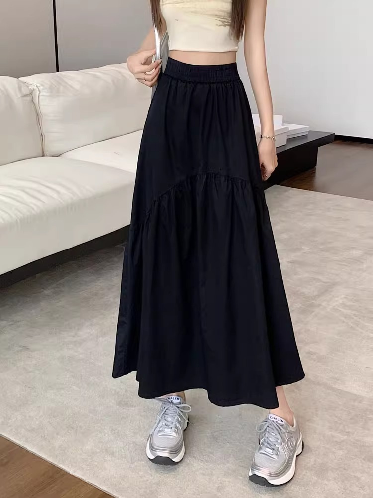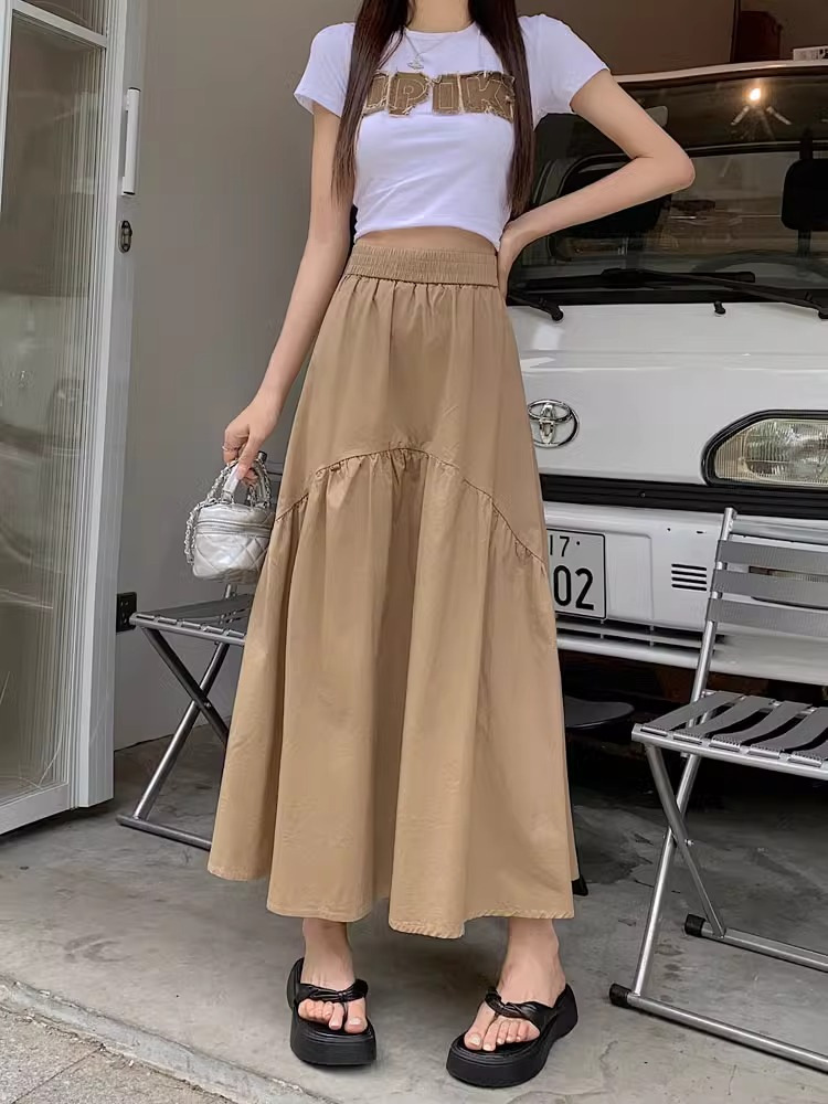 Rok kecil 2024 rok panjang pinggang elastis jahitan berlipat desain modis gaya Korea baru musim panas