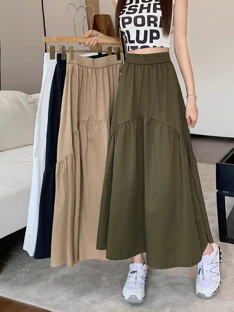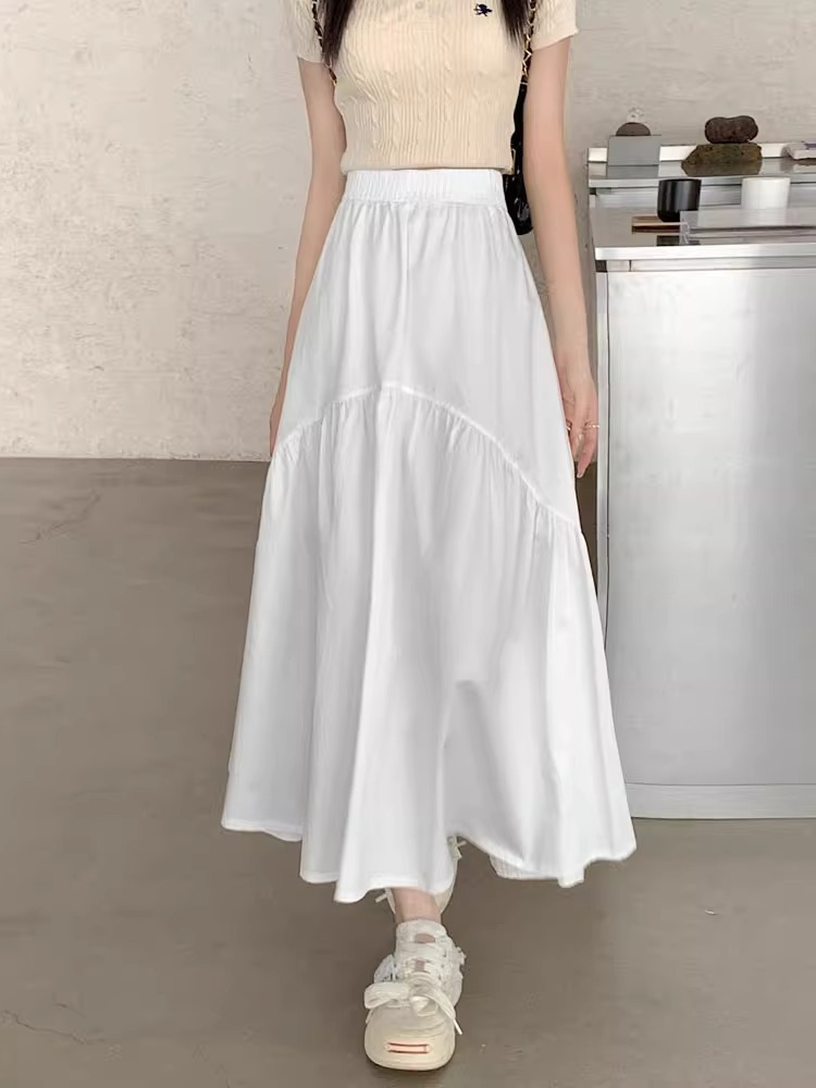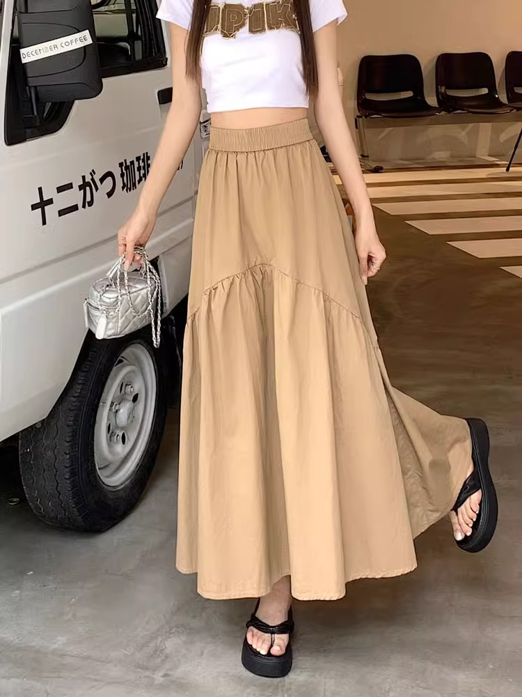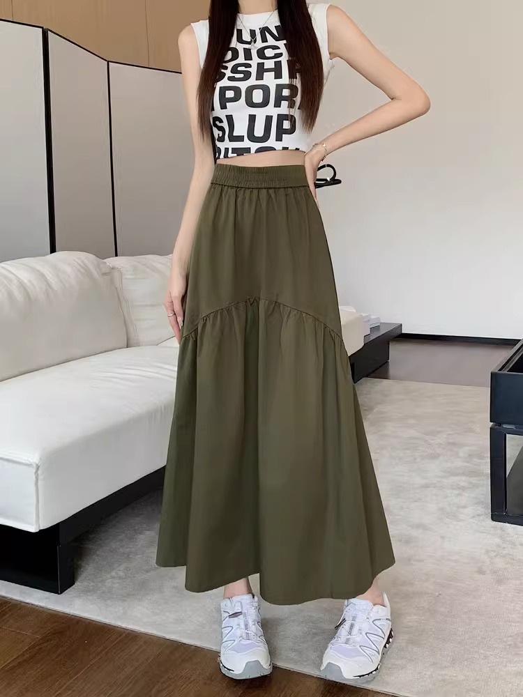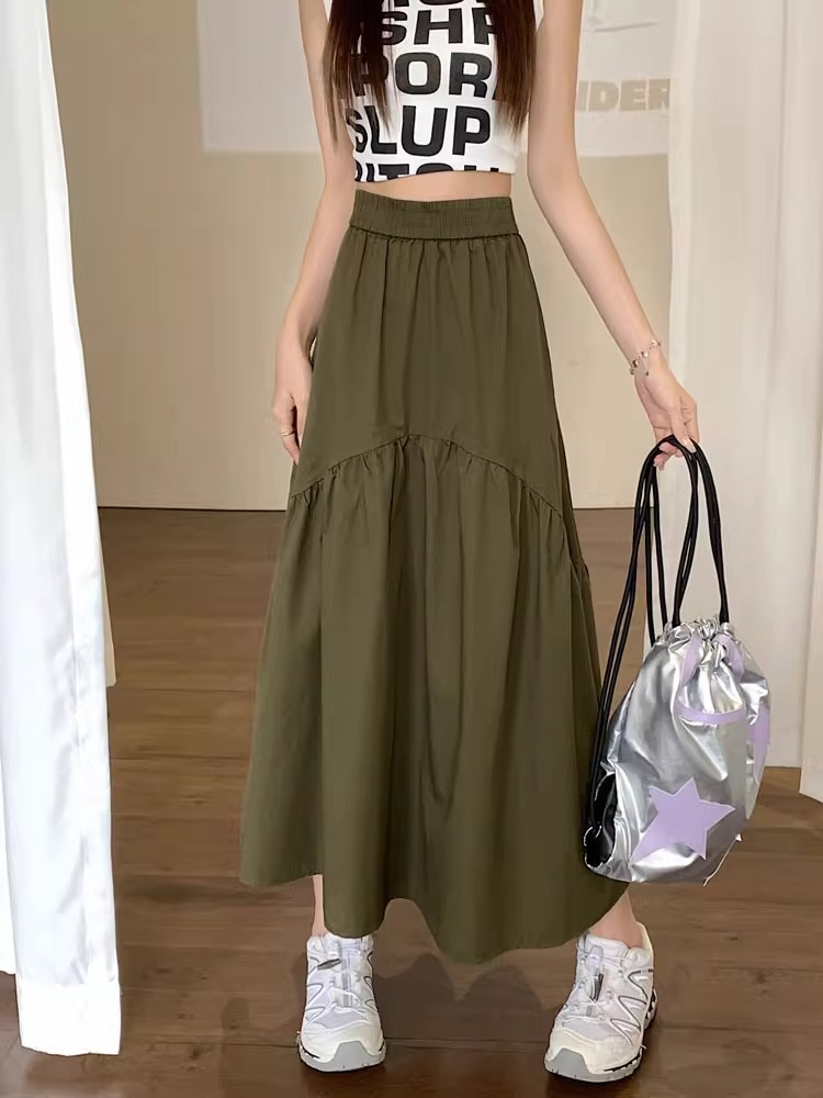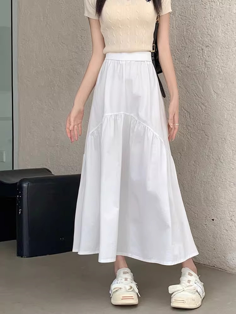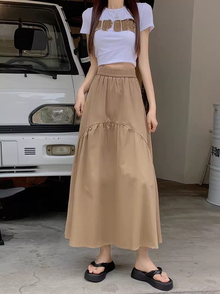 Rok kecil 2024 rok panjang pinggang elastis jahitan berlipat desain modis gaya Korea baru musim panas
