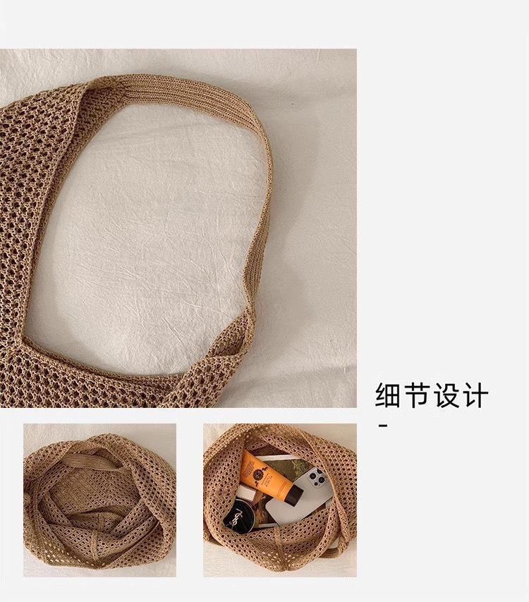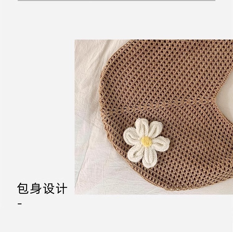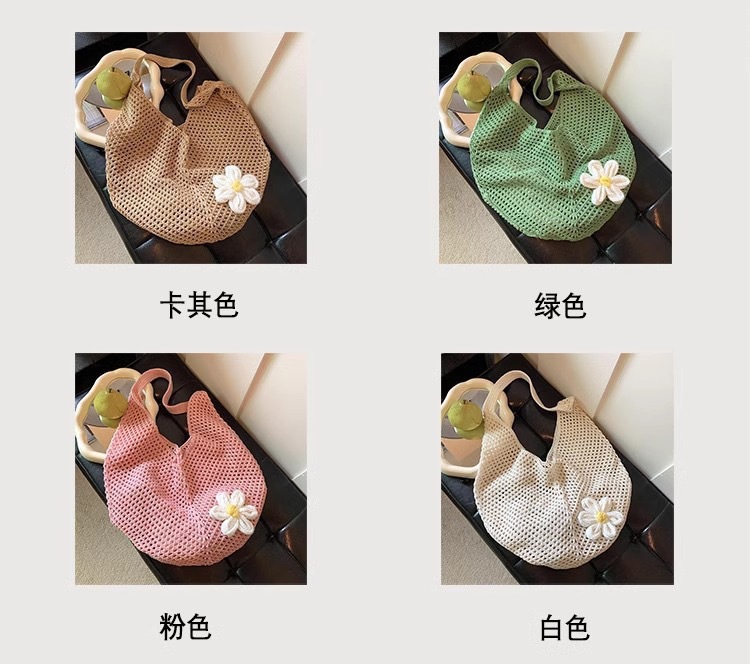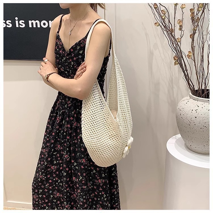 Tas Anyaman Liburan Model Baru 2025 Gaya Korea Tas Tote Bahu Tunggal Wanita Tas Pantai Berongga Bunga Rajutan Gaya Malas