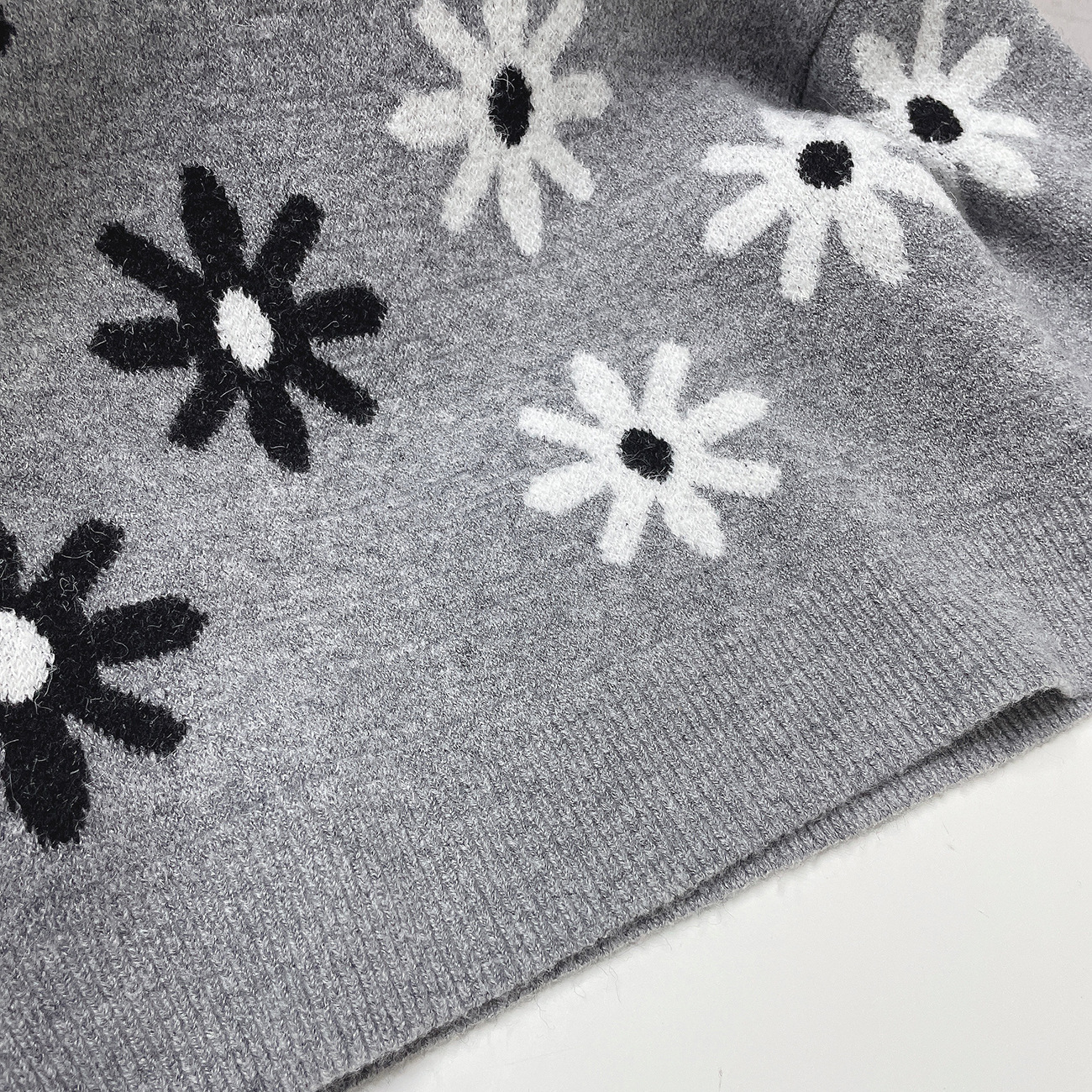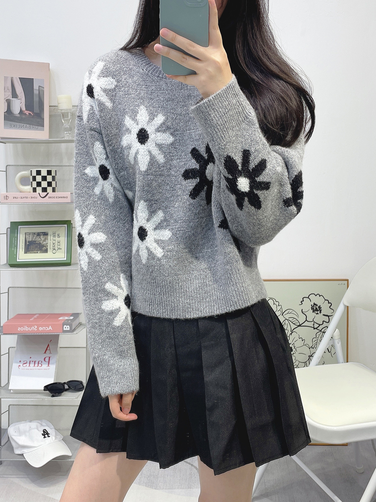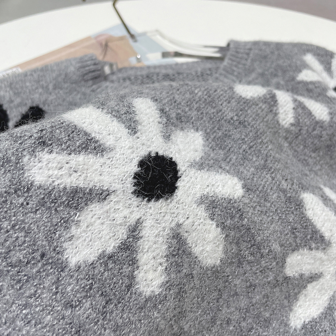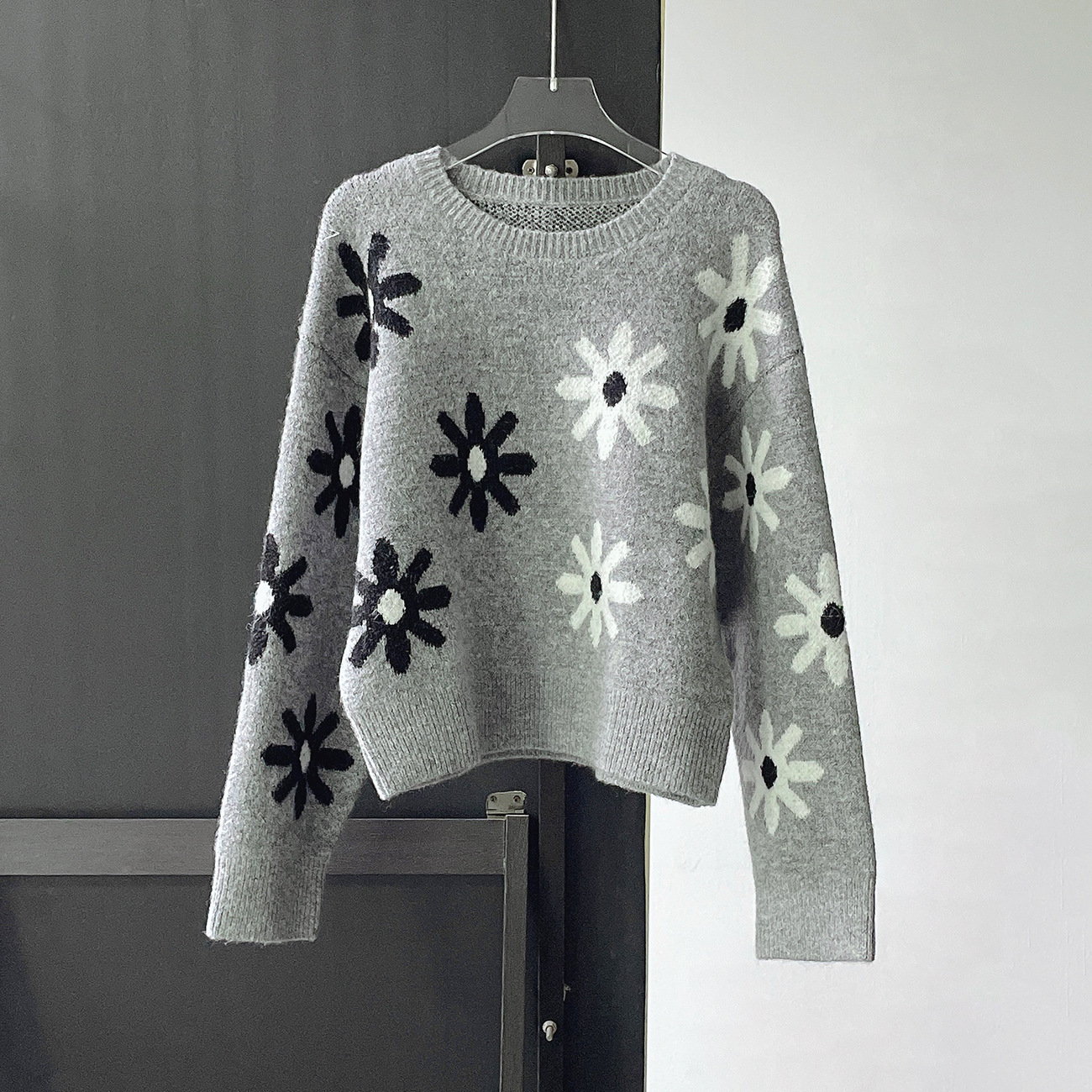 Sweter Rajut Abu-abu Jacquard Daisy Lengan Panjang Kerah Bulat Gaya Prancis Serbaguna Mode Musim Gugur/Dingin 2025 untuk Wanita