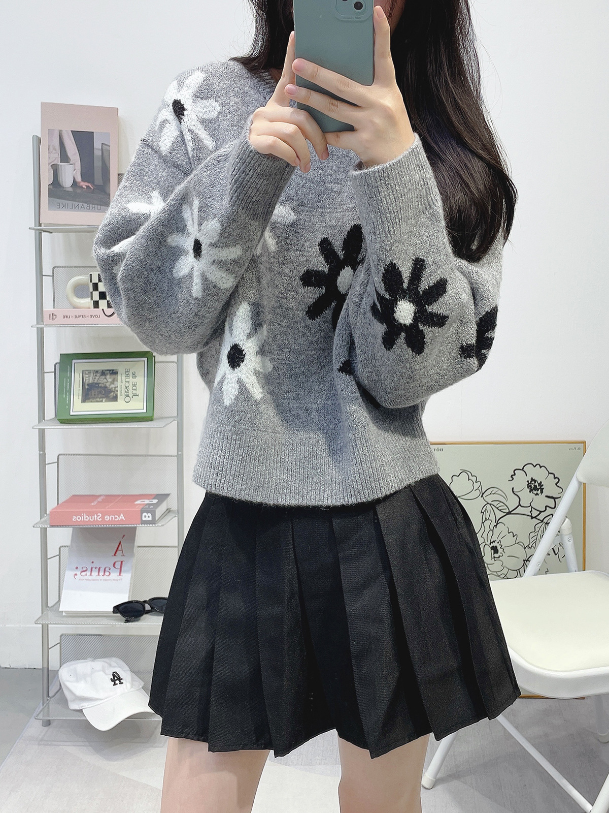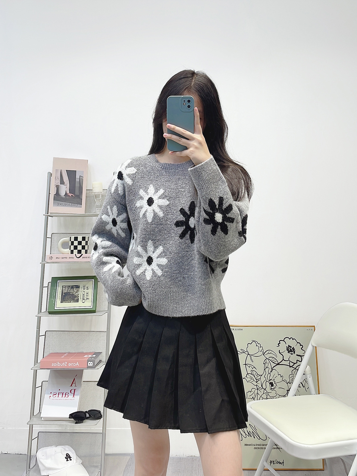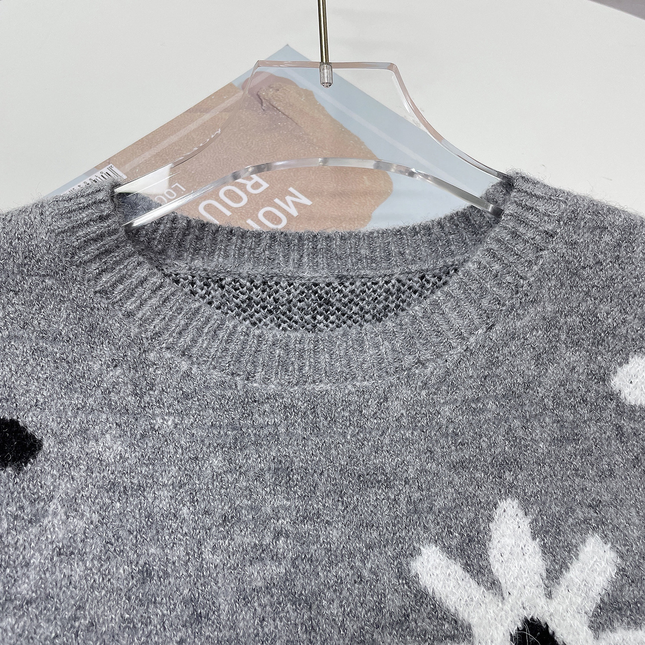 Sweter Rajut Abu-abu Jacquard Daisy Lengan Panjang Kerah Bulat Gaya Prancis Serbaguna Mode Musim Gugur/Dingin 2025 untuk Wanita