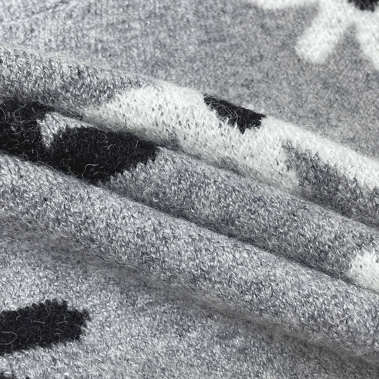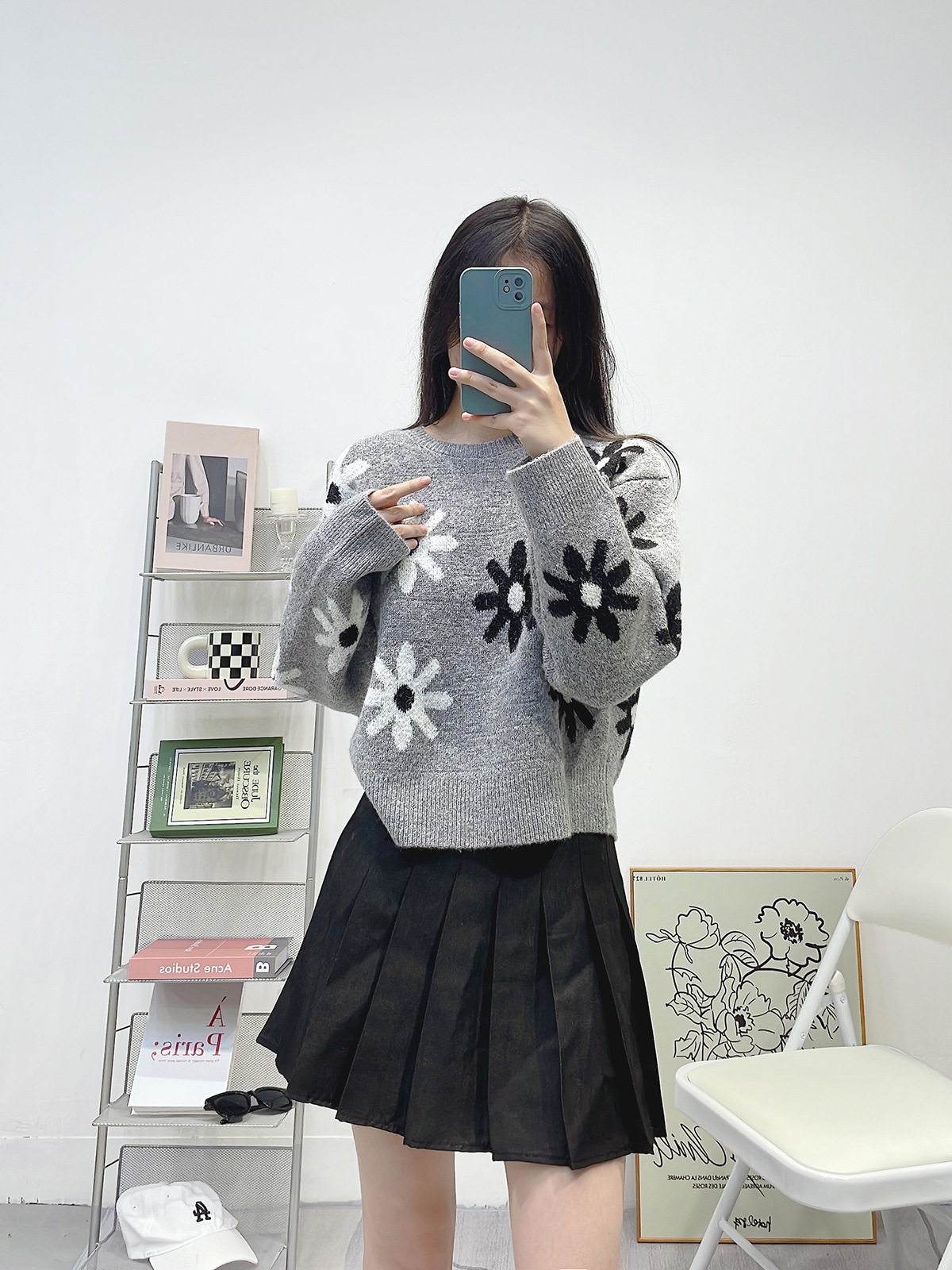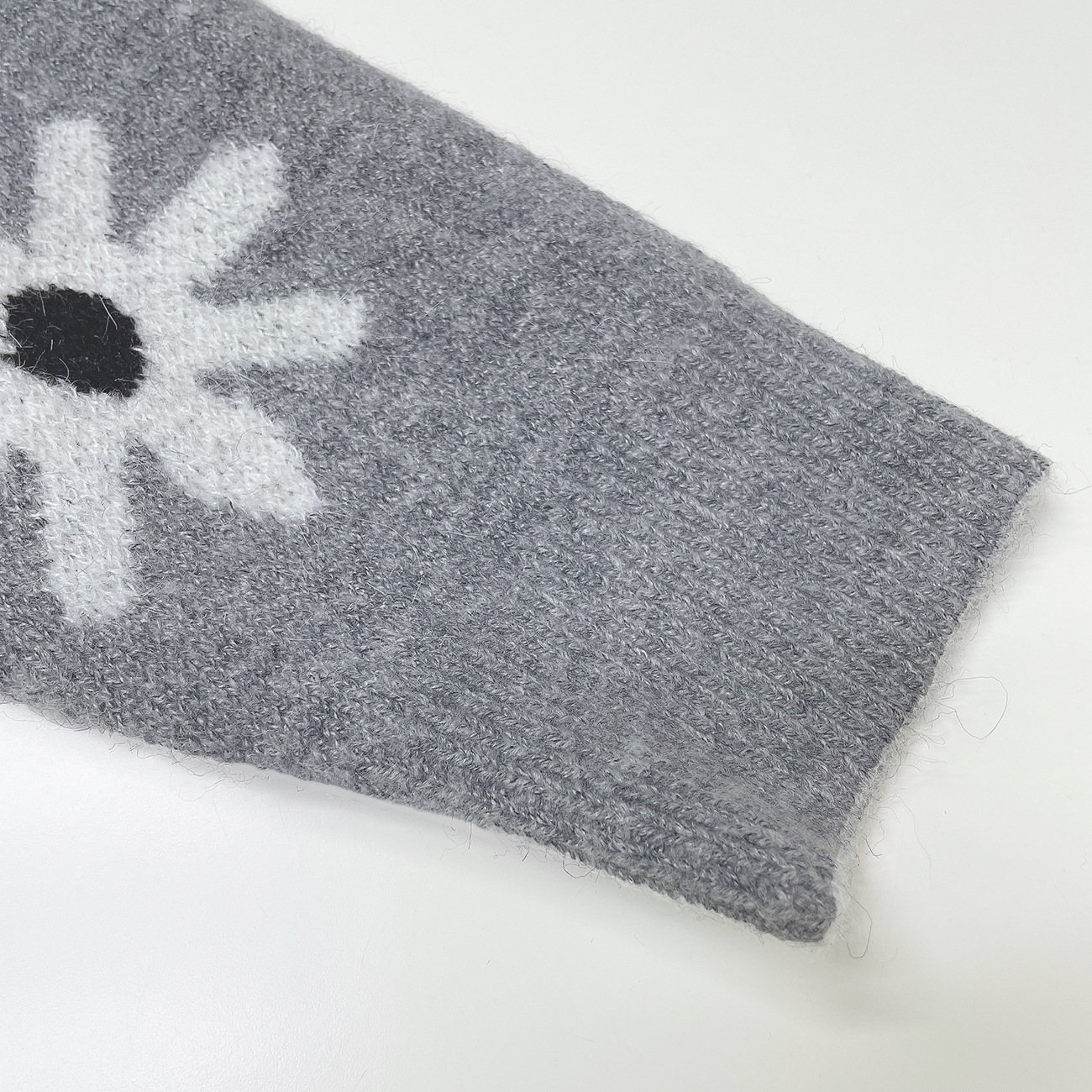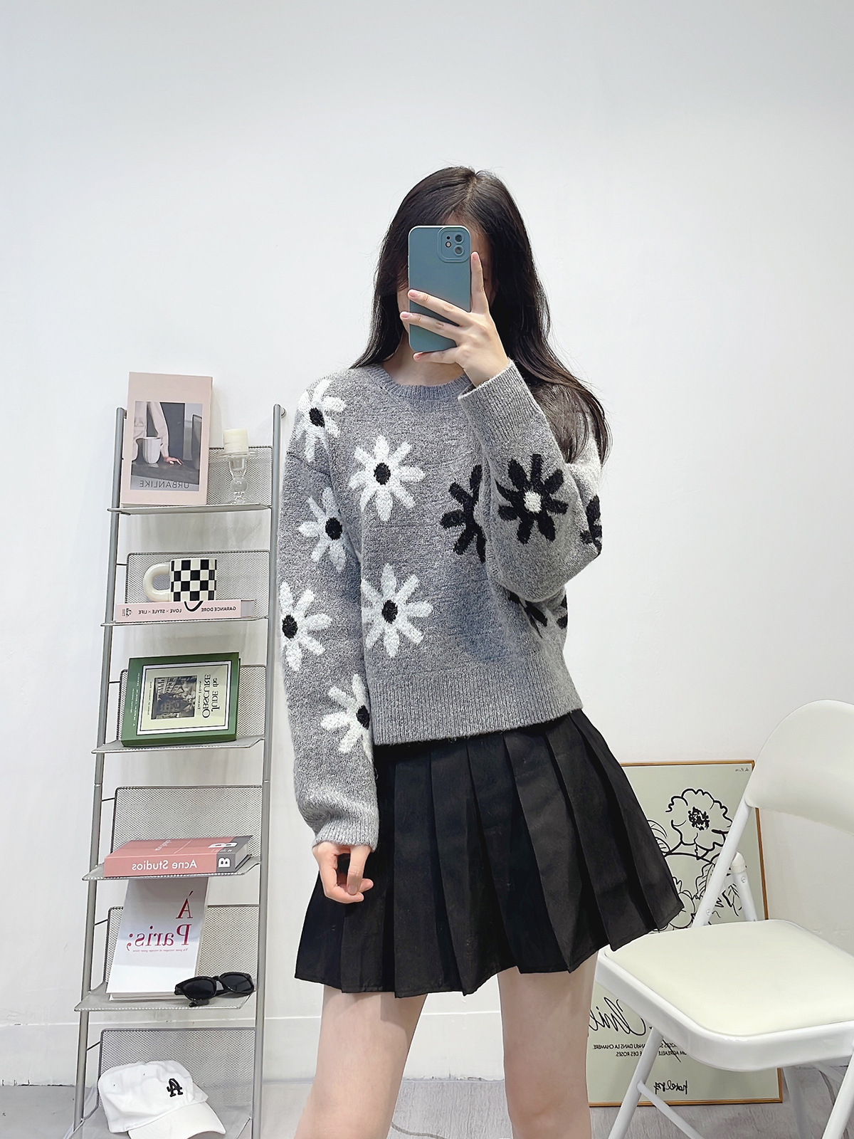 Sweter Rajut Abu-abu Jacquard Daisy Lengan Panjang Kerah Bulat Gaya Prancis Serbaguna Mode Musim Gugur/Dingin 2025 untuk Wanita