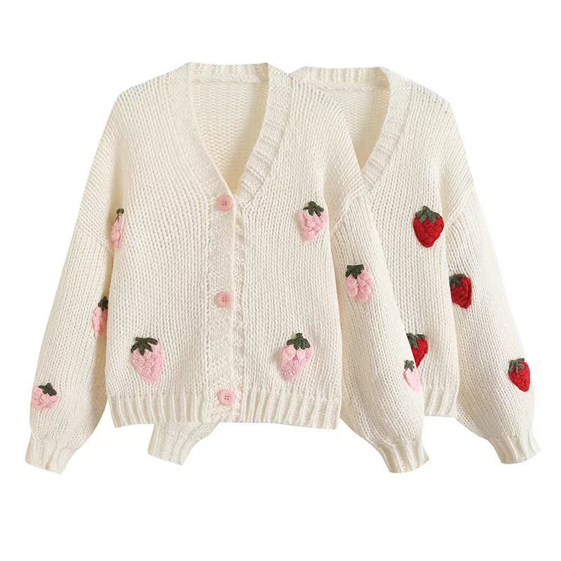 Kardigan Rajutan Stroberi Tiga Dimensi Kerah V Mudah Dipadu Padan Segar Model Baru Musim Gugur Musim Dingin Jaket Modis Wanita