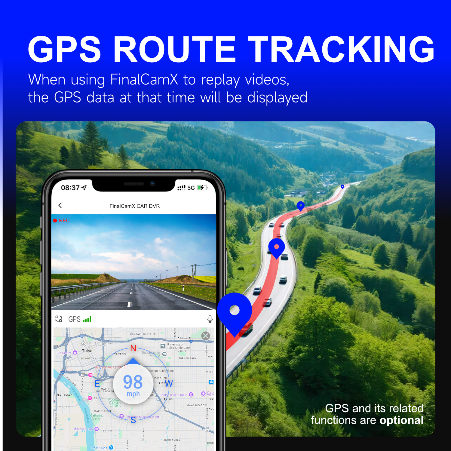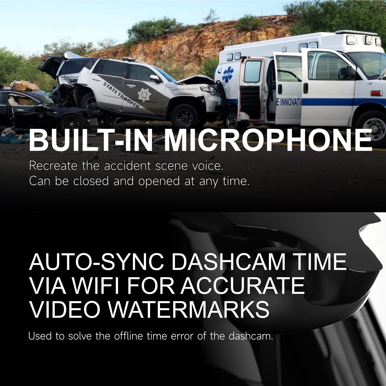 4K行车记录仪前后摄像头3840*2160+1920*1080P分辨率,5.8GHz WiFi、GPS,双车摄像头,1.5英寸IPS高清屏幕 行车记录仪,适用于汽车、,24小时停车模式,nightvision夜视功能,WDR HDR,170°广角,G传感器,循环录像、重力感应、碰撞锁定视频、视频录像语音录制、app应用控制finalcamx,最大支持512GB/ 1TB