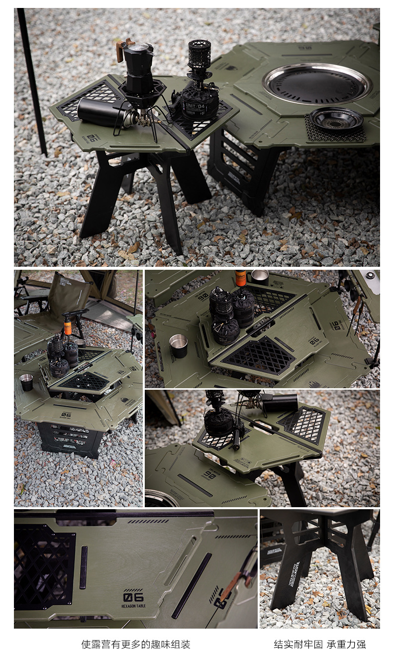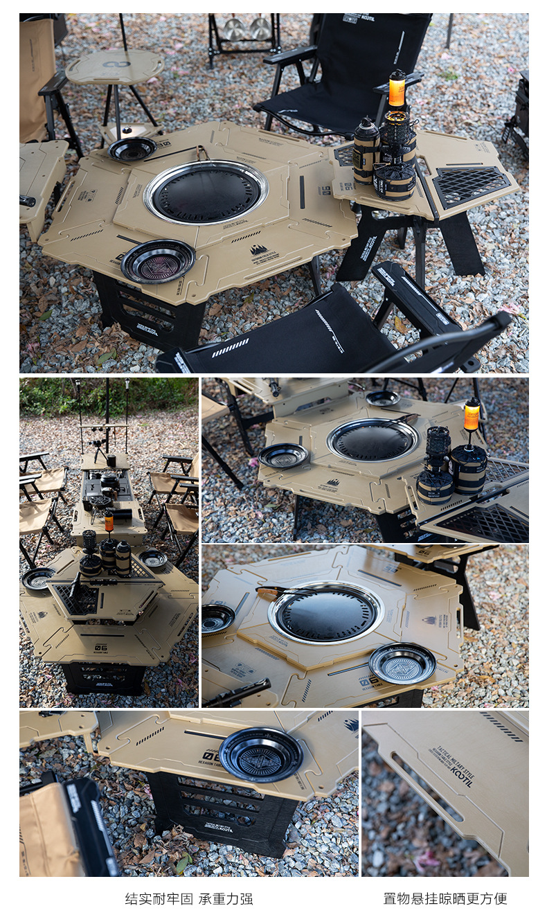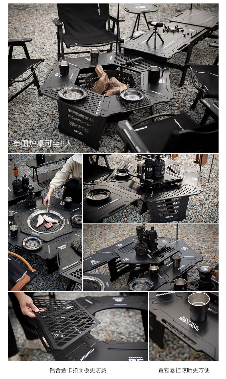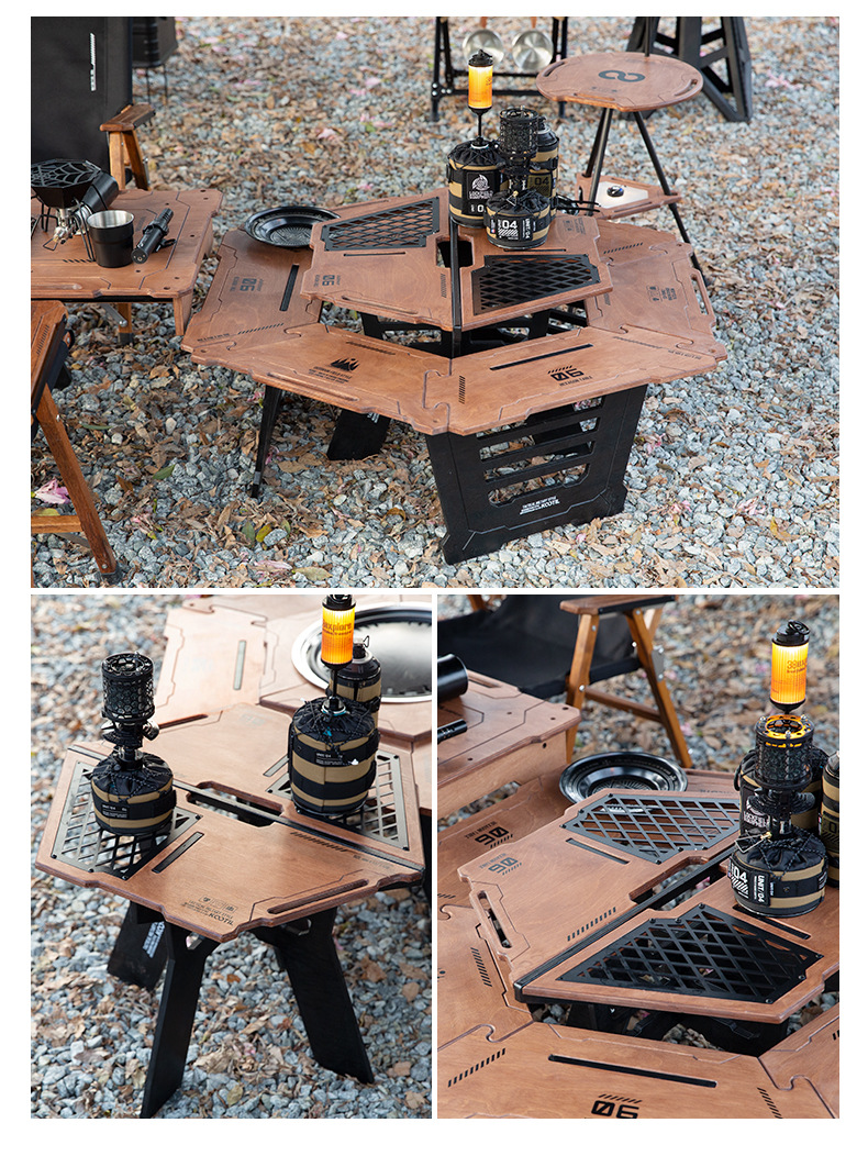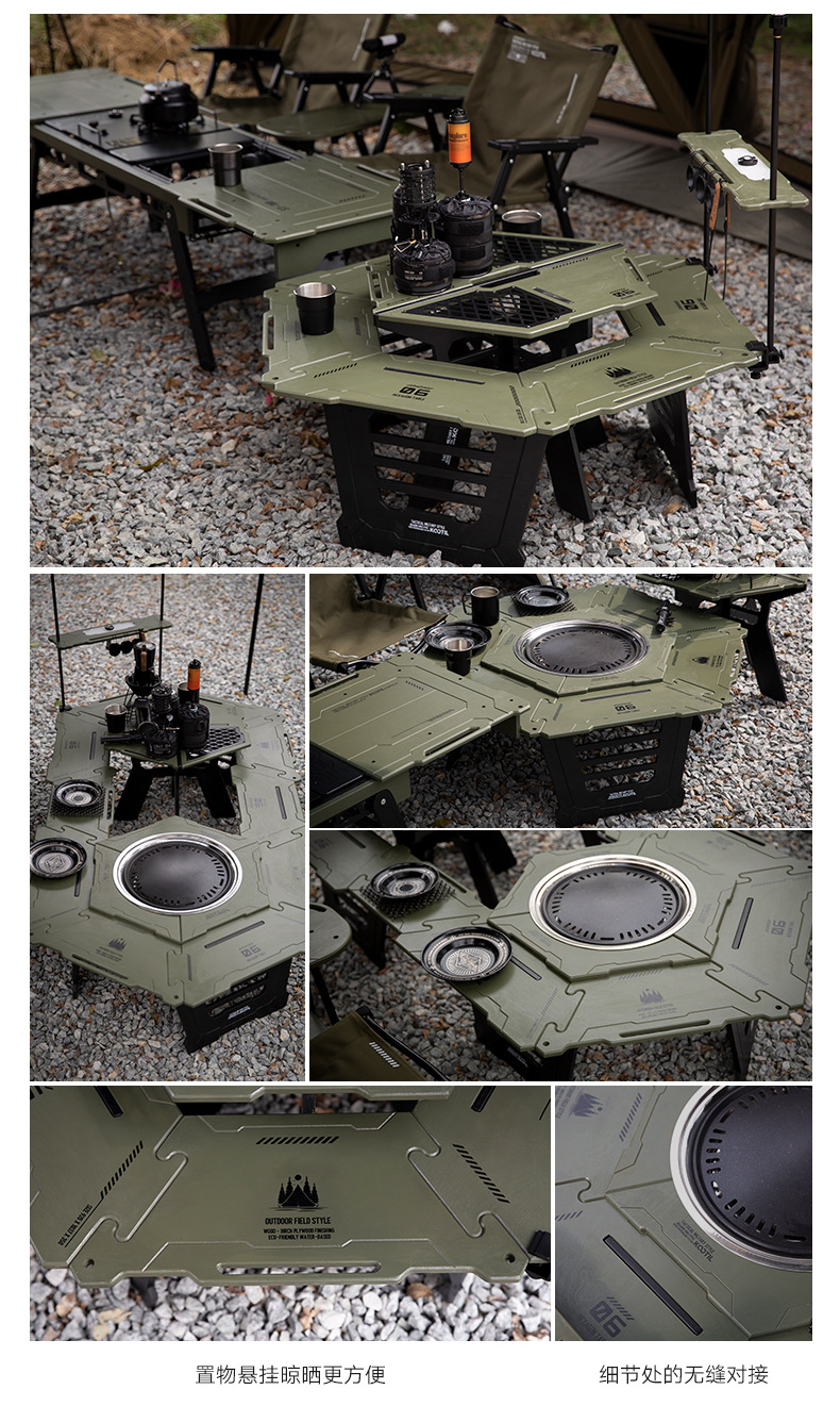 Meja kombinasi Multifungsi Camping, kompor luar ruangan meja teh berkemah, set lengkap meja barbekyu lipat heksagonal dapat dilepas