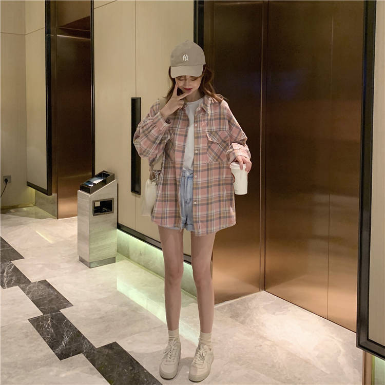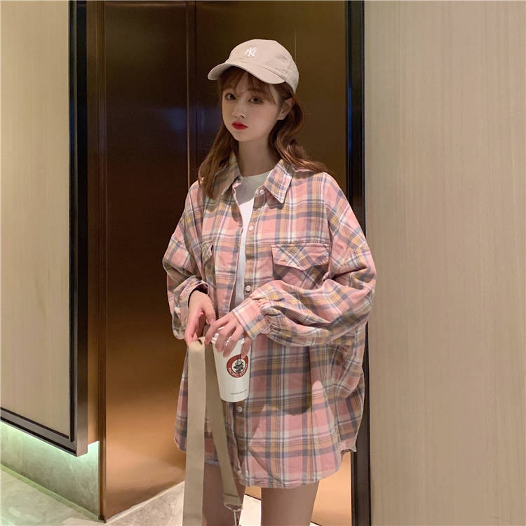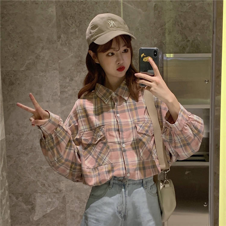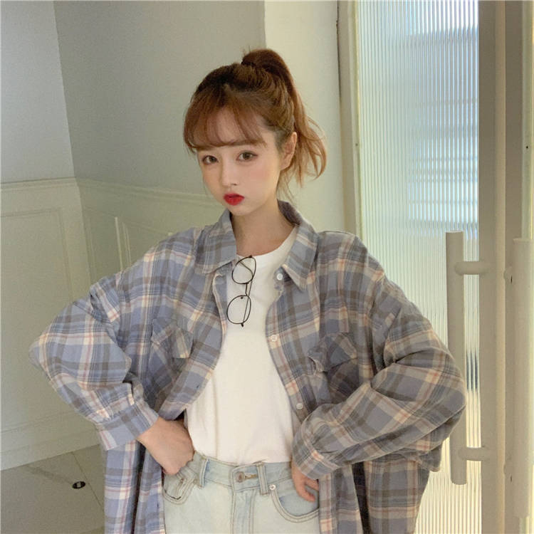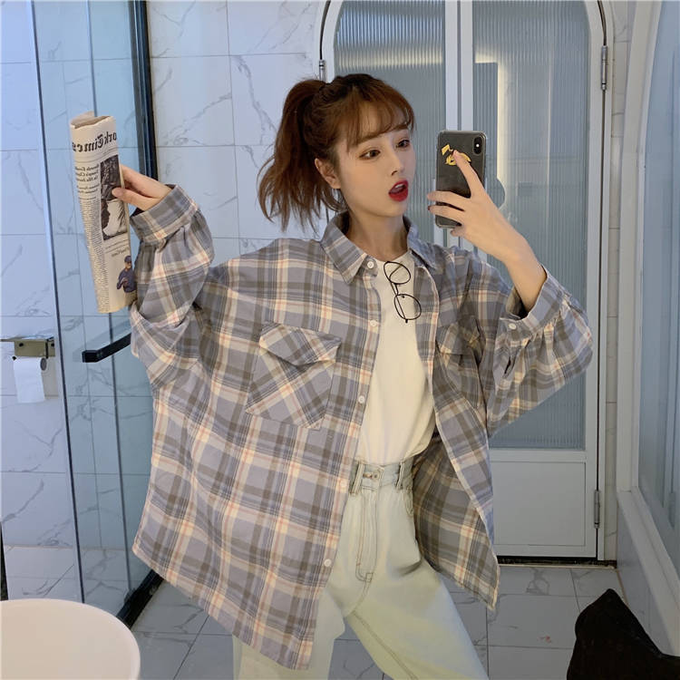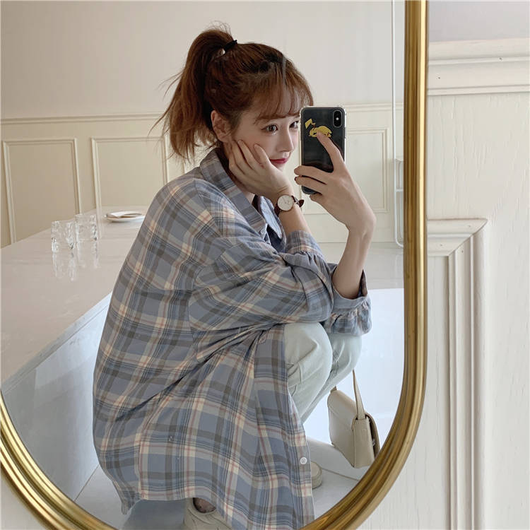 Kemeja kotak-kotak segar gaya baru untuk siswa perempuan mantel POLO lengan panjang desain serbaguna Musim Semi dan musim gugur longgar untuk siswa perempuan