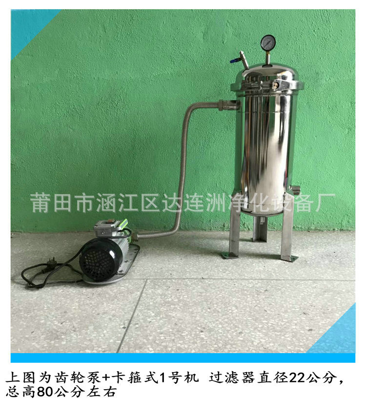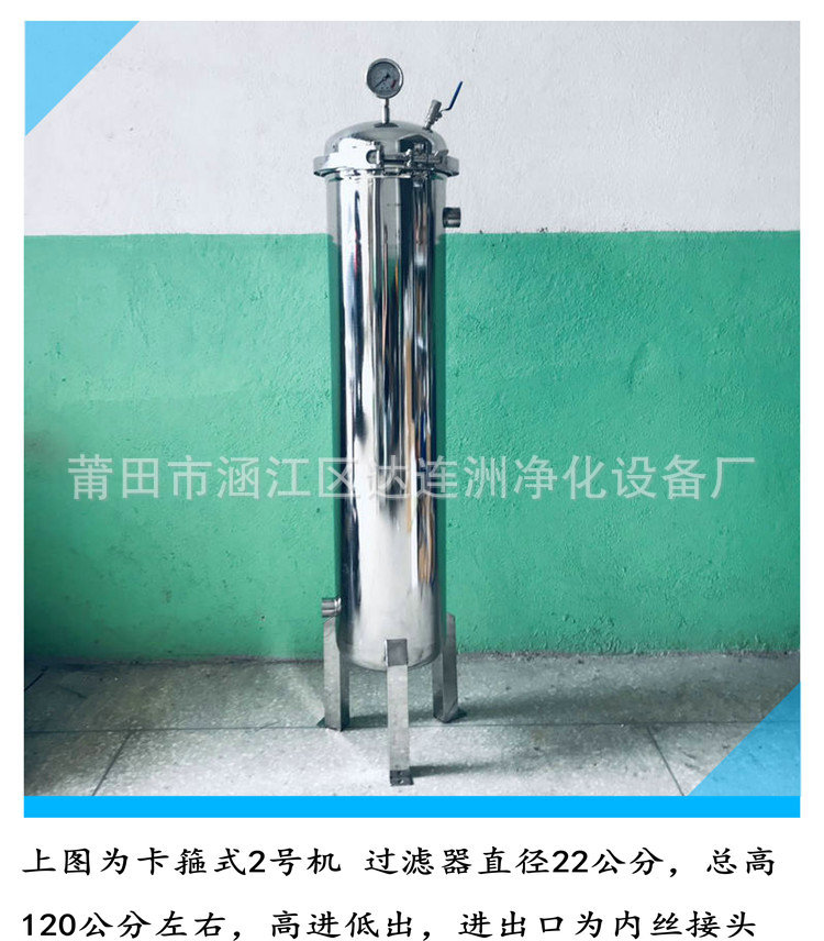 过滤器由3部份组成:不锈钢304筒体,支撑滤篮,滤袋。过滤器是一种结构新颖、体积小、操作简便的多用途过滤机。该种过滤器是一种压力式过滤装置,由泵的加压作用,液体由过滤机进料口流入滤袋,滤袋装在加强网内,液体透过滤袋,即能获得合格的滤液,杂质颗粒被滤袋捕捉,随着过滤时间的增加,被截留在滤网上的固体杂质越来越多,使滤饼厚度不断增加,这样使过滤阻力变大,罐内压力升高,当压力升高到0.4MPA时(以卡箍式过滤器为例),就需要清理滤袋了,该机更换滤袋很方便,过滤基本无物料消耗。开盖前需把排气阀打开(工作时排气阀处理关闭状态),排空过滤器内的气体,把过滤器的盖子打开。把滤袋拿出来,杂质倒掉再用清水冲洗,清洗晒干后再把袋子装到过滤器内,这样就可以重新再使用了。滤袋的更换成本也不高,1号袋一个也就30元。