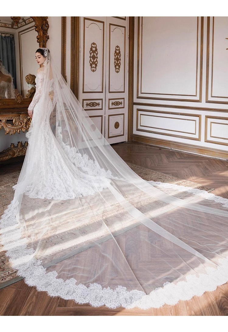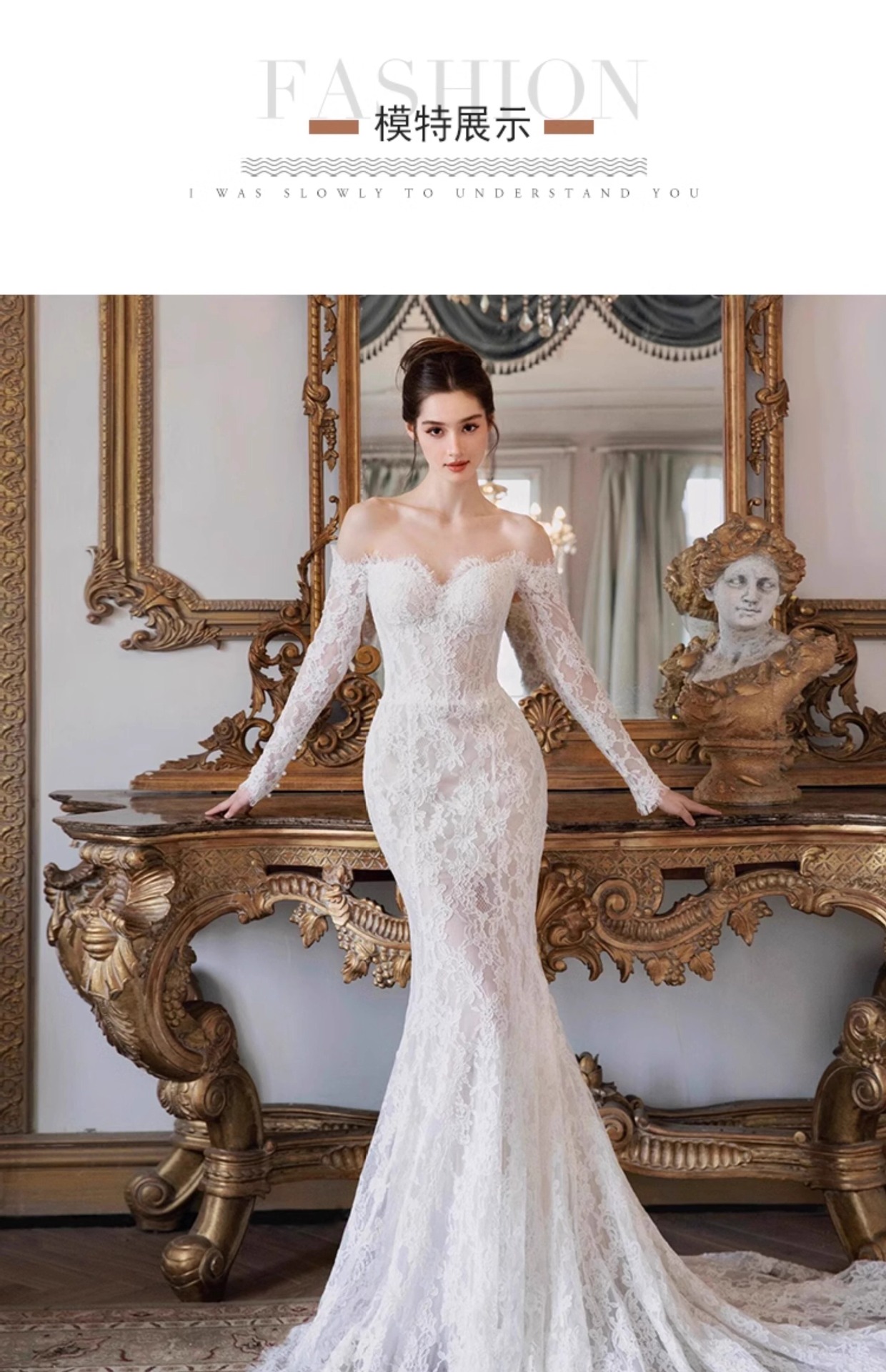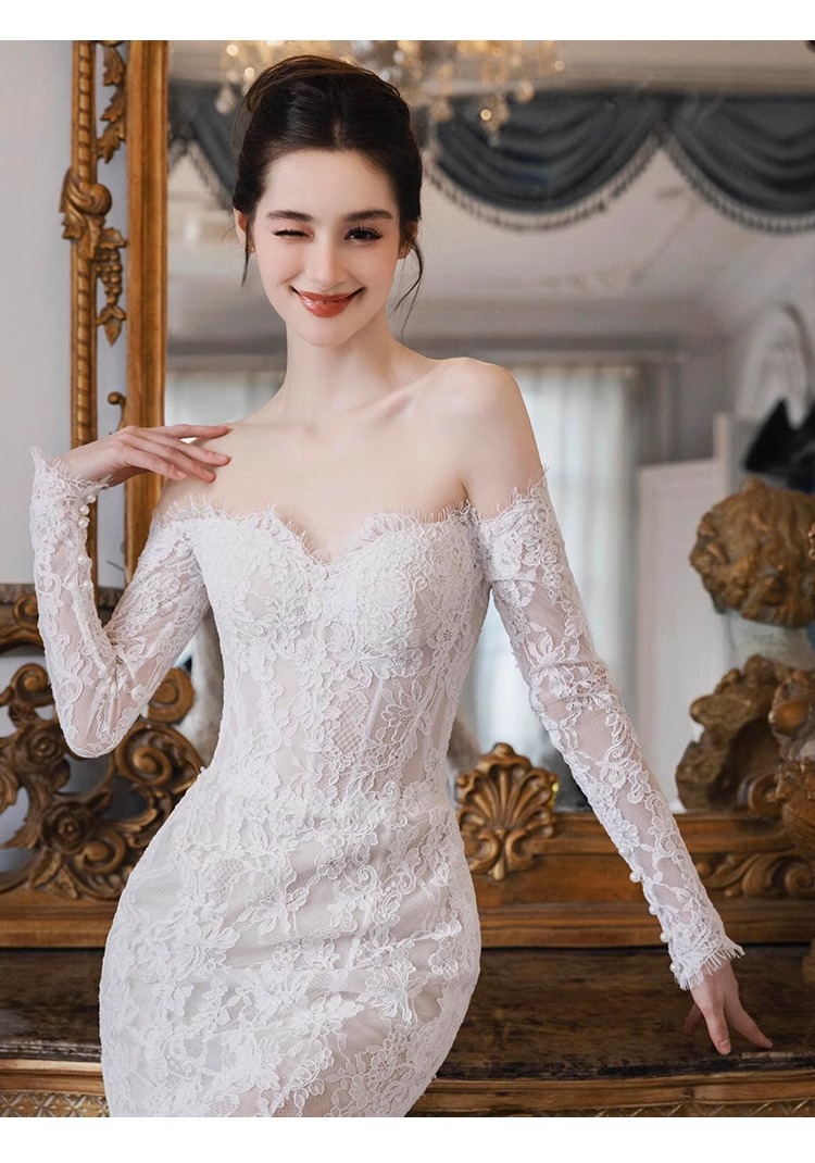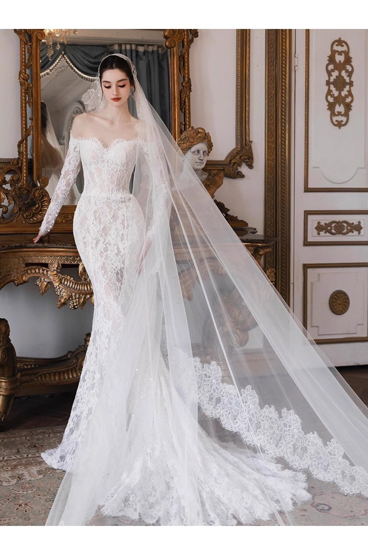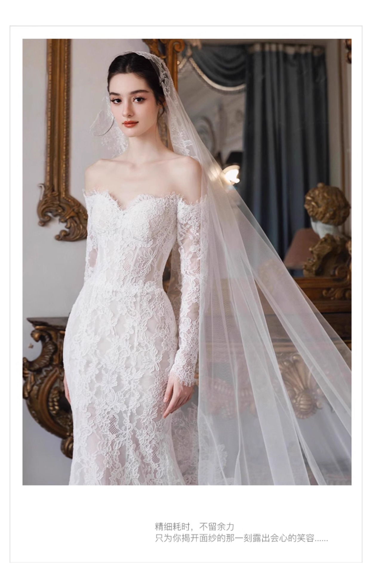 Gaun Pengantin Renda Ringan Ekor Ikan Lengan Panjang Bahu Gaya Perancis