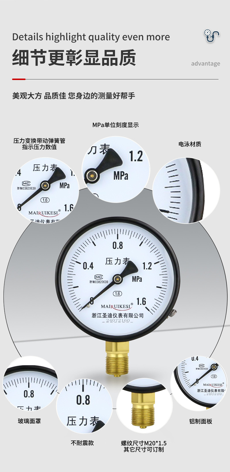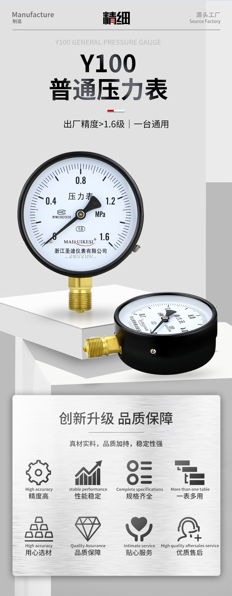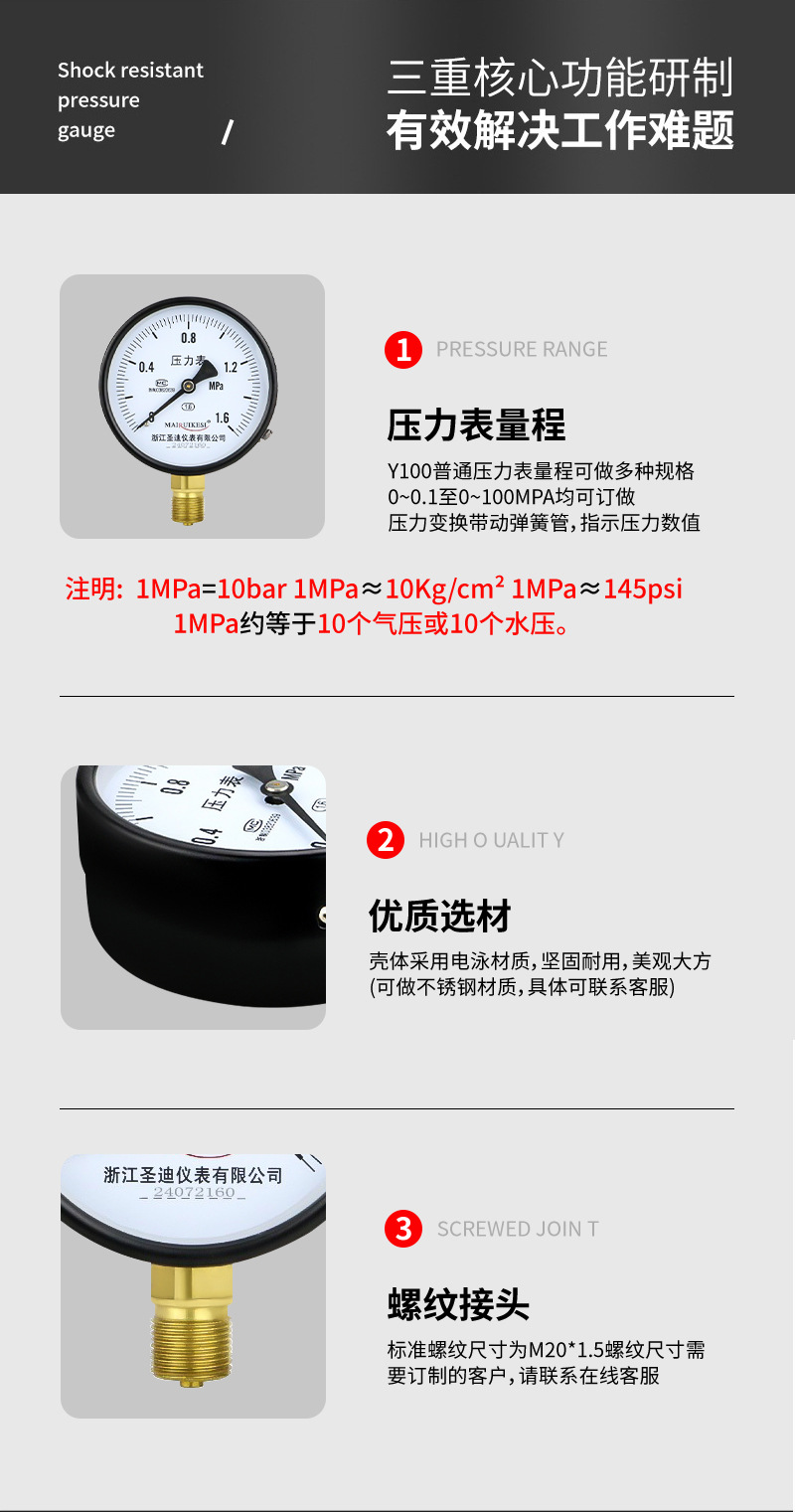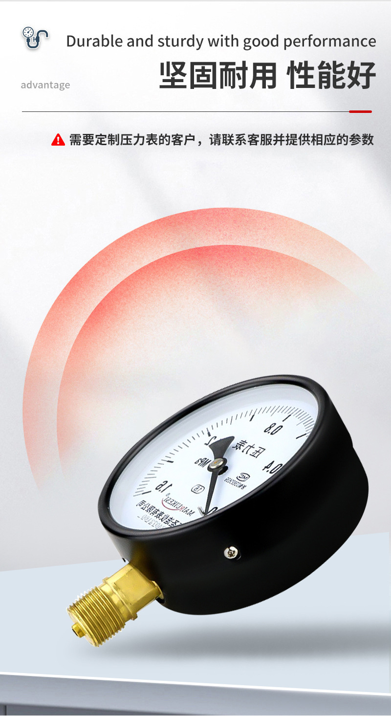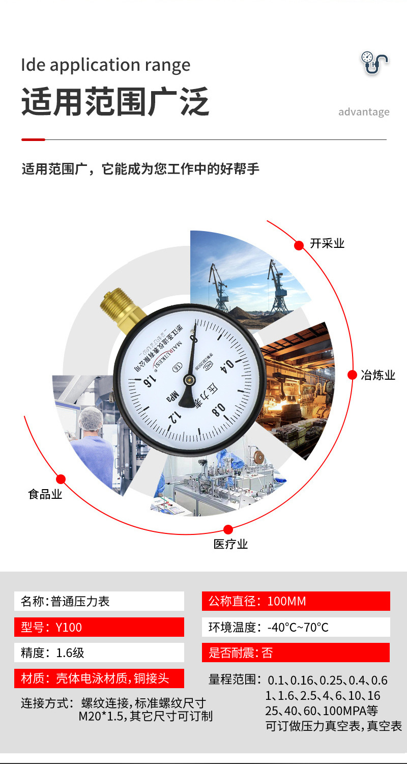 Pengukur tekanan vakum radial standar ulir m20*1.5 untuk air, gas, oli, dan tekanan hidrolik, pengukur tekanan standar baja tahan karat Y100.