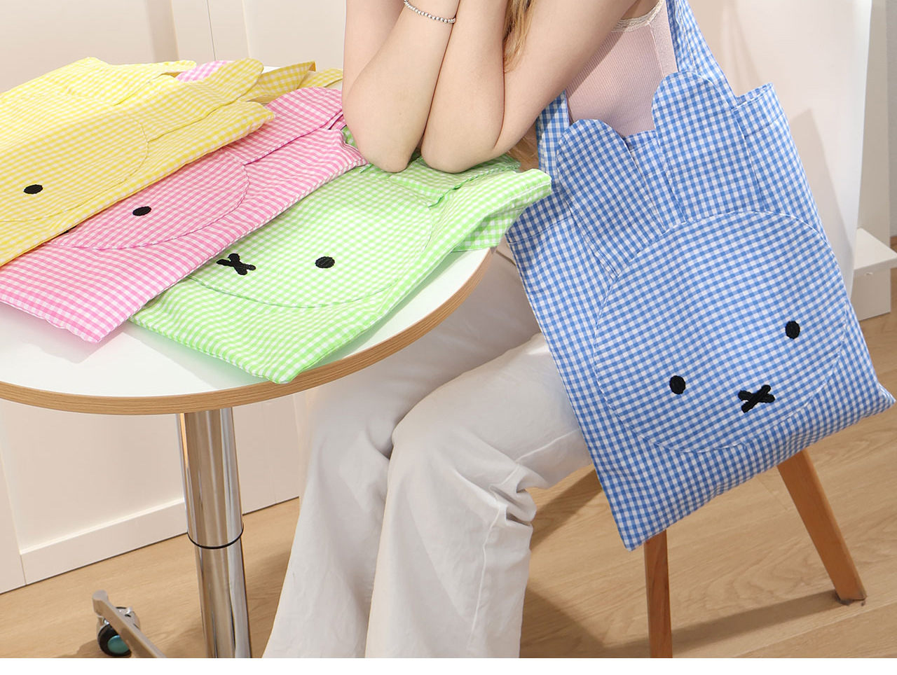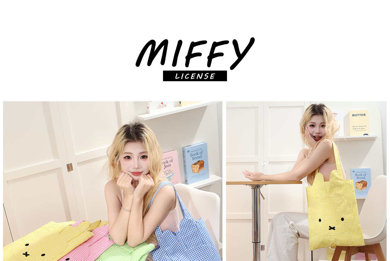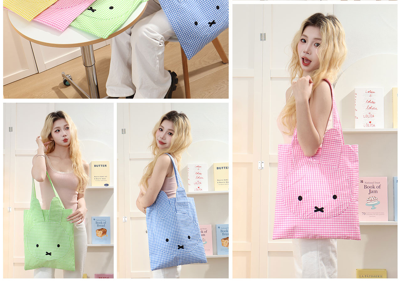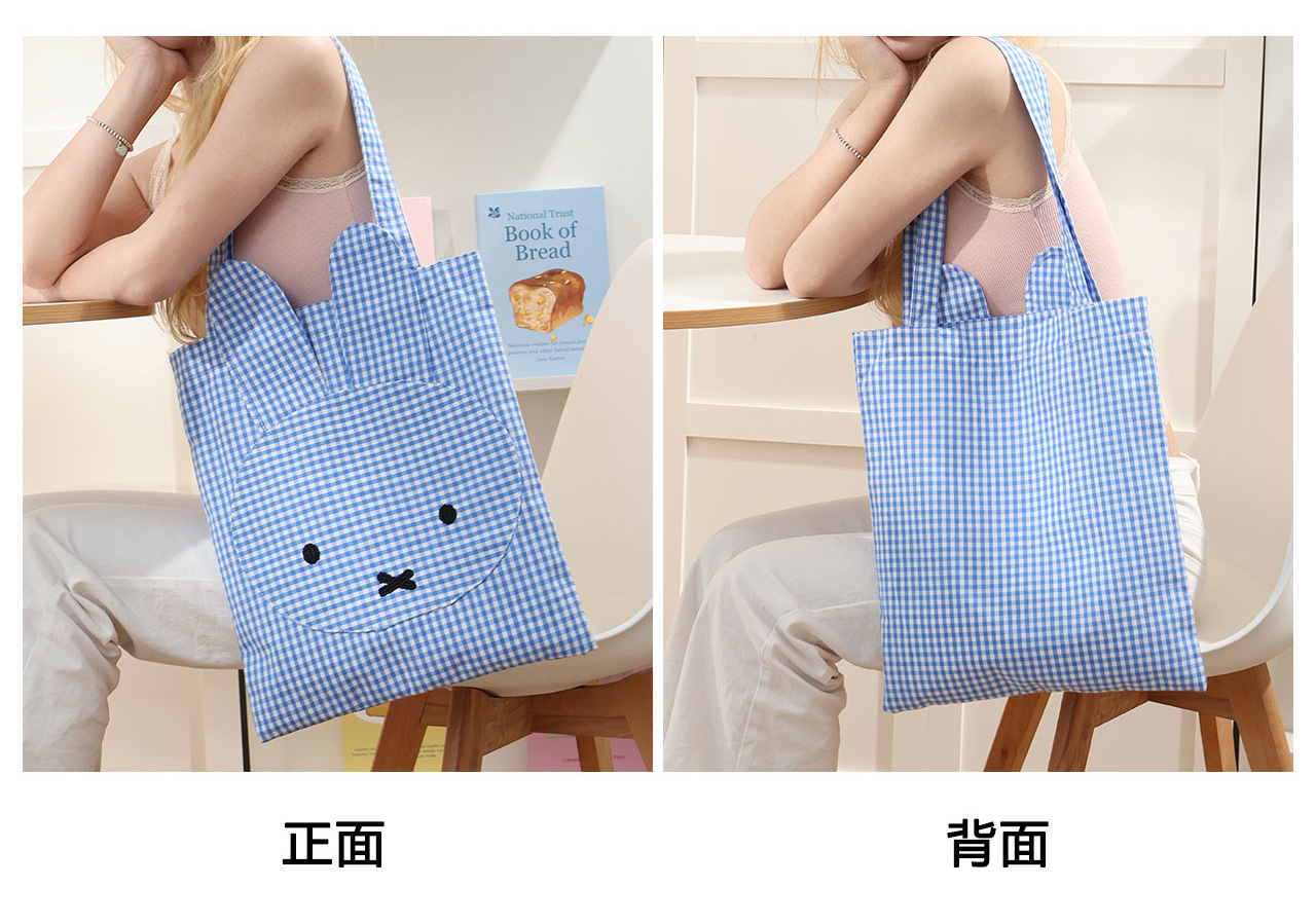 Miffy Tas Bahu Tunggal Elemen Kotak-Kotak Lucu Mudah Dipadu Padan Tas Jinjing Kotak-Kotak Tas Kain Kanvas Kapasitas Besar Imut Bordir