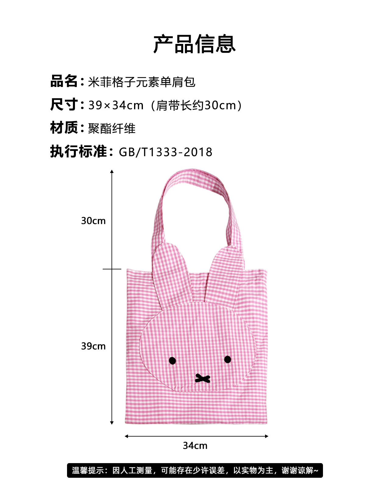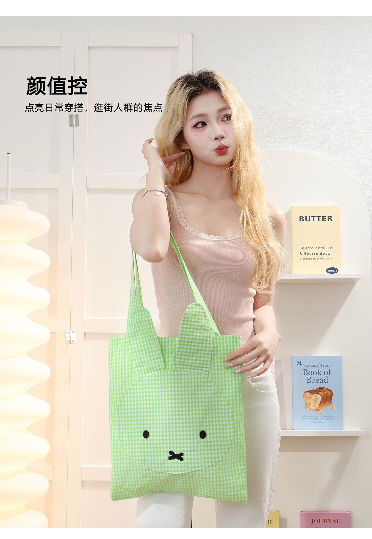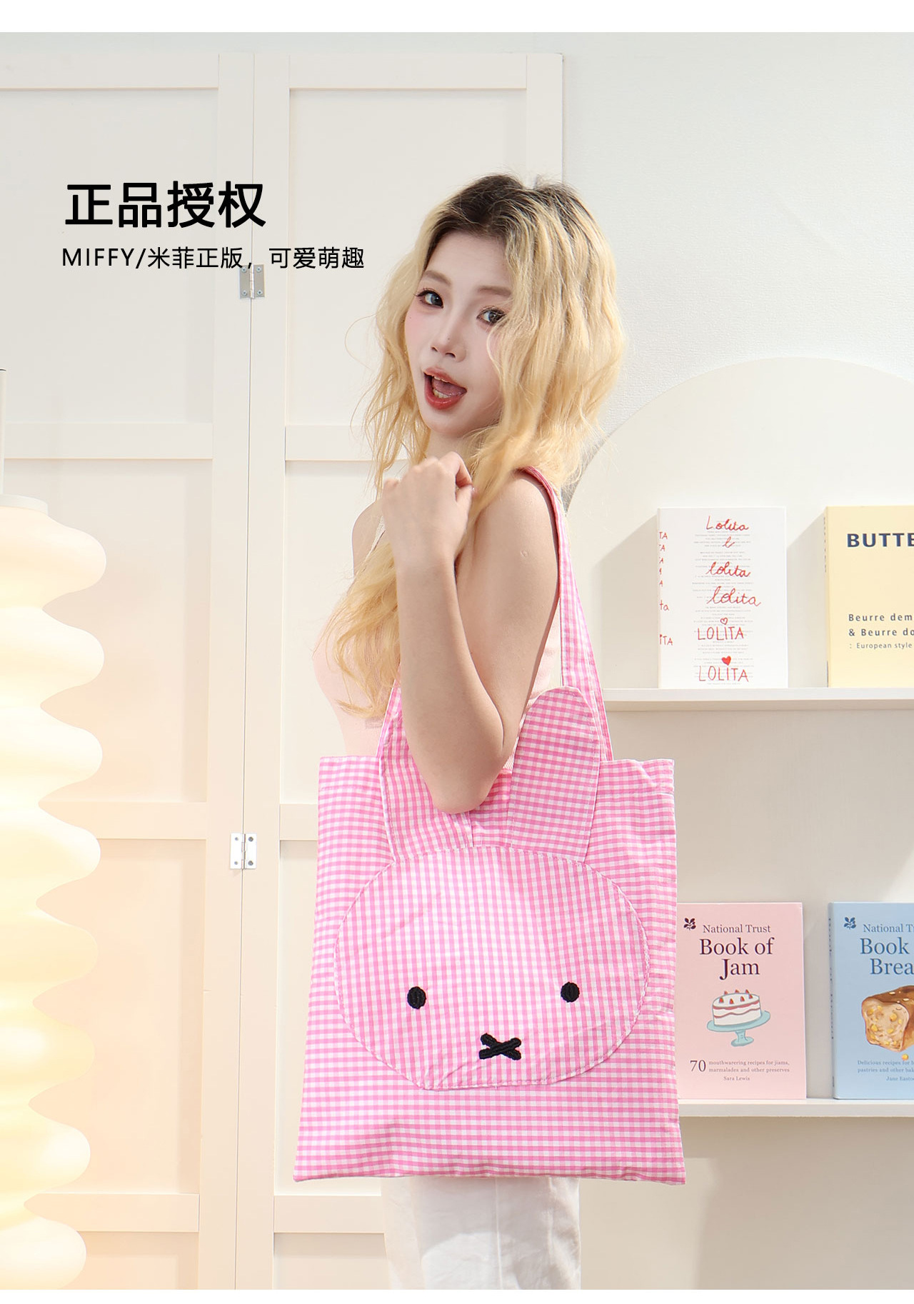 Miffy Tas Bahu Tunggal Elemen Kotak-Kotak Lucu Mudah Dipadu Padan Tas Jinjing Kotak-Kotak Tas Kain Kanvas Kapasitas Besar Imut Bordir