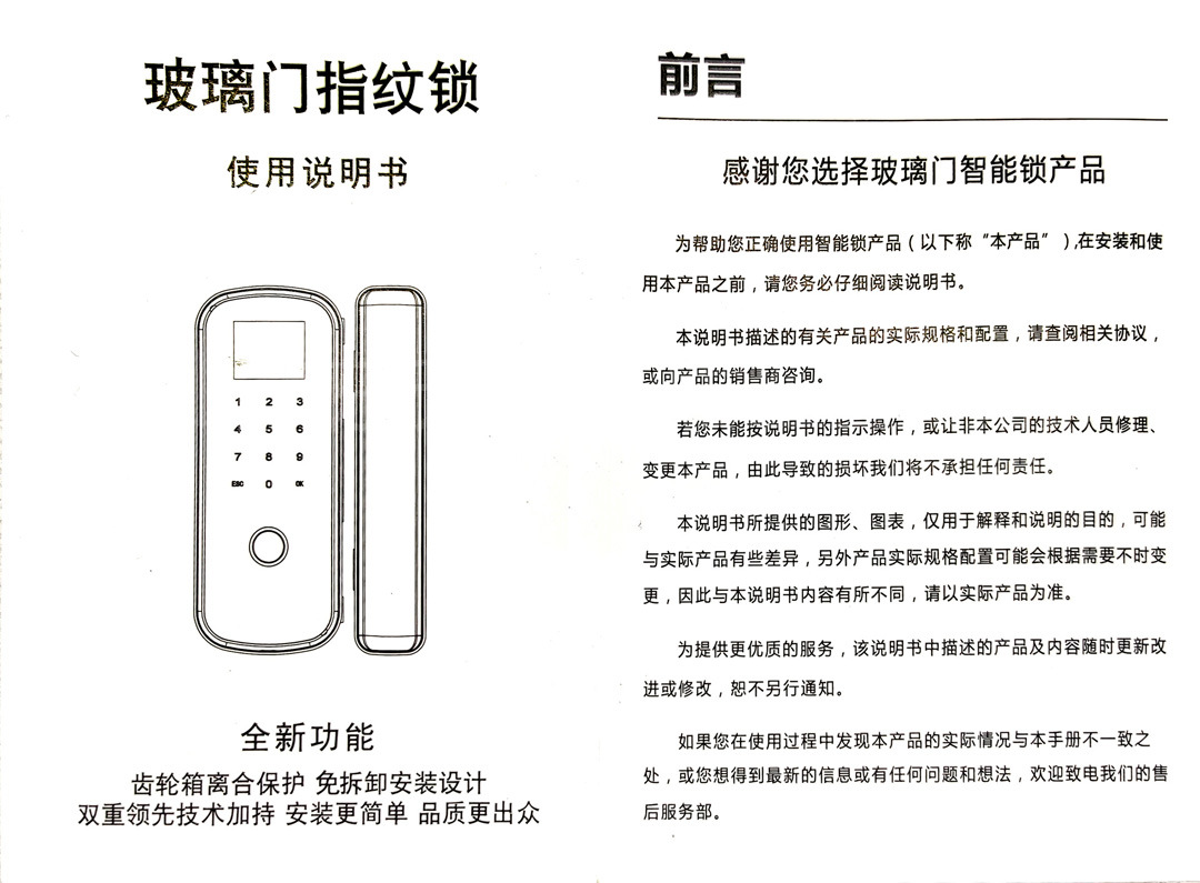 感谢您选择新一代玻璃门智能锁产品,为帮助您正确使用智能锁产品(以下称“本产品”)在安装和使用本产品之前,请您务必仔细阅读说明书。