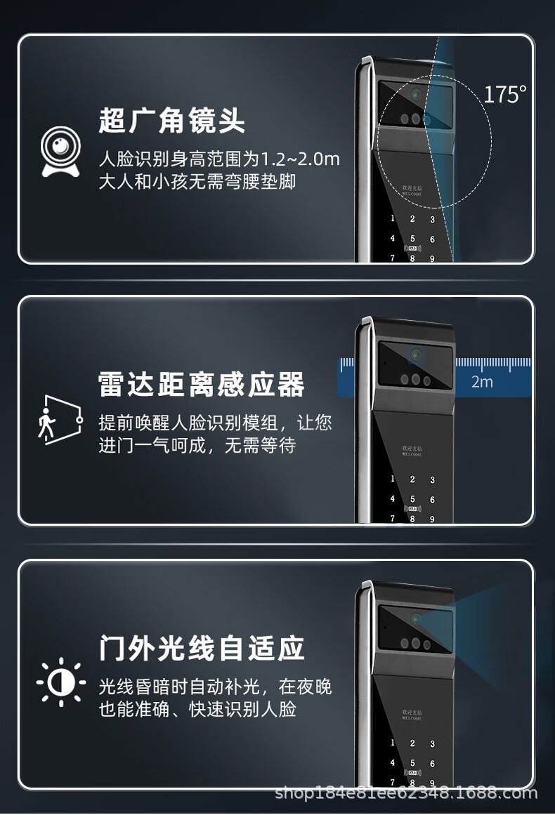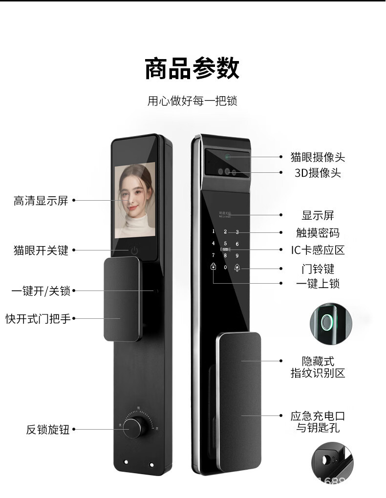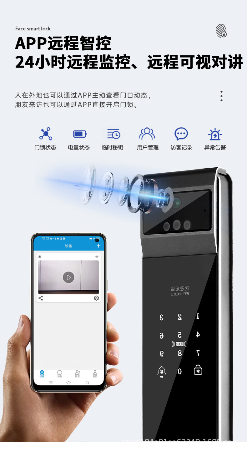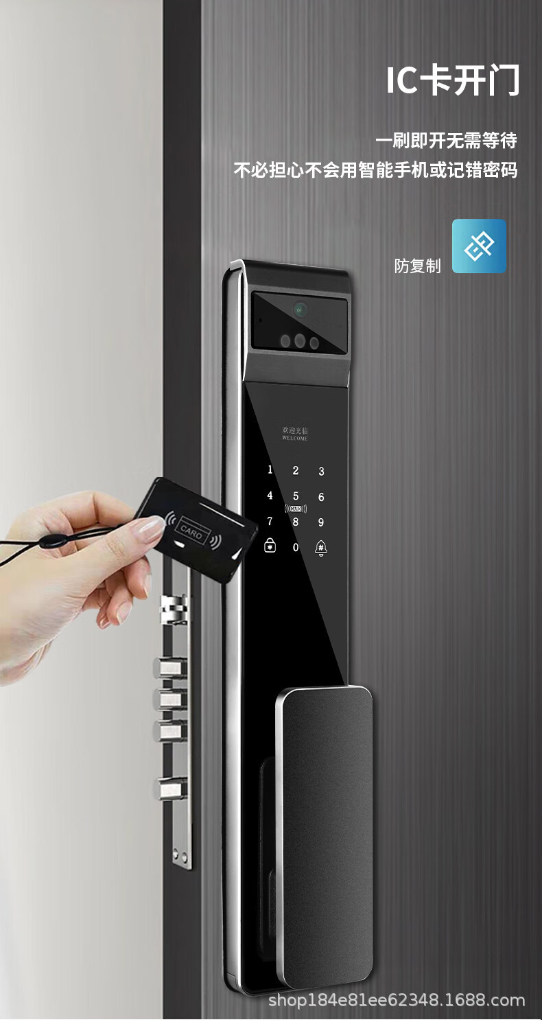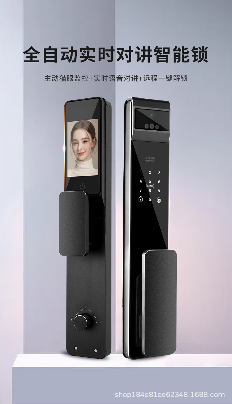 Kunci sidik jari, kata sandi, gesekan kartu, pengenalan wajah yang dirancang dengan halus, interkom jarak jauh rumah waktu nyata, lubang intip masuk ponsel, pintu anti-maling.