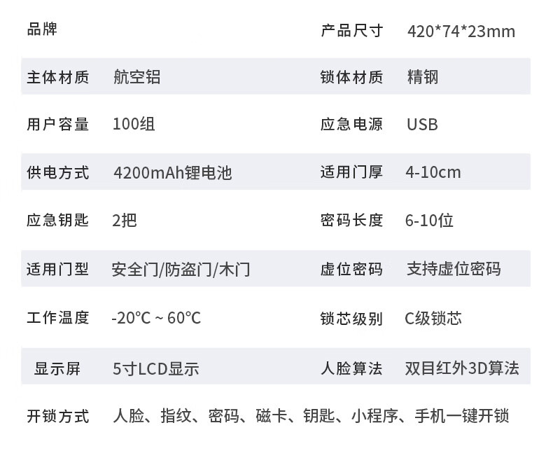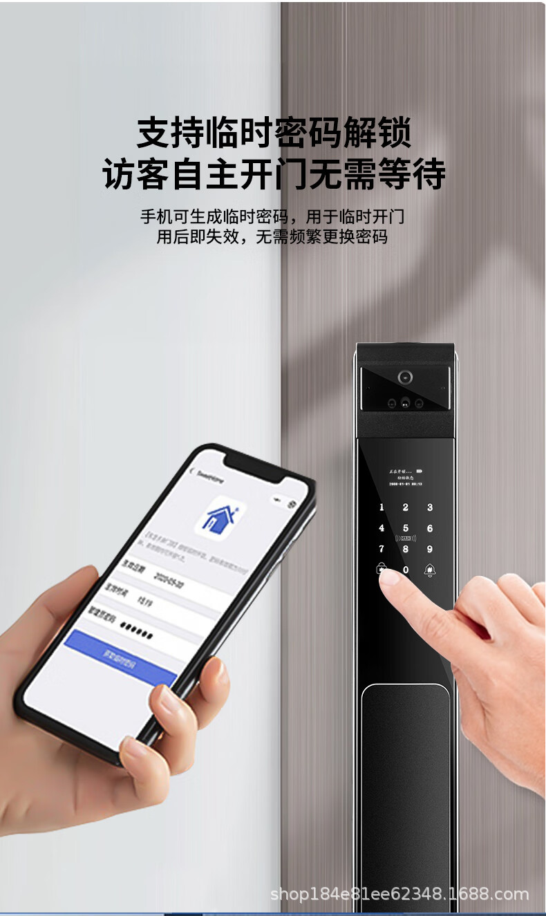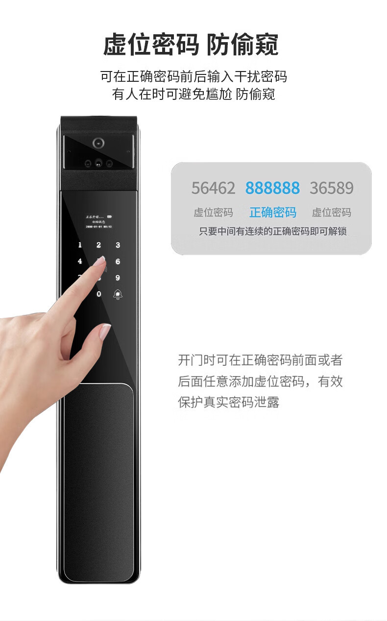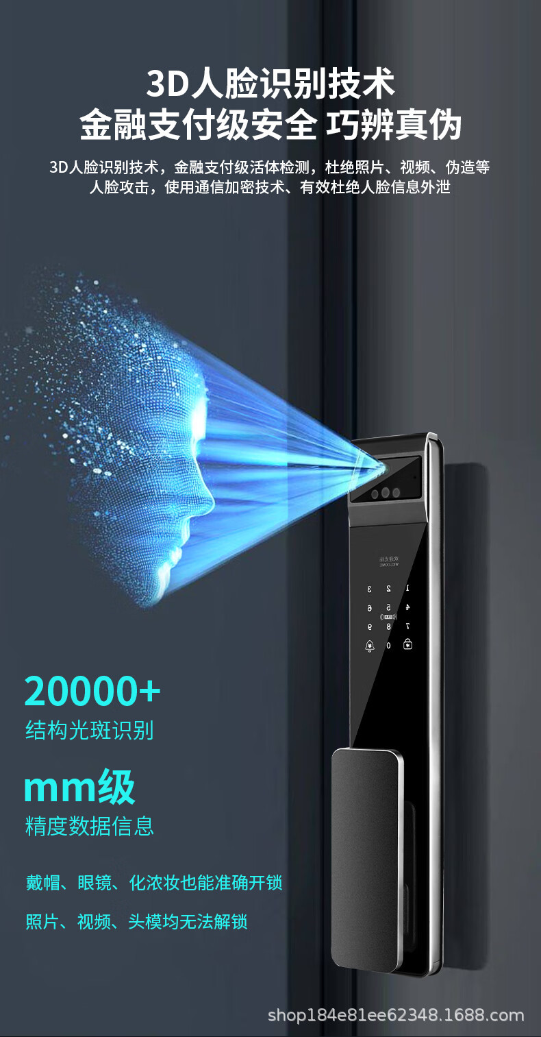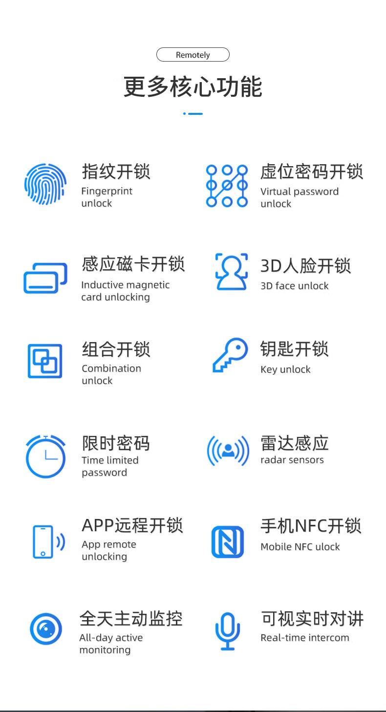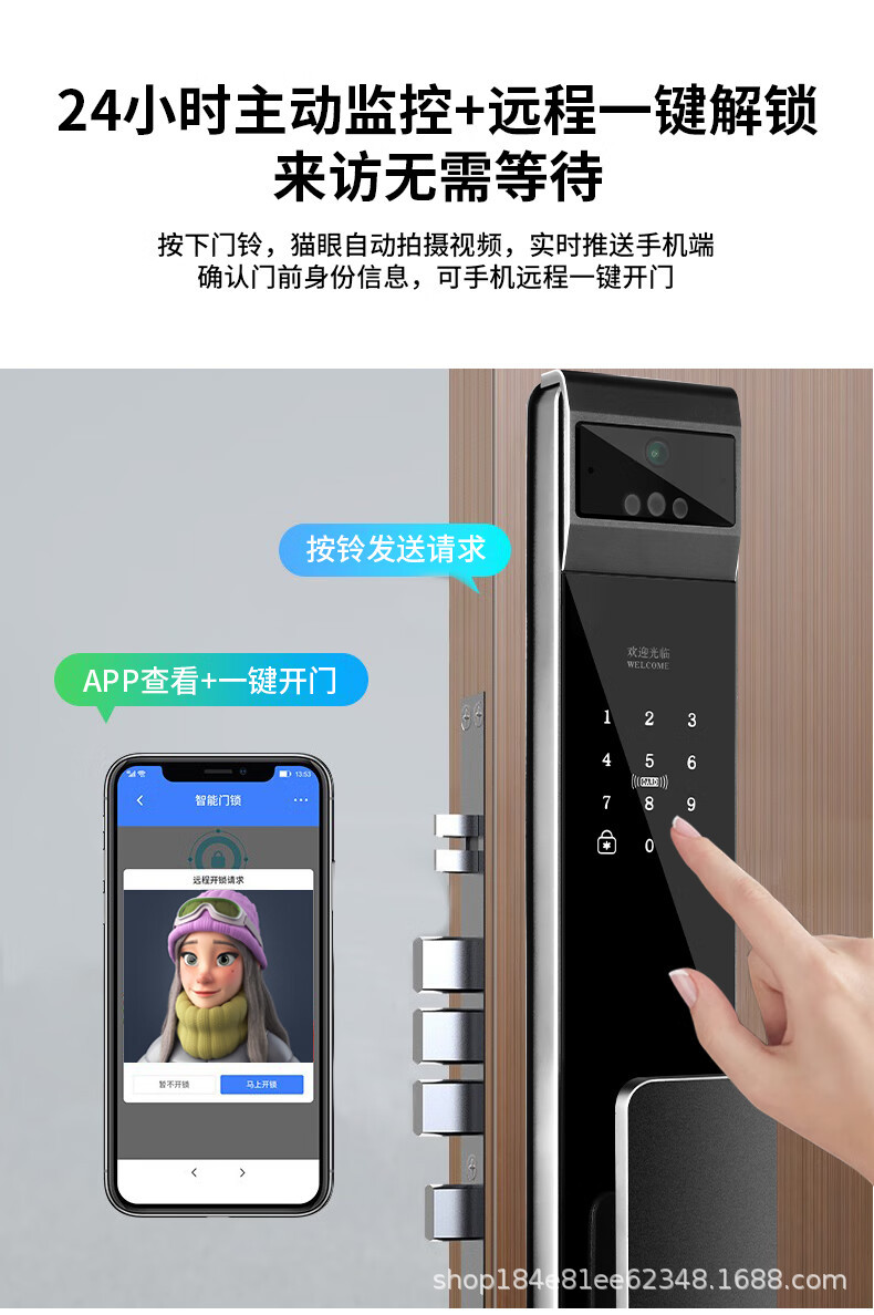 Kunci sidik jari, kata sandi, gesekan kartu, pengenalan wajah yang dirancang dengan halus, interkom jarak jauh rumah waktu nyata, lubang intip masuk ponsel, pintu anti-maling.