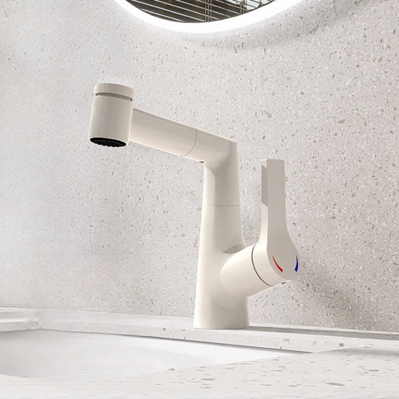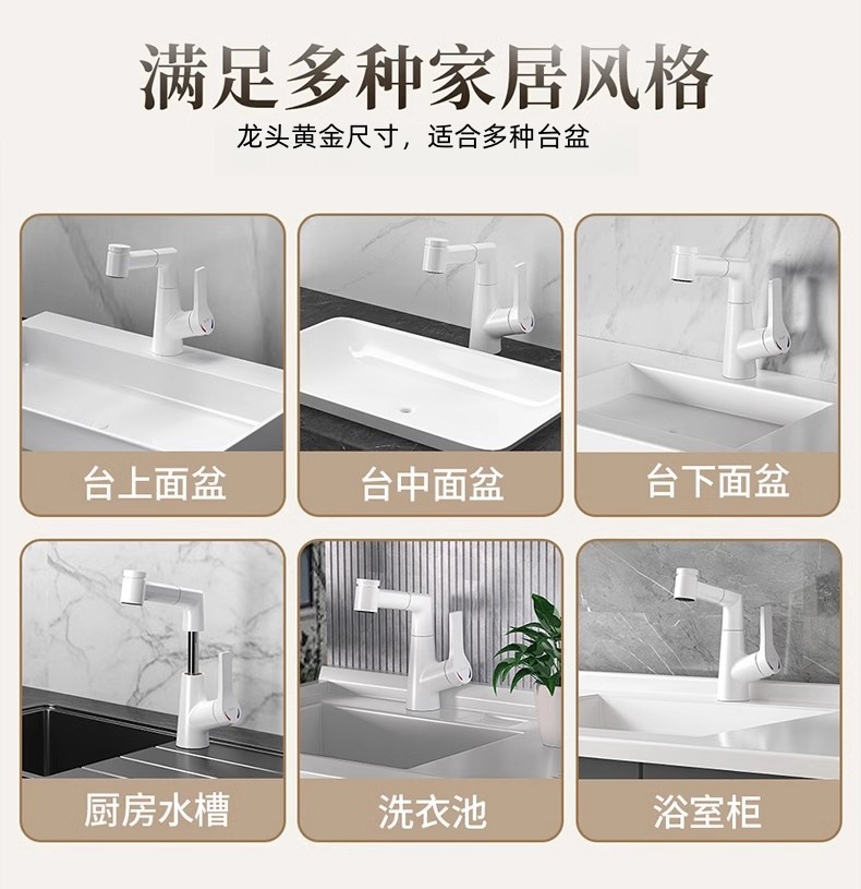 广东白色上出水可升降面盆龙头卫生间洗脸盆冷热铜浴室抽拉水龙头