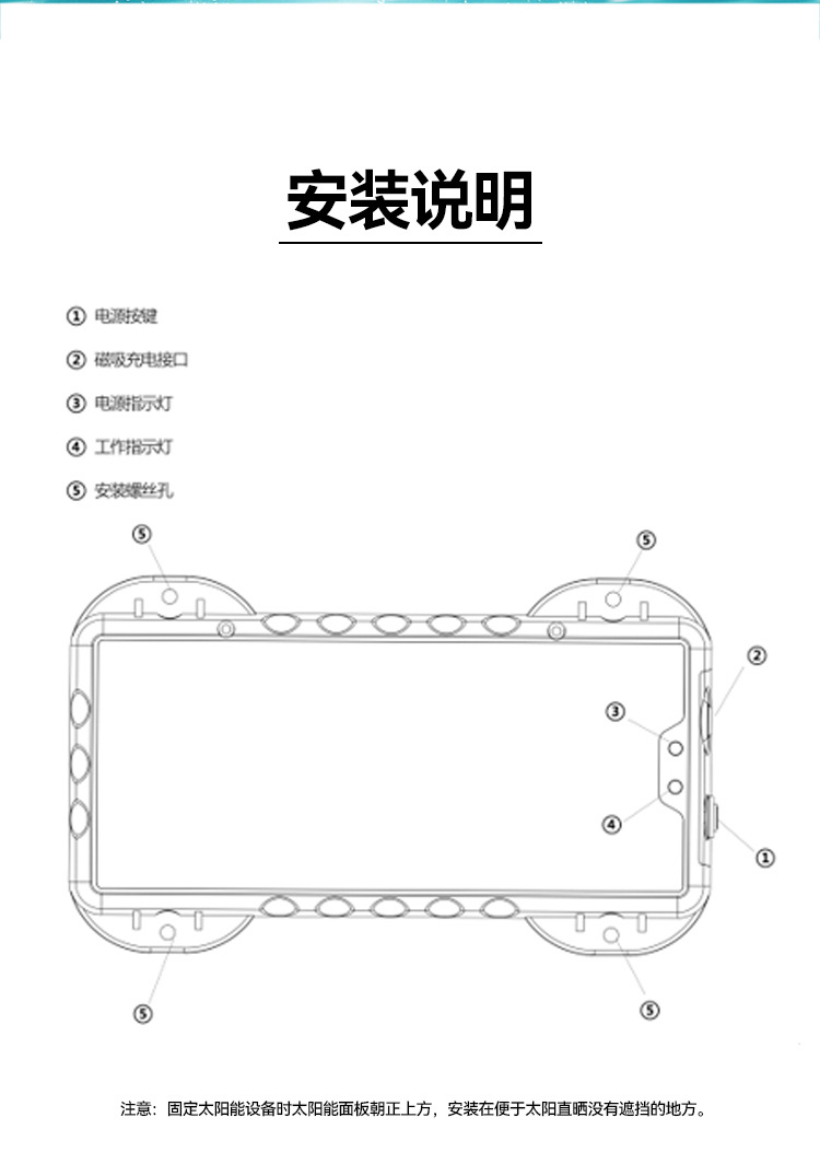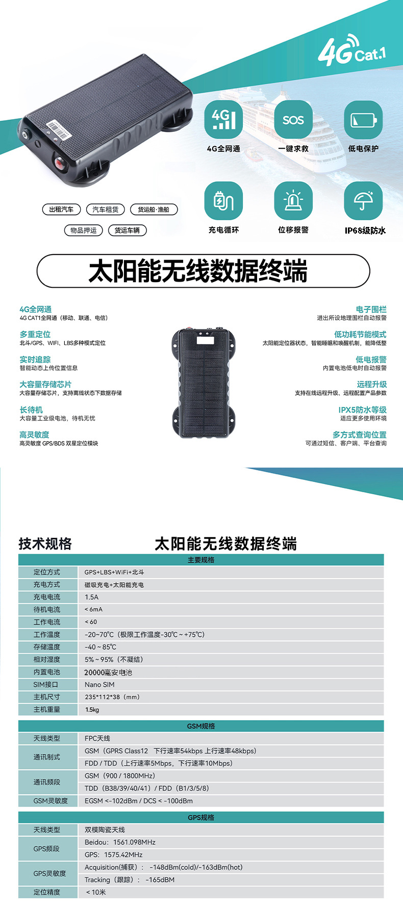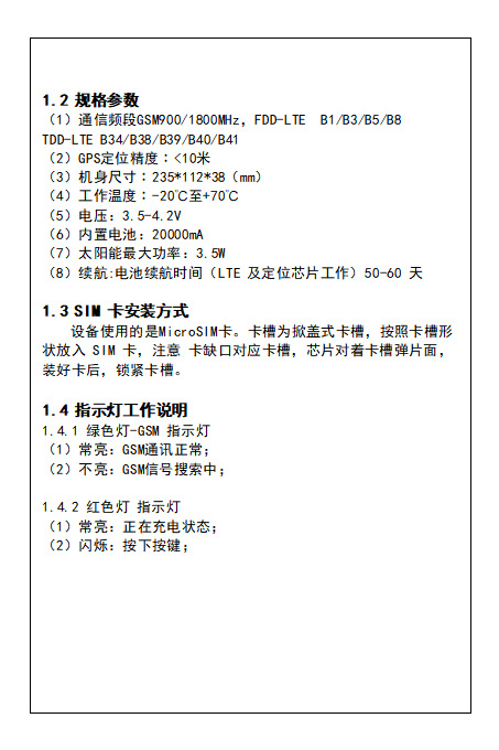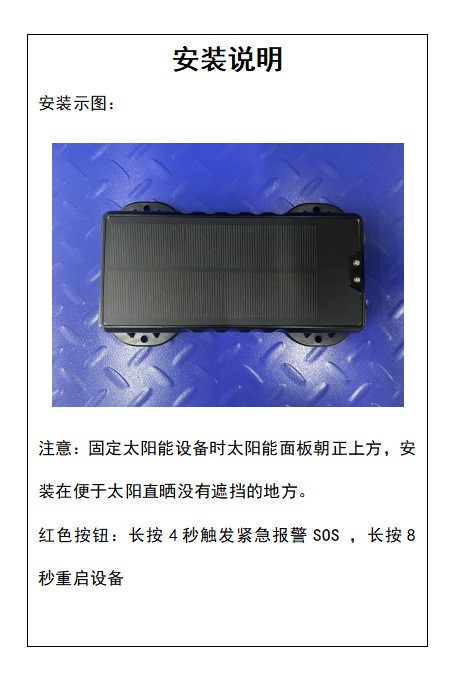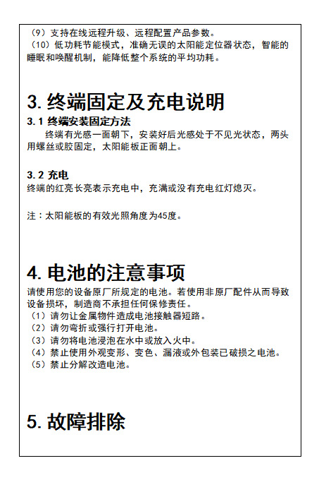 (1)支持 S0S 报警,当电池电里低于 40%,电池进入低电保护,电池电里低于 80%开始太阳能板充电