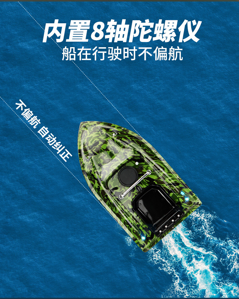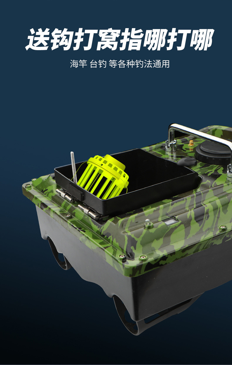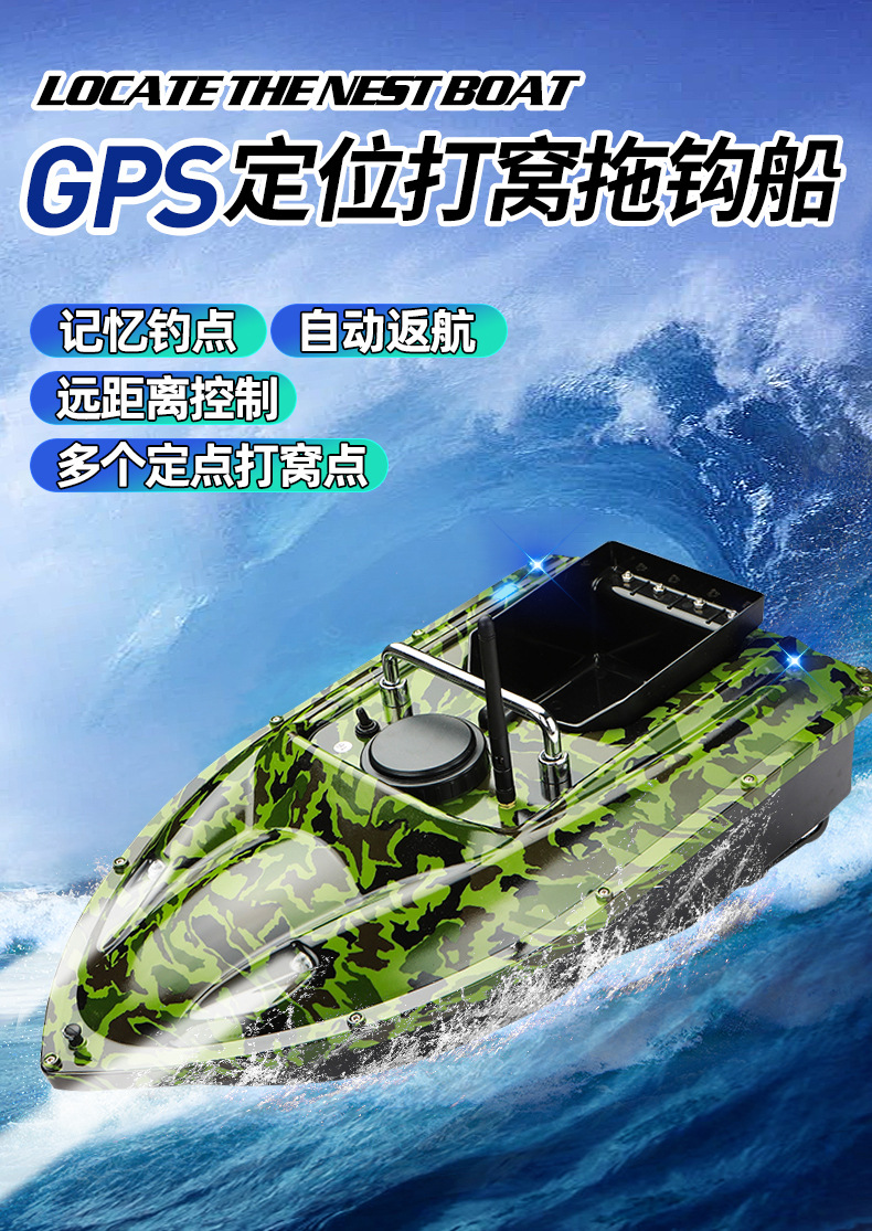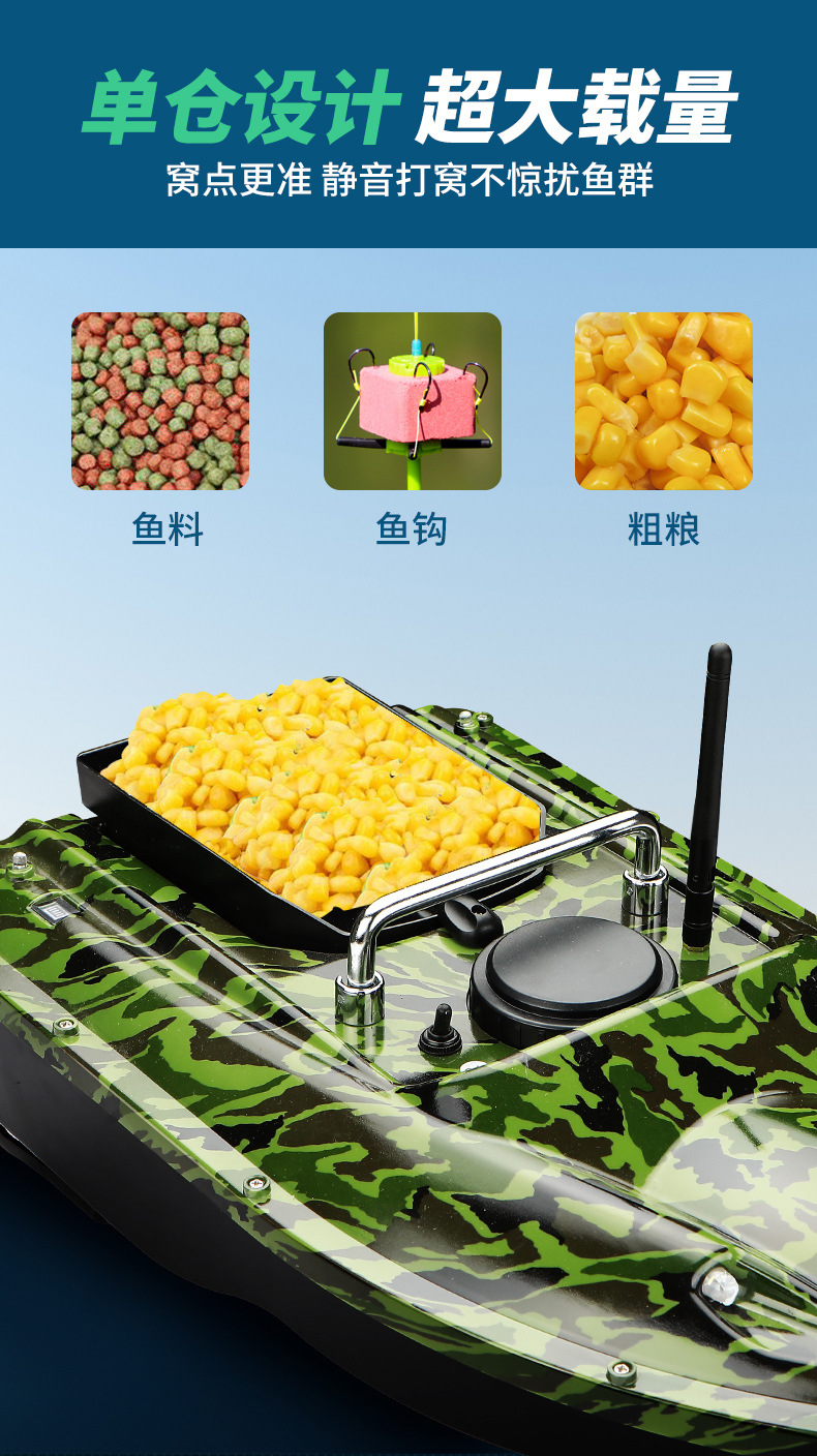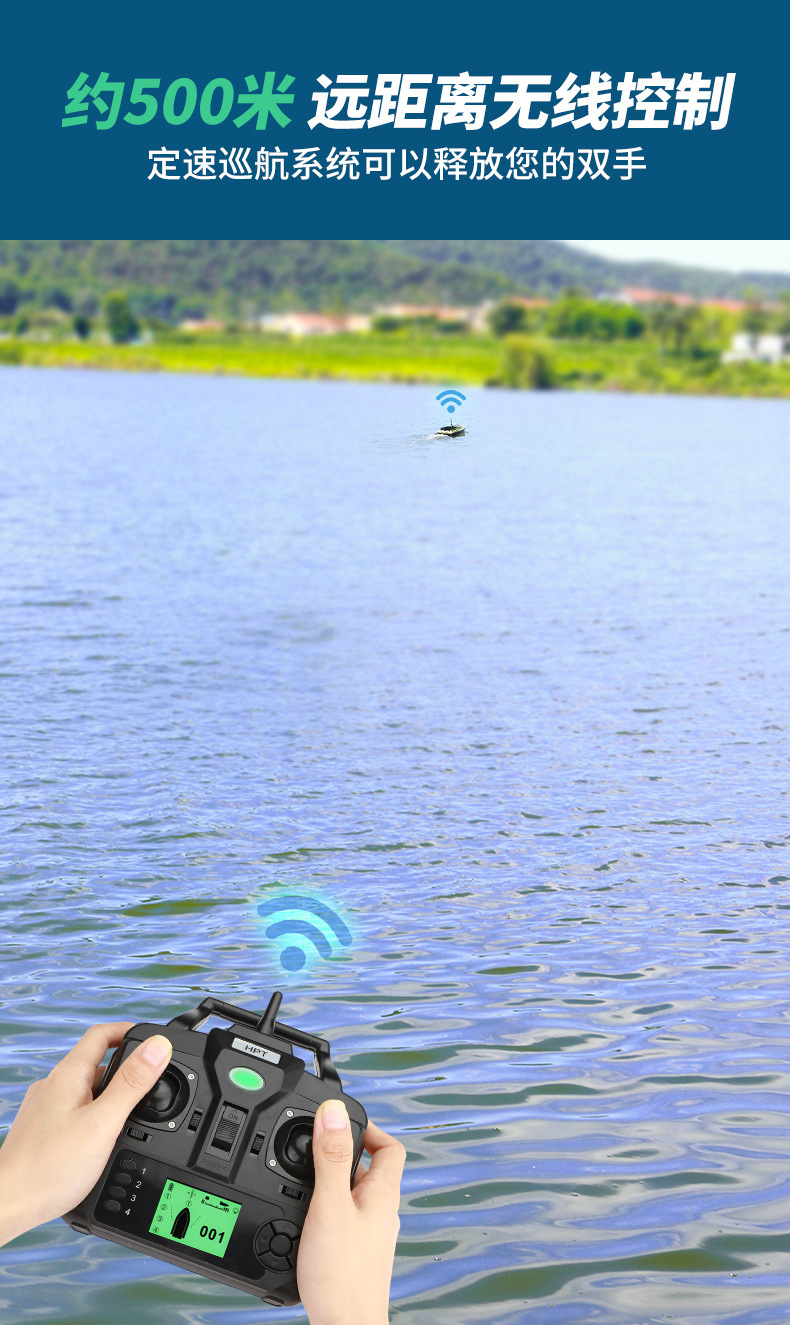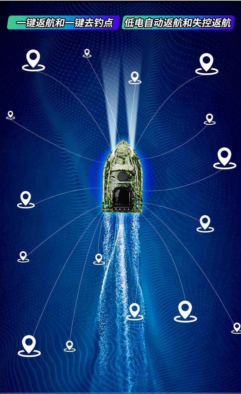 Perahu pancing kendali jarak jauh pintar nirkabel dengan penentuan posisi GPS, jarak lempar 500 meter, fitur kembalian otomatis, dan kemampuan memancing di malam hari.