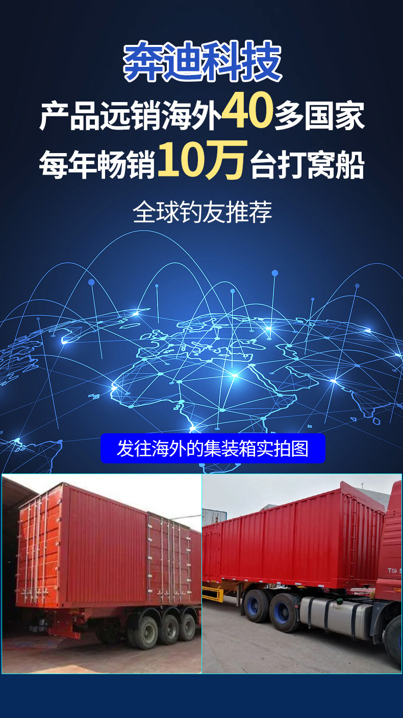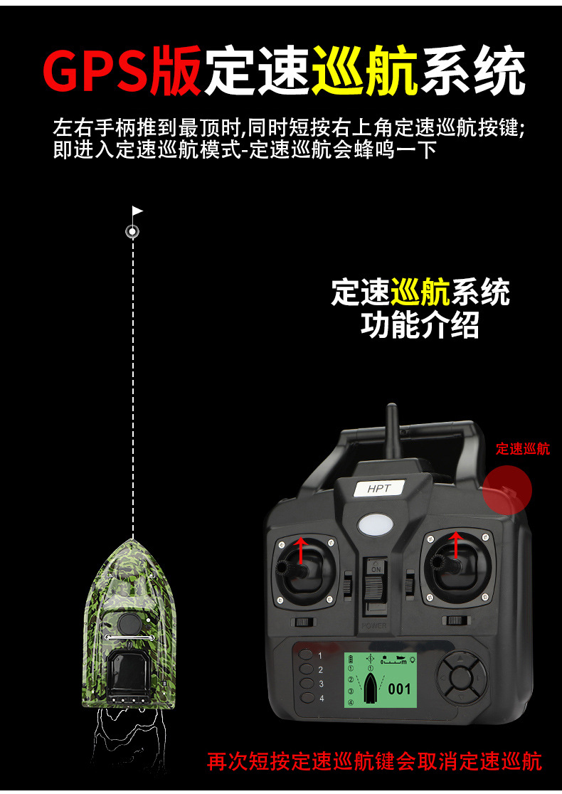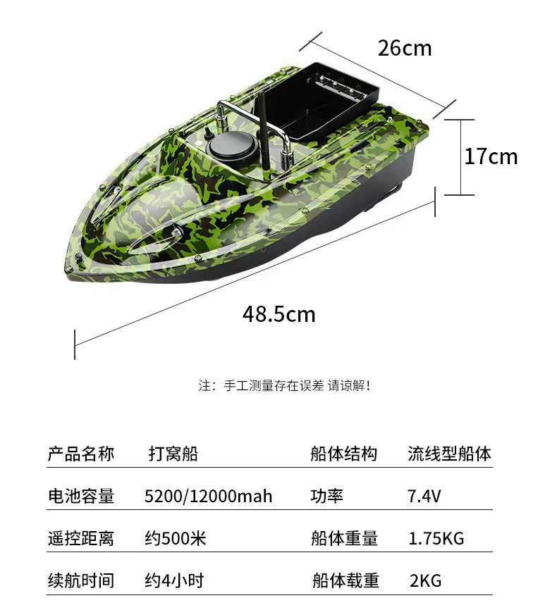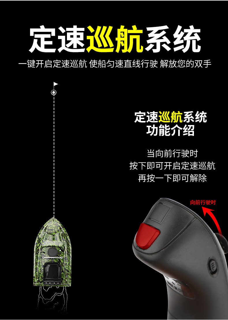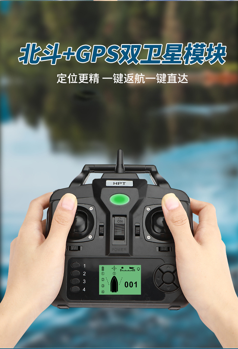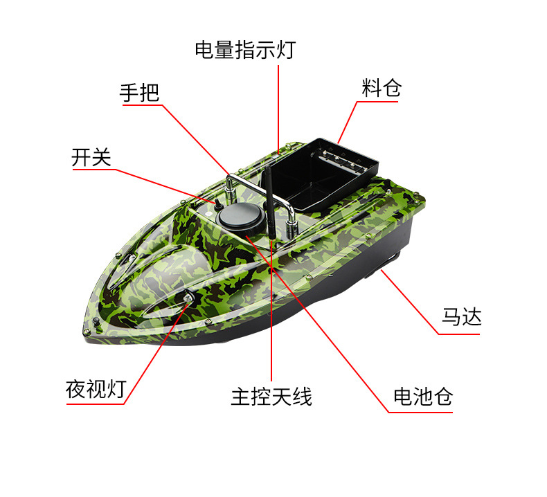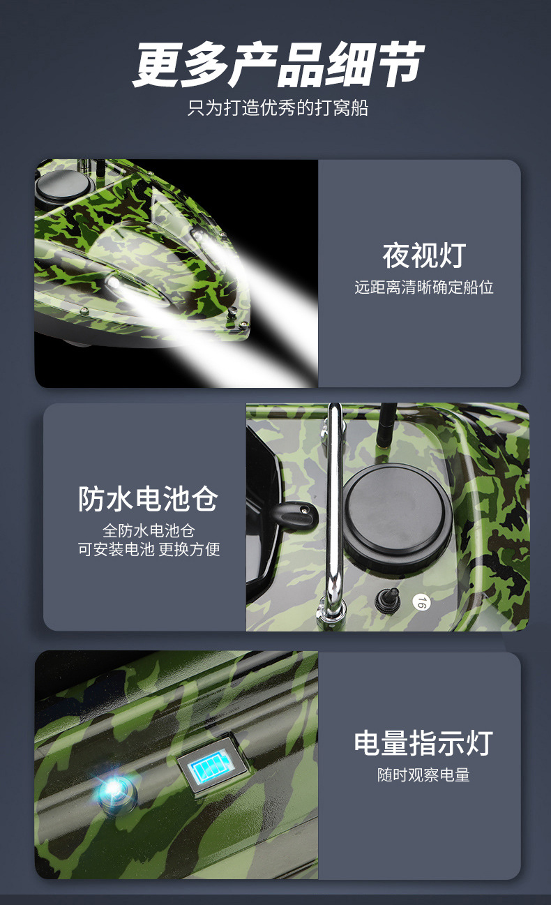 Perahu pancing kendali jarak jauh pintar nirkabel dengan penentuan posisi GPS, jarak lempar 500 meter, fitur kembalian otomatis, dan kemampuan memancing di malam hari.