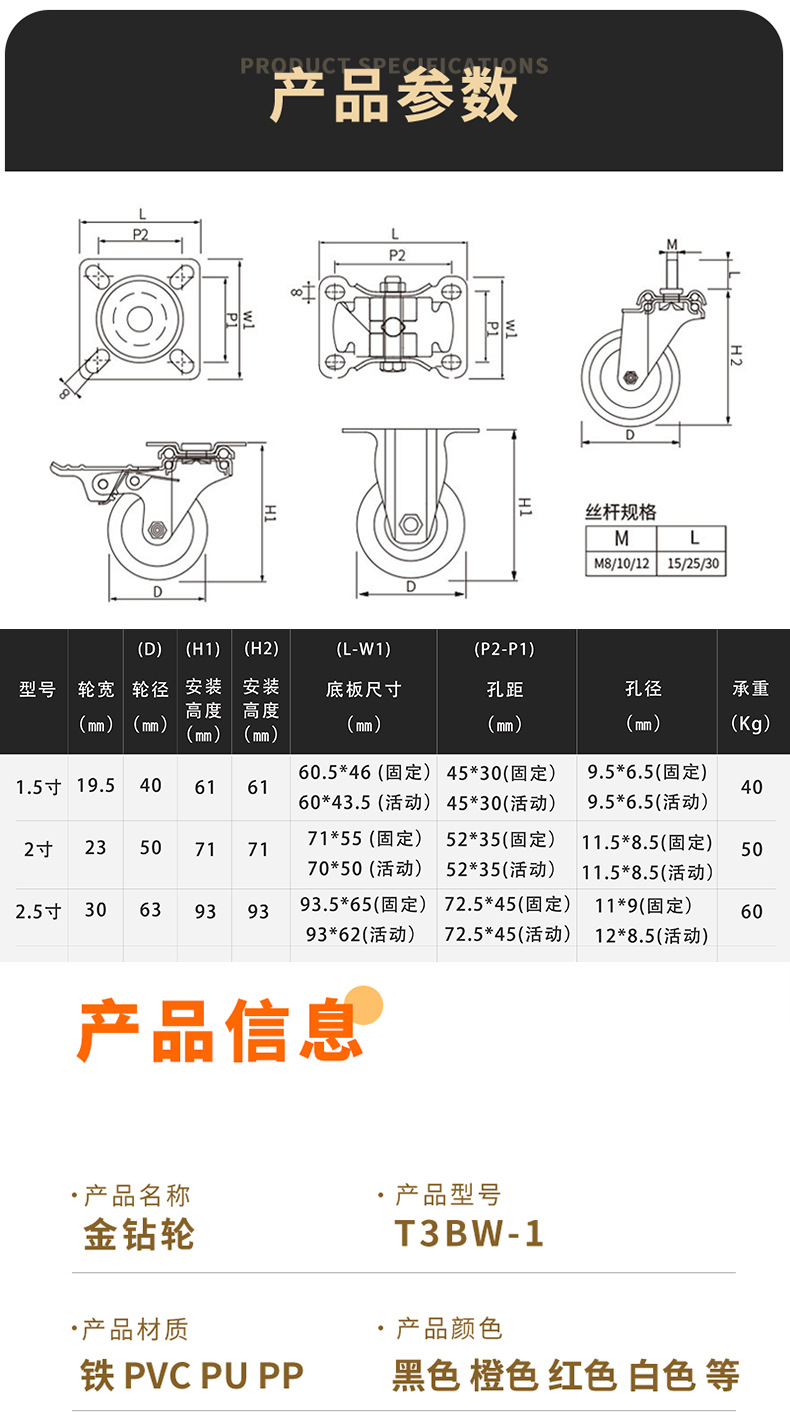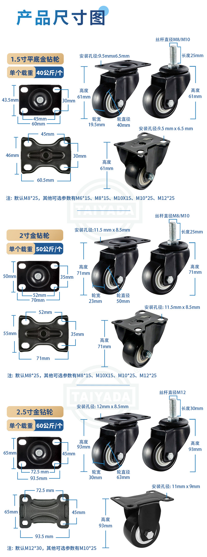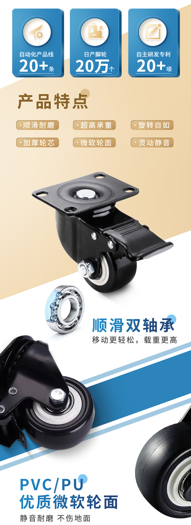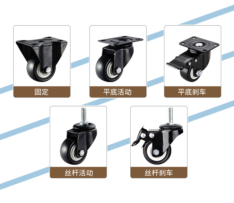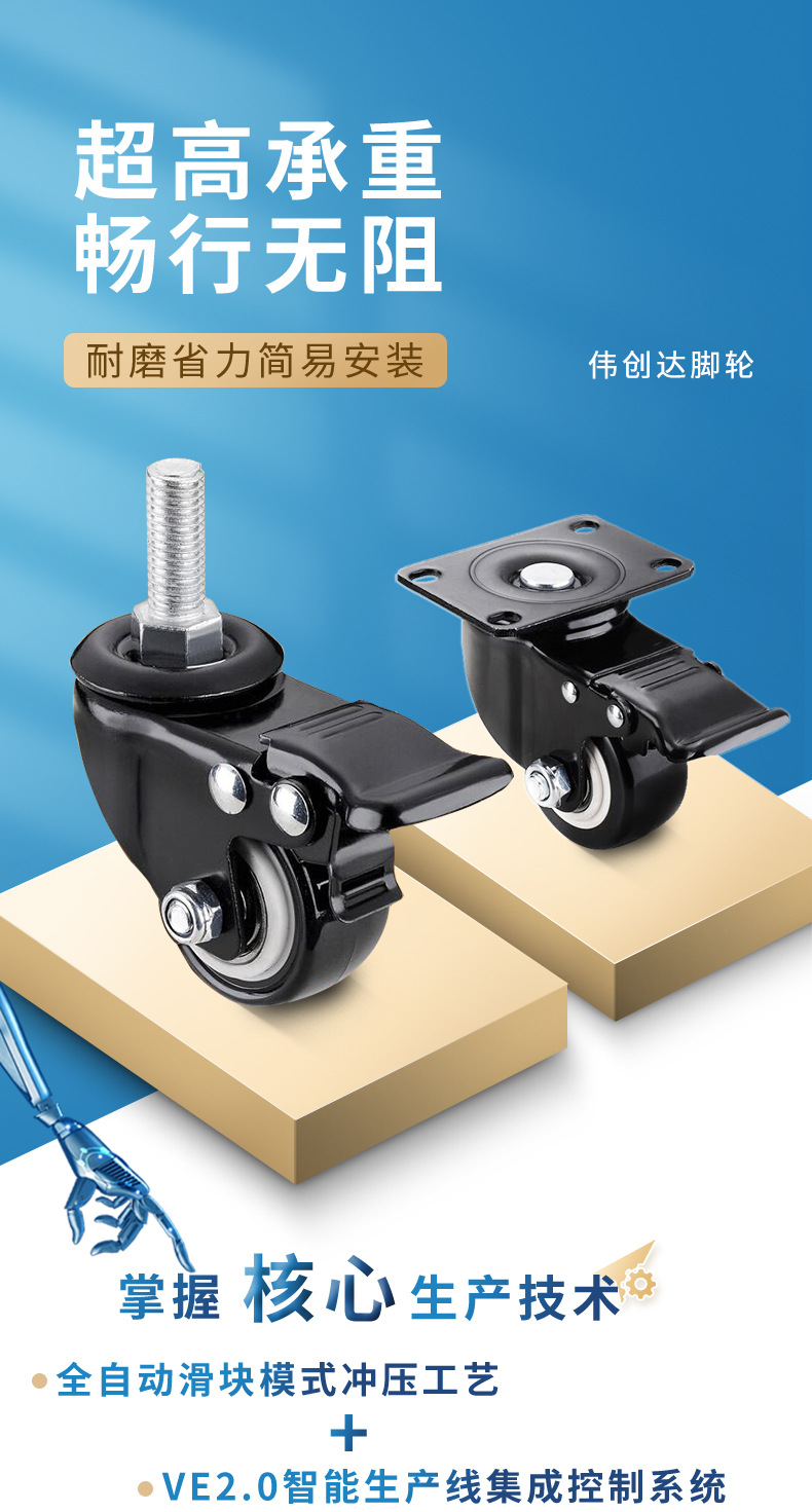 Penjualan langsung pabrik roda beroda putar 1,5 inci 2 inci dengan roda berlian emas, batang sekrup, roda furnitur, roda troli kecil, roda universal dengan rem