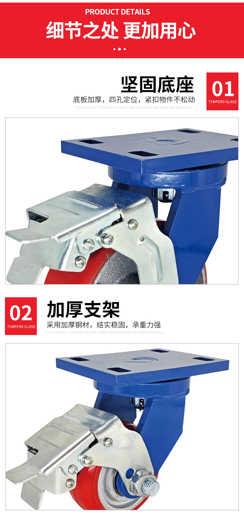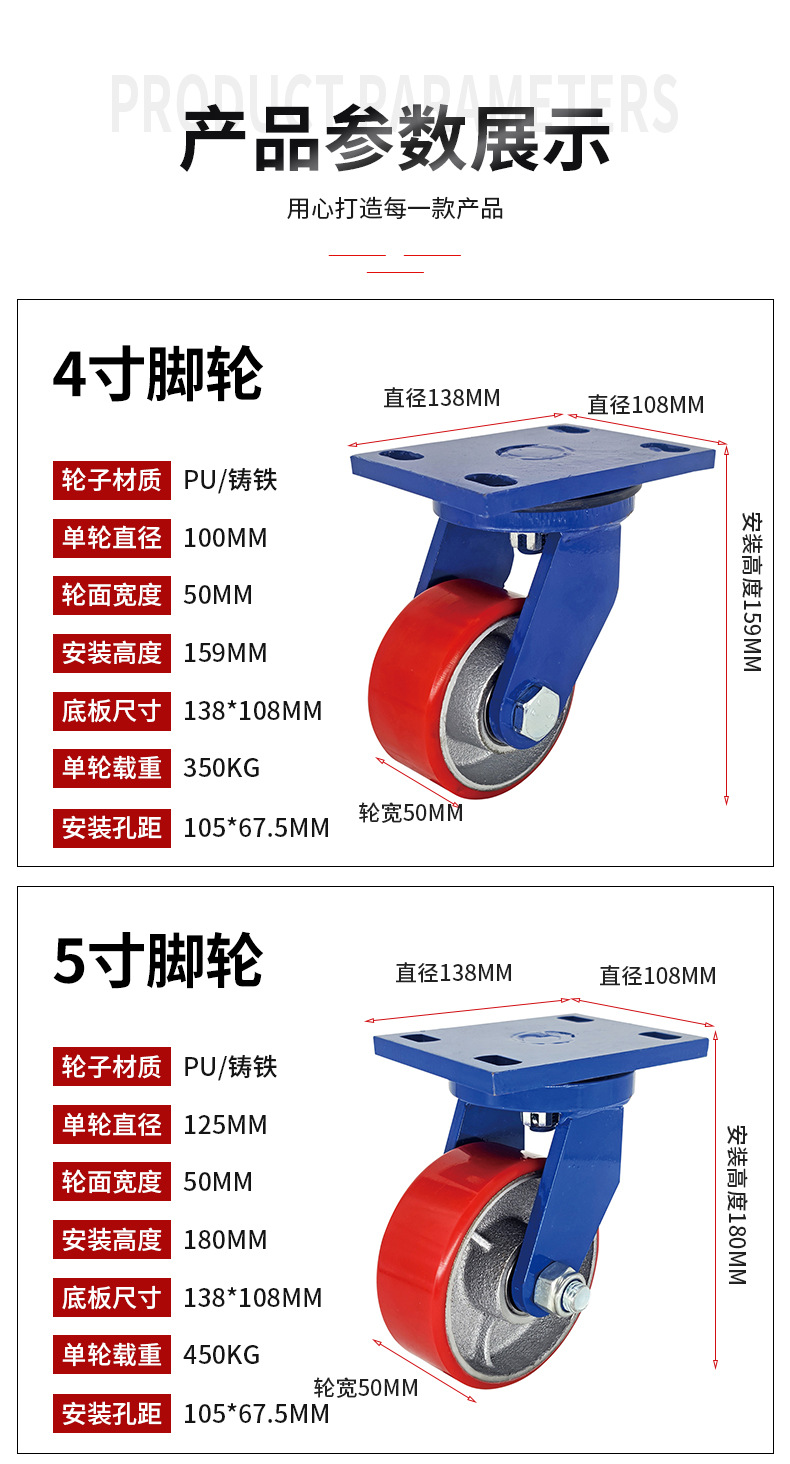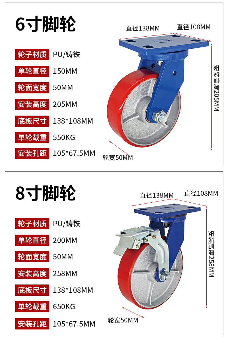 Roda Polyurethane PU 4-inci 6-inci 8-inci dengan inti besi, roda universal untuk gerobak bergerak, kastor tahan aus kelas industri