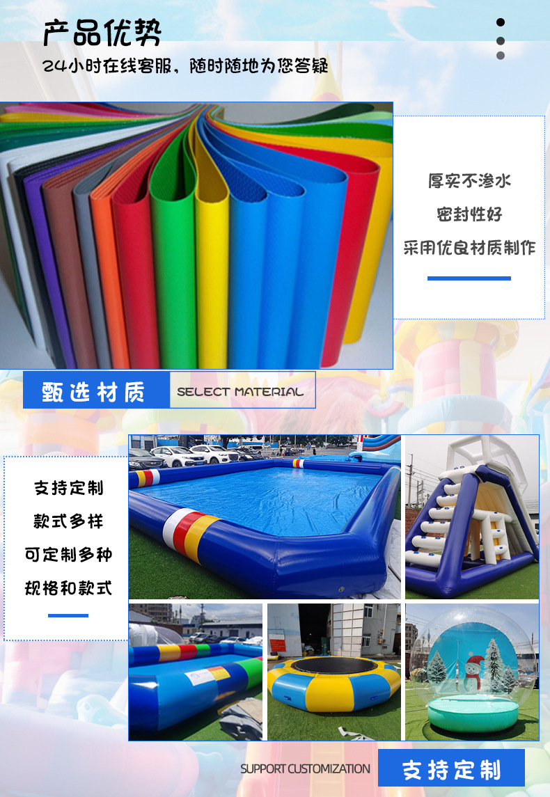 2、本产品材料:用加网PVC制成。此材料为一种专业的充气布,耐寒性好,可达零下40度低温;阻燃性好,离明火5秒内自熄,没有损害。我们使用的材料为夹网PVC布料,由技术监督局检测结果显示此材料对皮肤无刺激性,无毒性对儿童没有损害,绝对能放心使用。