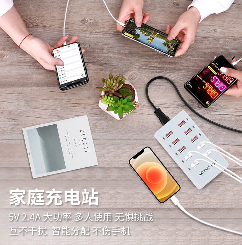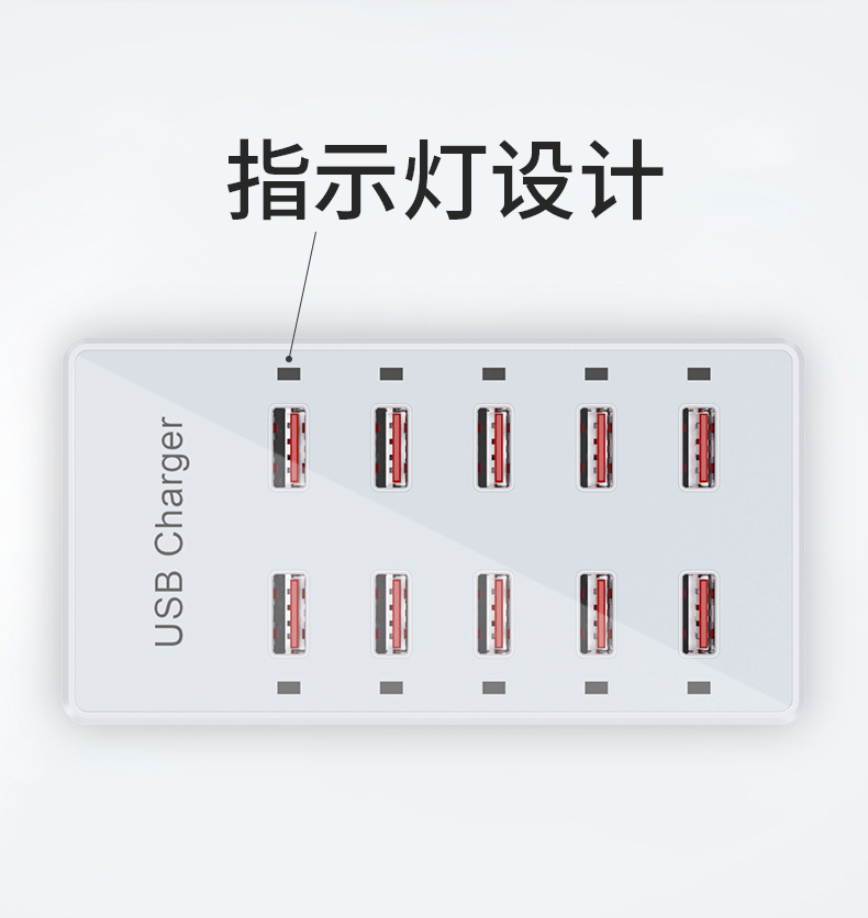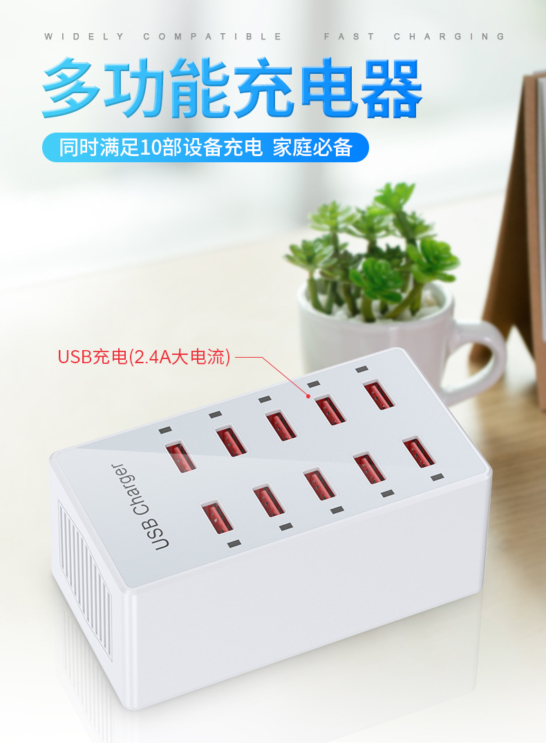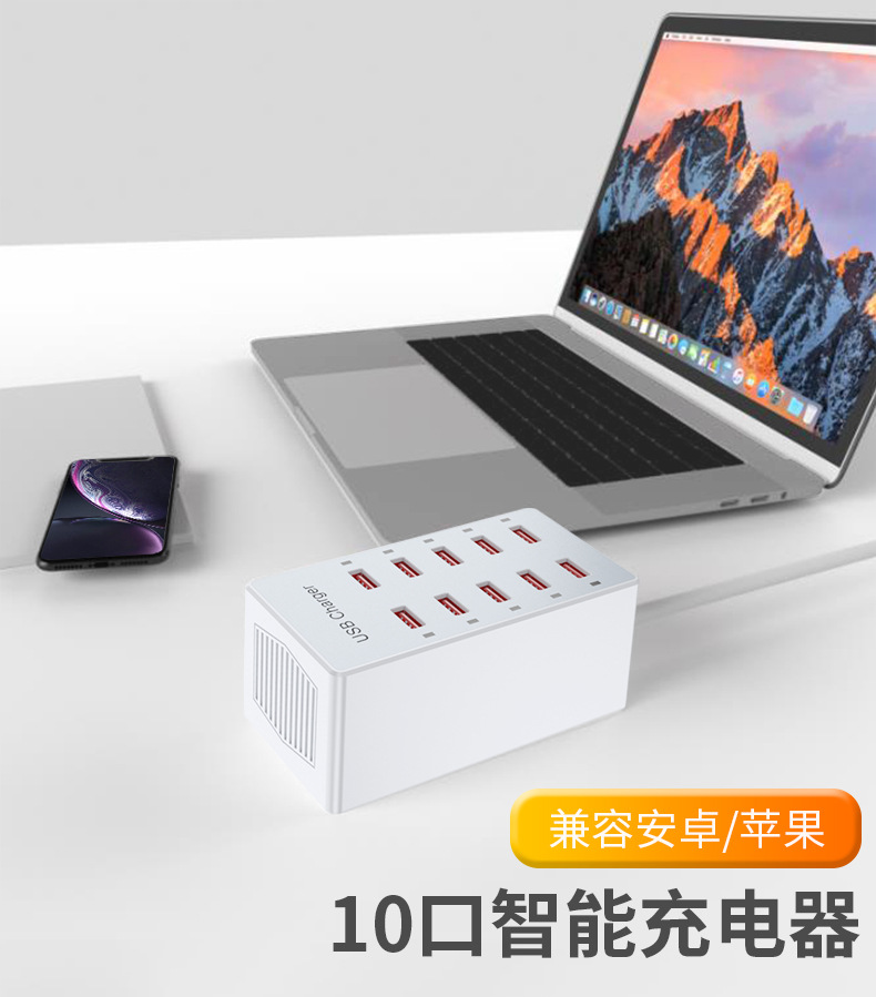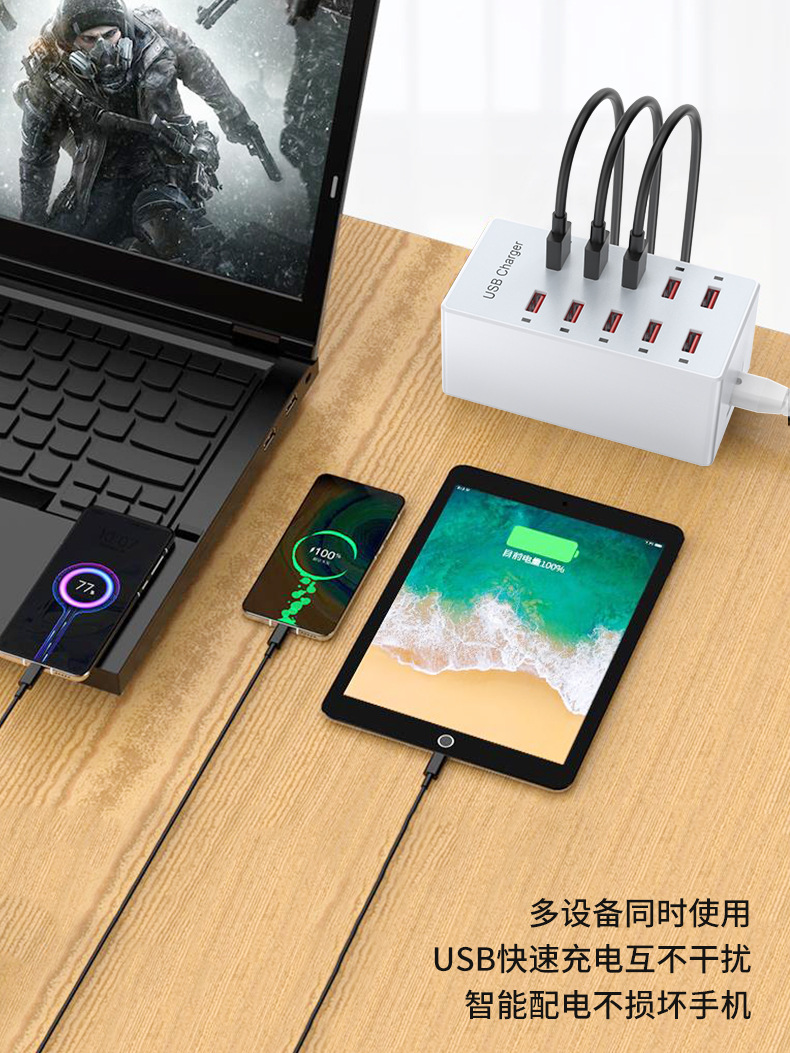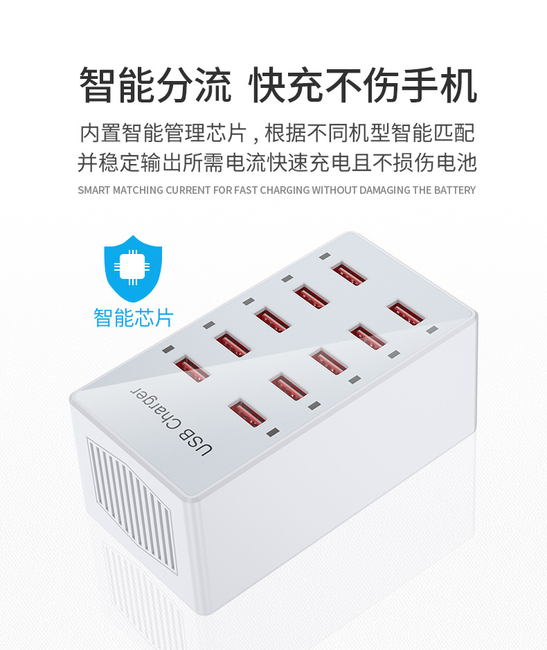Pengisi daya multi-port USB 10 port 60W, soket multi-port ponsel, stasiun pengisian daya desktop, cocok untuk Huawei, Apple, Xiaomi