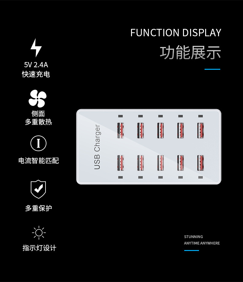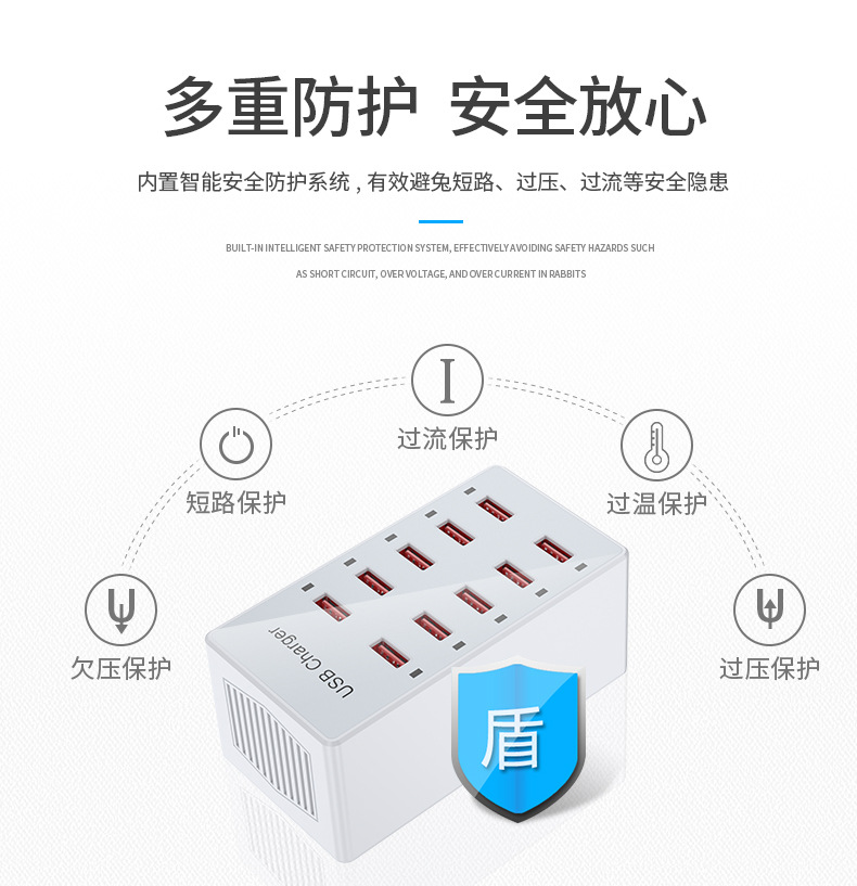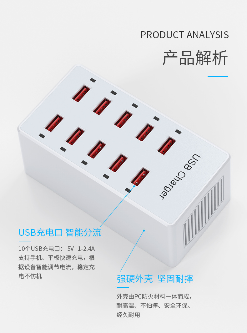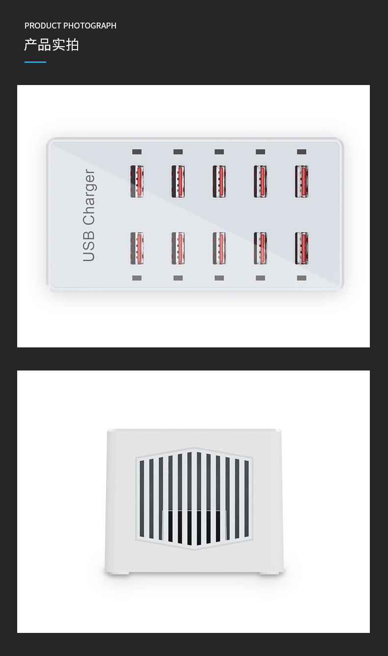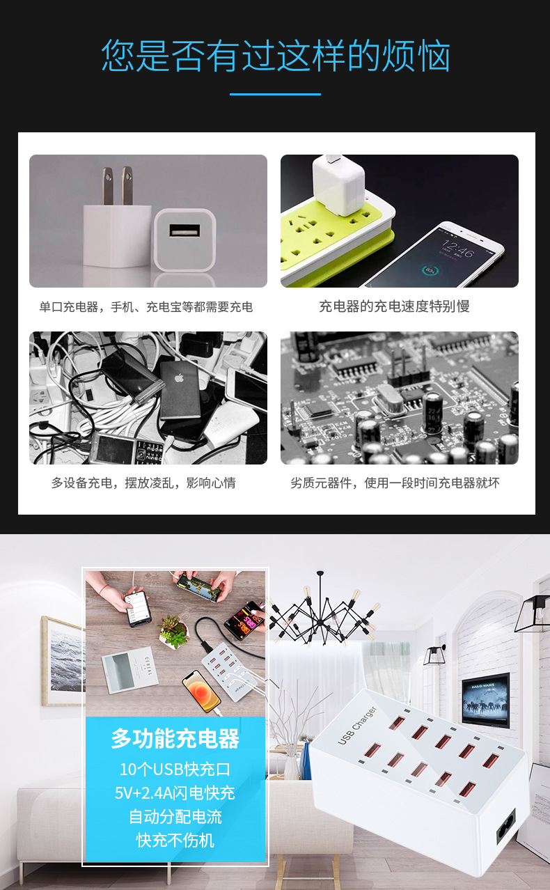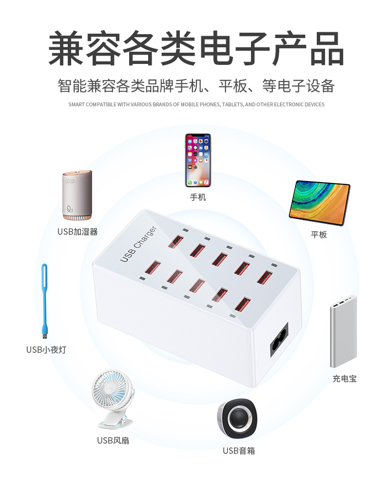 Pengisi daya multi-port USB 10 port 60W, soket multi-port ponsel, stasiun pengisian daya desktop, cocok untuk Huawei, Apple, Xiaomi