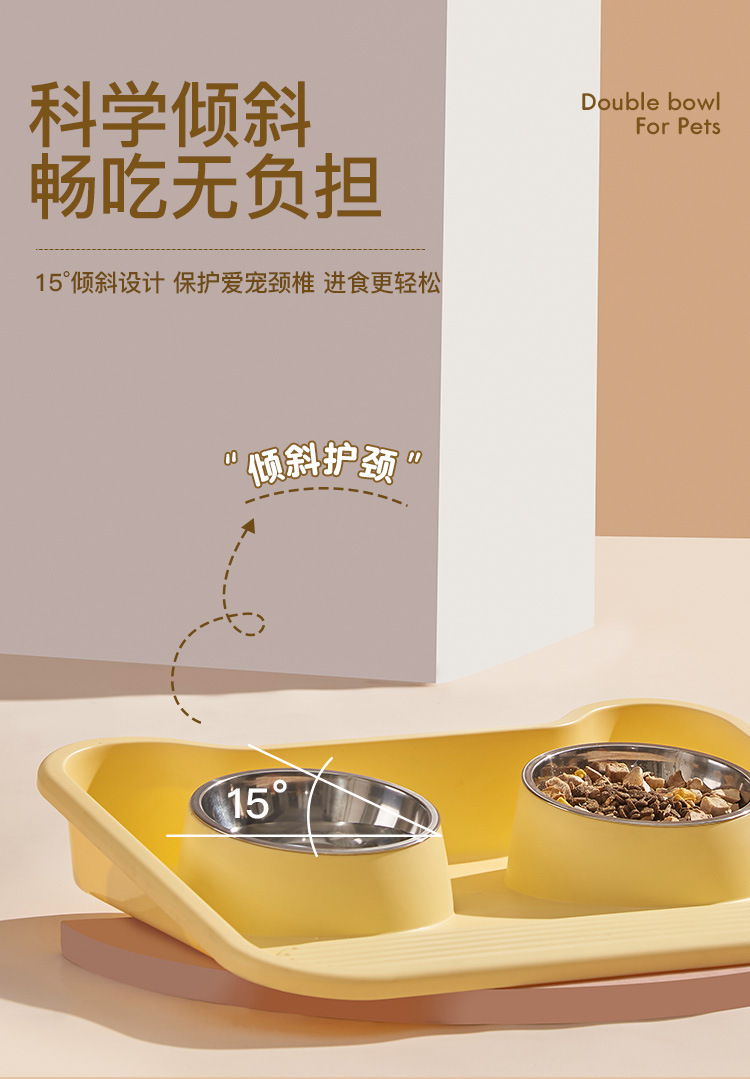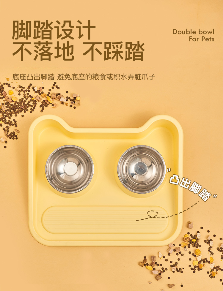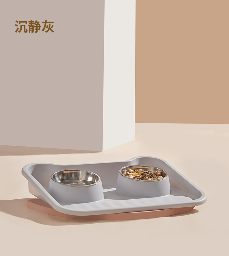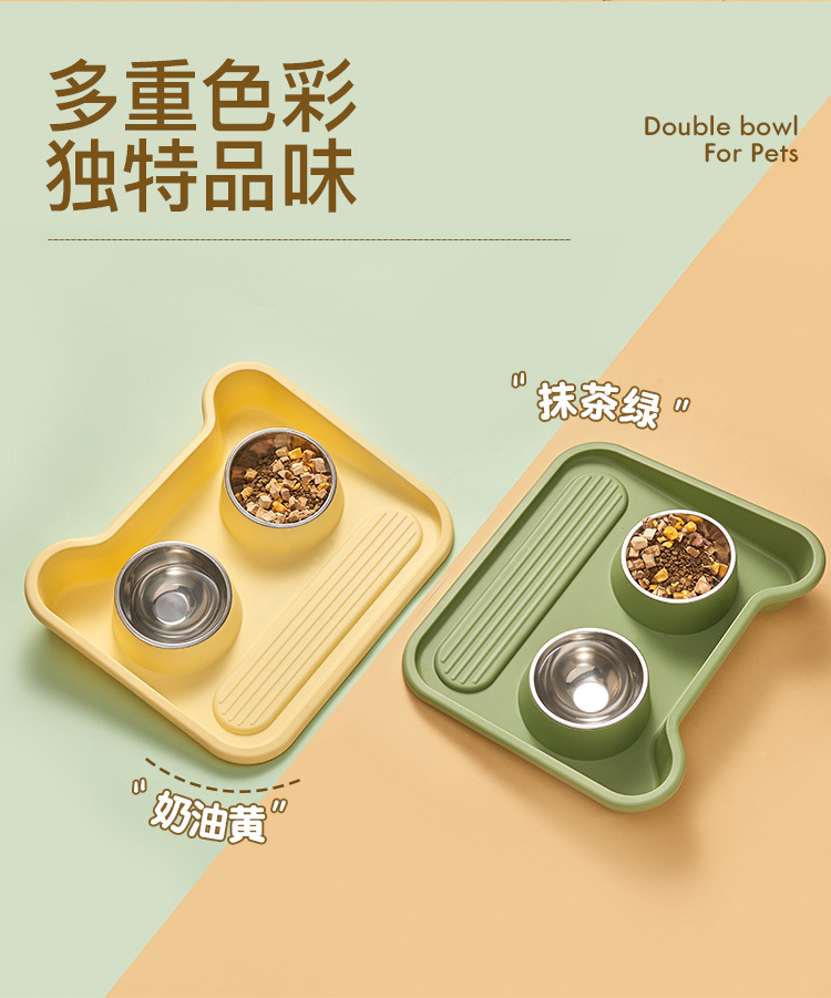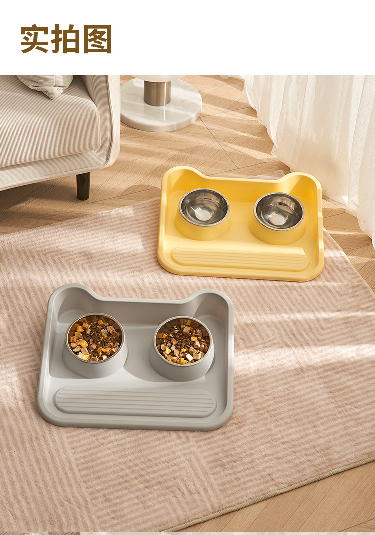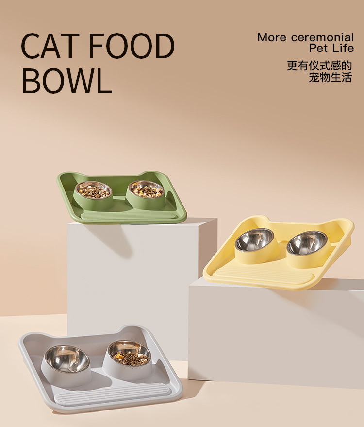 Set makanan kucing dan anjing, perlindungan leher miring anti bocor dua mangkuk set makanan plastik stainless steel piring hewan peliharaan mangkuk makanan anjing