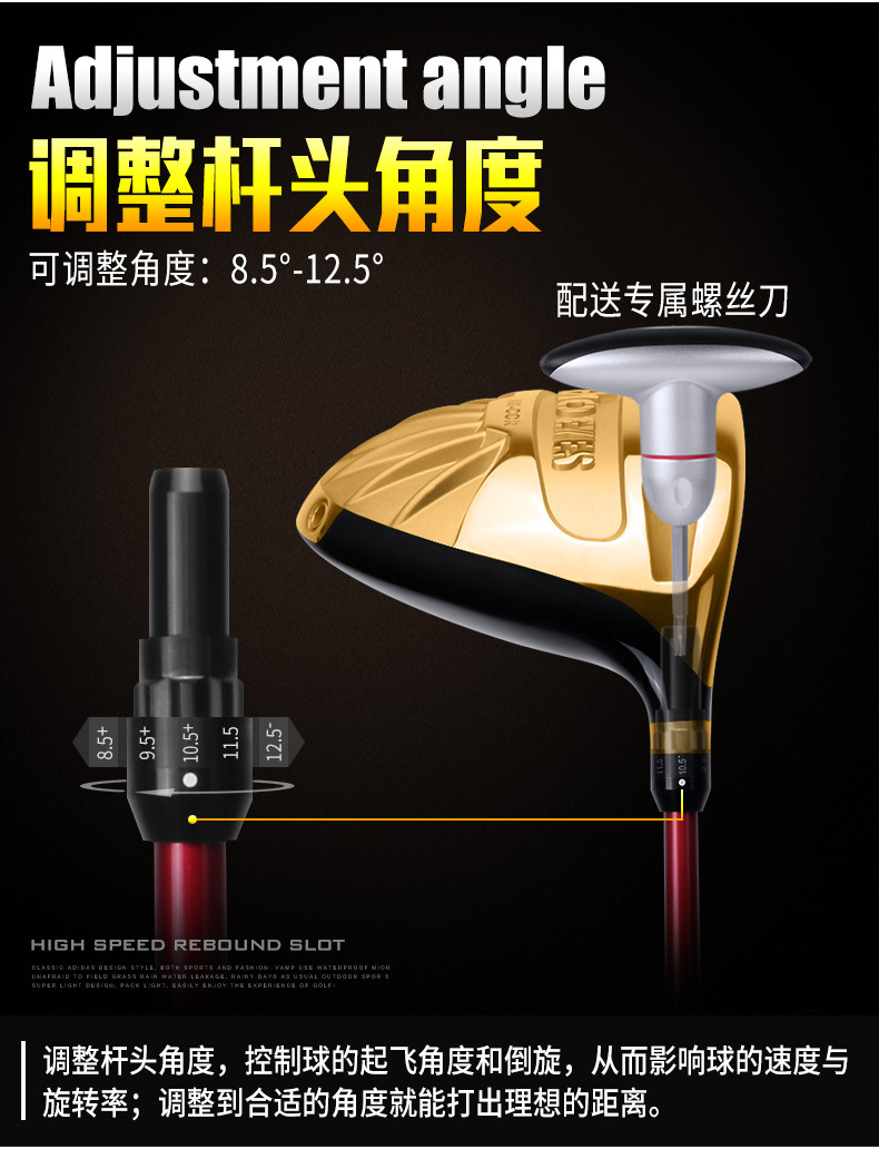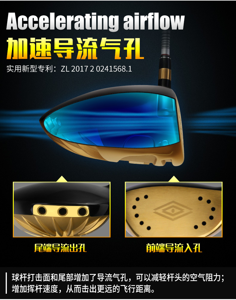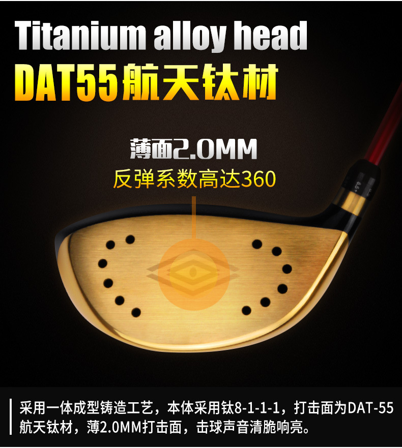 | 产品介绍 | 魔眼一号木:1.加速导流气孔,减轻杆头阻力 ; 2.一号木钛材打击面,本体使用钛合金,实现高反弹 ; 3.可调整杆头角度,可更换杆身; | |||