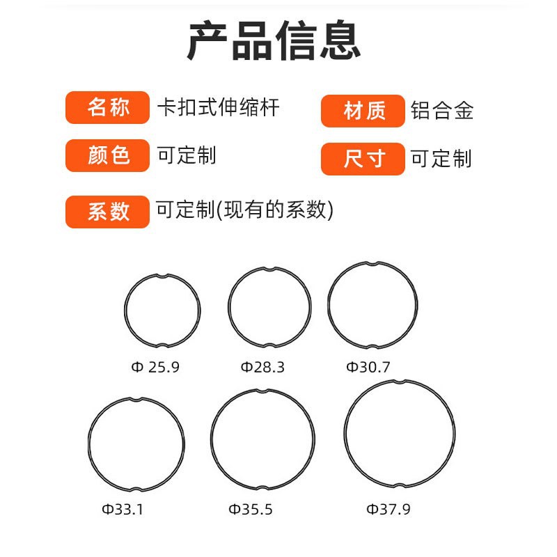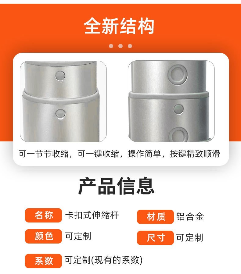 Tongkat selfie snap-on paduan aluminium tabung teleskopik yang disesuaikan dengan batang teleskopik snap-on alur ganda bawaan batang tombol tekan pelepasan cepat