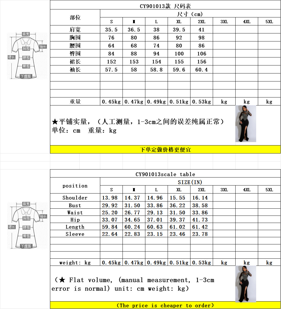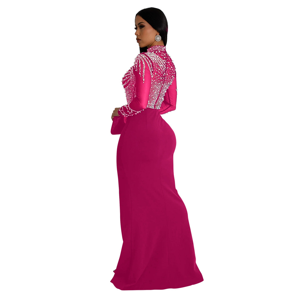 Gaun lengan panjang CY901013, gaya Eropa dan Amerika leher bulat lengan panjang belahan tinggi berlian imitasi panas gaun perspektif wanita warna solid pesta gaun malam
