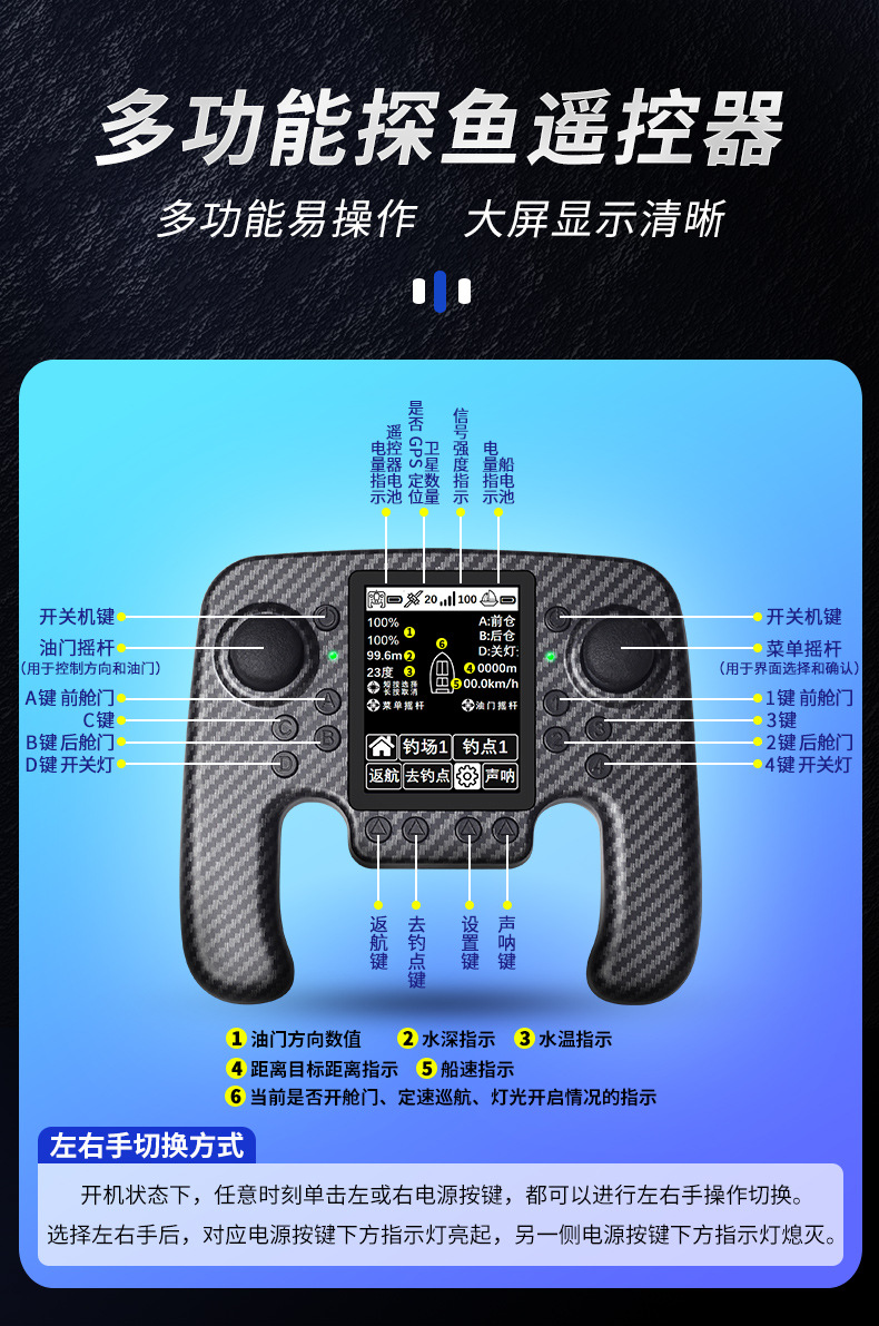 Perahu pancing dengan sumber posisi GPS, pengiriman umpan, penarikan umpan, penarikan jaring, kembali otomatis 500 meter, perahu kendali jarak jauh berdaya tinggi 12V.