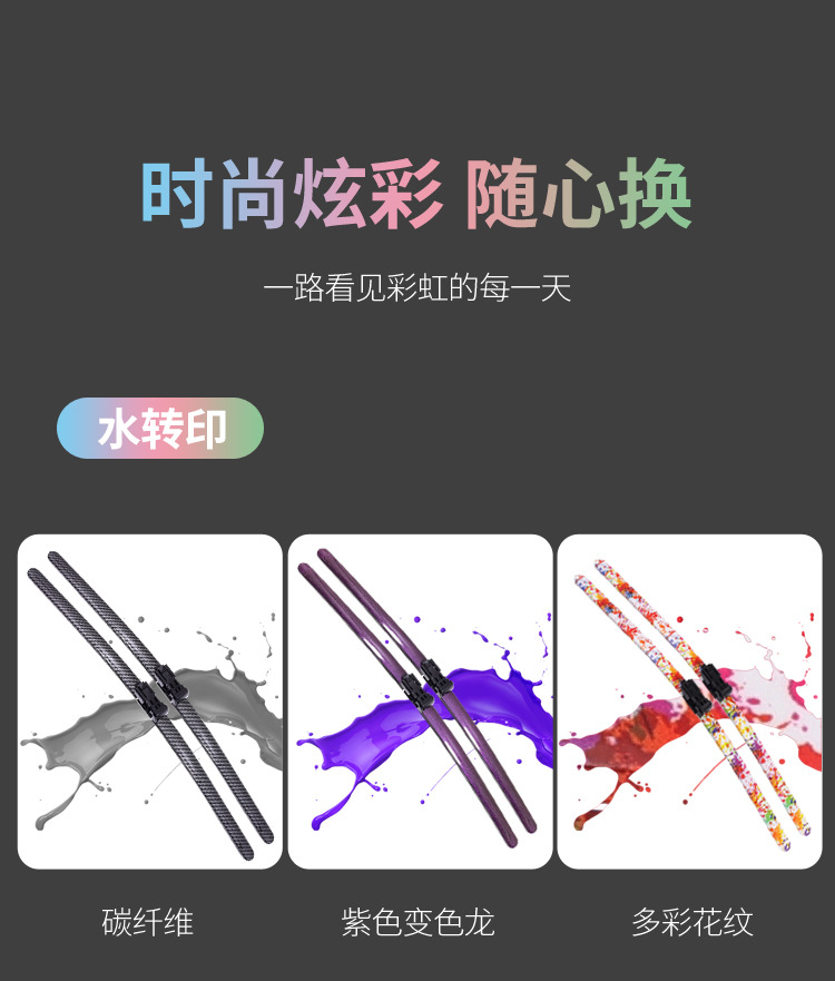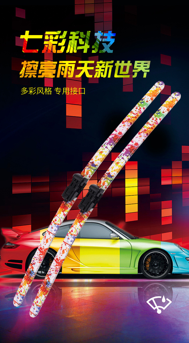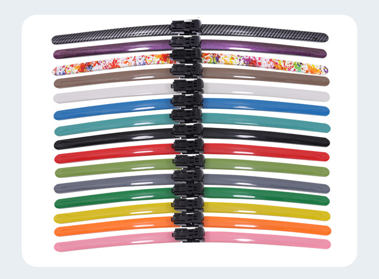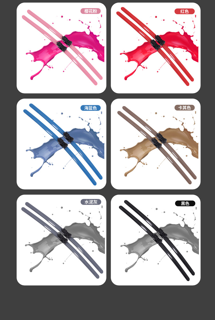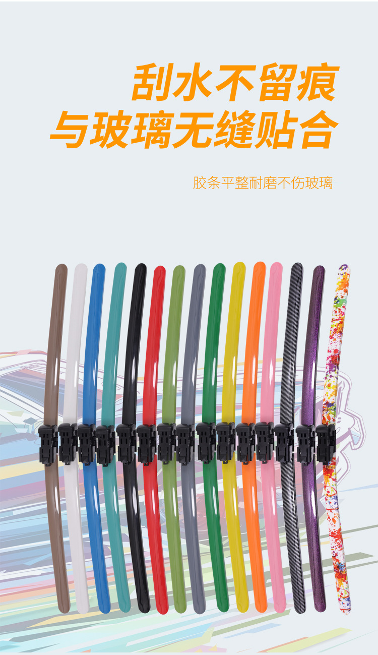 Wiper mobil grosir warna-warni, wiper universal tanpa bingkai yang senyap dan dapat dimodifikasi secara personal dalam warna ungu, putih, merah, biru, kuning, hijau, dan merah muda.