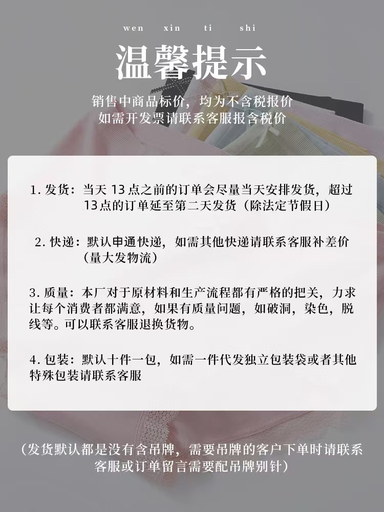 1.发货:当天16点之前订单会尽量发出 超出16点订单延至第二天发货(法定节假日除外) 2.快递:默认中通物流 如需其他请联系客服 3.质量:本厂对于原材料和生产过程都有严格把控 力求满足每个消费者的需求 如有质量问题(破洞 染色 脱线)请联系客服处理 4.包装:默认十件一包(不带吊牌) 需要吊牌或者独立包装或者盒装请联系客服改价备注 |